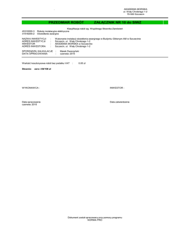 . AKADEMIA MORSKA ul. Wały Chrobrego 1-2 70-500 Szczecin PRZEDMIAR ROBÓT 45310000-3 31518200-2 Klasyfikacja robót wg. Wspólnego Słownika Zamówień Roboty instalacyjne elektryczne Oświetlenie awaryjne NAZWA INWESTYCJI ADRES INWESTYCJI INWESTOR ADRES INWESTORA : : : : SPORZĄDZIŁ KALKULACJE DATA OPRACOWANIA Wykonanie instalacji oświetlenia awaryjnego w Budynku Głównym AM w Szczecinie Szczecin, ul. Wały Chrobrego 1-2 AKADEMIA MORSKA w Szczecinie Szczecin, ul. Wały Chrobrego 1-2 : : Marek Dworzyński czerwiec 2015 Wartość kosztorysowa robót bez podatku VAT Słownie: ZAŁĄCZNIK NR 10 do SIWZ : 0.00 zł zero i 00/100 zł WYKONAWCA : INWESTOR : Data opracowania czerwiec 2015 Data zatwierdzenia Dokument został opracowany przy pomocy programu NORMA PRO PRZEDMIAR Zał. nr 10 do SIWZ PRZEDMIAR Oświetlenie awaryjne BG1 i BG2 Lp. Podstawa Opis i wyliczenia j.m. Oświetlenie awaryjne BG1 i BG2 1 KNR 4-03 Demontaż opraw świetlówkowych z rastrem z tworzyw sztucznych lub metalowym szt. 1134-01 20 szt. 2 KNR 4-03 1001-05 3 KNR 5-08 0201-04 4 KNR 5-08 0210-01 5 KNR 4-03 1014-01 6 KNR 4-03 1012-01 7 KNR 4-03 1006-21 8 KNR 5-08 0502-05 9 KNR 5-08 0504-08 10 KNR 7-08 0301-01 11 KNR 5-08 0210-01 12 KNR 4-01 1208-01 Ręczne wykucie bruzd dla przewodów wtynkowych w cegle m 400+1700+2000+250 m Montaż uchwytów pod przewody kabelkowe układane pojedynczo z przygotowaniem podłoża mechanicznie - przykręcanie do kołków wstrzeliwanych 400+1700+2000+250 m Przewody kabelkowe o łącznym przekroju żył do Cu-6/Al-12 mm2 układane w gotowych bruzdach bez zaprawiania bruzd na podłożu nie-betonowym 400+1700+2000+250 m Ręczne przygotowanie zaprawy cementowo-wapiennej m3 (400+1700+2000+450)*0.01*0.04 m3 Zaprawianie bruzd o szer. do 25 mm m 400+1700+2000+250 m m m Ręczne przebijanie otworów w ścianach lub stropach z cegły o długości przebicia otw. do 2 1/2 cegły - śr. rury do 25 mm 2*2*5+10*4+25 otw. Przygotowanie podłoża pod oprawy oświetleniowe przykręcane na cegle mocowa- kpl. ne na kołkach kotwiących (ilość mocowań 2) 294+8 kpl. Montaż z podłączeniem na gotowym podłożu opraw oświetleniowych żarowych bryzgo-, strugo-odpornych, porcelanowych przykręcanych, przelotowych 294+8 szt. Przewody kabelkowe o łącznym przekroju żył do Cu-6/Al-12 mm2 układane w gotowych bruzdach bez zaprawiania bruzd na podłożu nie-betonowym 2700 m Jednokrotne lakierowanie emalią olejną tynków m2 (400+1700+2000+250)*0.05 m2 m 13 wycena włas- ułozenie koryt kablowych u zbiegu przewodów, przebicia scian na 2 szt. 14 Wycena własna Pomiary natężenia oświetlenia szt. 400 szt. Norma PRO Wersja 4.50 Nr seryjny: 16502 Użytkownik: N. Dorywalska Razem 20.000 RAZEM 20.000 4350.000 RAZEM 4350.000 4350.000 RAZEM 4350.000 4350.000 RAZEM 4350.000 1.820 RAZEM 1.820 4350.000 RAZEM 4350.000 85.000 RAZEM 85.000 302.000 RAZEM 302.000 302.000 RAZEM 302.000 2.000 RAZEM 2.000 2700.000 RAZEM 2700.000 217.500 RAZEM 217.500 2.000 RAZEM 2.000 400.000 RAZEM 400.000 szt. Układy sterowania elektrycznego zespołem siłownik-układ kinematyczny-zawór re- ukl. gulacyjny ANALOGIA 2 ukl. -2- Poszcz. szt. SZCZEGÓŁOWE ZESTAWIENIE MATERIAŁÓW PRZEDMIAR Oświetlenie awaryjne BG1 i BG2 L p. Nazwa 1. cement portlandzki zwykły bez dodatków 35 pozycja kosztorysu 5 2. CENTRALNA BATERIA pozycja kosztorysu 10 3. ciasto wapienne (wapno gaszone) pozycja kosztorysu 5 4. emalia ftalowa pozycja kosztorysu 12 5. kołki kotwiące pozycja kosztorysu 8 6. konstrukcja wsporcza o masie do 100 kg pozycja kosztorysu 10 7. koryta kablowe kompletne pozycja kosztorysu 13 8. kotwa gwoździowa (ATESTOWANA) pozycja kosztorysu 3 9. oprawy AWARYJNE pozycja kosztorysu 9 10. papier ścierny w arkuszach pozycja kosztorysu 12 11. piasek do betonów zwykłych pozycja kosztorysu 5 12. przewody kabelkowe HDGs 3x2,5 mm2 pozycja kosztorysu 4 Jm Przedmiar Norma t 1.820 m3 0.191 t/m3 0.3476 0.00 szt. 2.000 ukl. 1 szt./ukl. 2.0000 0.00 m3 1.820 m3 0.16 m3/m3 0.2912 0.00 dm3 217.500 0.0807 dm3/ m2 m2 17.5523 0.00 szt. 302.000 kpl. 2 szt./kpl. 604.0000 0.00 kg 2.000 ukl. 83.2 kg/ukl. 166.4000 0.00 m 2.000 szt. szt. 4350.000 m 10 m/szt. Ilość Zał. nr 10 do SIWZ 20.0000 2.97 szt./m 12919.50 00 Cena jedn. 0.00 0.00 szt. 302.000 1.02 szt./szt. 308.0400 szt. 0.00 ark 217.500 0.133 ark/m2 m2 28.9275 0.00 2.0020 0.00 m3 1.820 m3 1.1 m3/m3 m 4350.000 m 1.04 m/m 4524.000 0 0.00 13. przewody kabelkowe ytksy 3X2X0,5 pozycja kosztorysu 11 m 2700.000 m 1.04 m/m 2808.000 0 0.00 14. rozcieńczalnik do wyrobów lakierowych pozycja kosztorysu 12 dm3 15. uchwyt pozycja kosztorysu 10 16. uchwyt montażowy do HDGs (ATESTOWANY) pozycja kosztorysu 3 17. materiały pomocnicze pozycja kosztorysu 3 pozycja kosztorysu 4 pozycja kosztorysu 5 pozycja kosztorysu 8 pozycja kosztorysu 9 pozycja kosztorysu 10 pozycja kosztorysu 11 pozycja kosztorysu 12 Razem: 217.500 0.0109 dm3/ m2 m2 szt 2.000 ukl. szt. 4350.000 m 1 szt/ukl. 2.3708 0.00 2.0000 0.00 2.7 szt./m 11745.00 00 zł zł zł zł zł zł zł zł zł 0.00 0.00 0.00 0.00 0.00 0.00 0.00 0.00 0.00 RAZEM Słownie: zero i 00/100 zł -3- Norma PRO Wersja 4.50 Nr seryjny: 16502 Użytkownik: N. Dorywalska Wartość DoCeRa- Rastaw- na do- bat bat ca stawzacy ma stoksy- soma walny ny SZCZEGÓŁOWE ZESTAWIENIE SPRZĘTU Zał. nr 10 do SIWZ PRZEDMIAR Oświetlenie awaryjne BG1 i BG2 Lp. Nazwa 1. samochód dostawczy 0.9 t pozycja kosztorysu 10 2. spawarka elektryczna wirująca 300 A pozycja kosztorysu 10 Jm Słownie: zero i 00/100 zł -4- Norma PRO Wersja 4.50 Nr seryjny: 16502 Użytkownik: N. Dorywalska Ilość Cena jedn. m-g 6.3000 0.00 m-g 3.9000 0.00 RAZEM Wartość