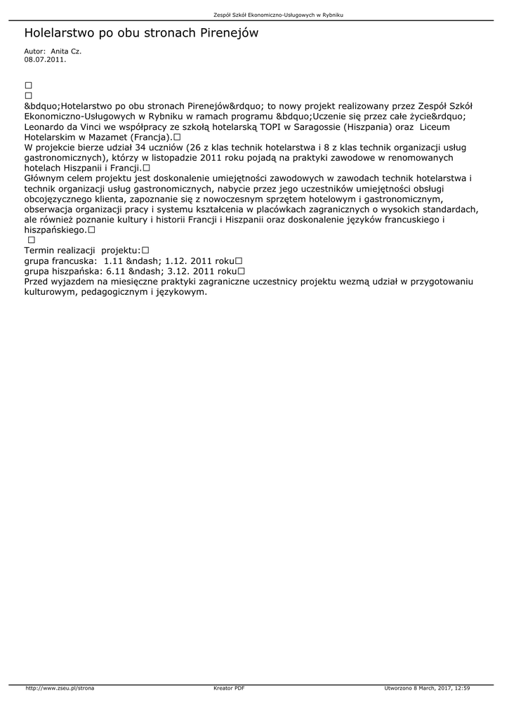 Zespół Szkół Ekonomiczno-Usługowych w Rybniku Holelarstwo po obu stronach Pirenejów Autor: Anita Cz. 08.07.2011. „Hotelarstwo po obu stronach Pirenejów” to nowy projekt realizowany przez Zespół Szkół Ekonomiczno-Usługowych w Rybniku w ramach programu „Uczenie się przez całe życie” Leonardo da Vinci we współpracy ze szkołą hotelarską TOPI w Saragossie (Hiszpania) oraz Liceum Hotelarskim w Mazamet (Francja). W projekcie bierze udział 34 uczniów (26 z klas technik hotelarstwa i 8 z klas technik organizacji usług gastronomicznych), którzy w listopadzie 2011 roku pojadą na praktyki zawodowe w renomowanych hotelach Hiszpanii i Francji. Głównym celem projektu jest doskonalenie umiejętności zawodowych w zawodach technik hotelarstwa i technik organizacji usług gastronomicznych, nabycie przez jego uczestników umiejętności obsługi obcojęzycznego klienta, zapoznanie się z nowoczesnym sprzętem hotelowym i gastronomicznym, obserwacja organizacji pracy i systemu kształcenia w placówkach zagranicznych o wysokich standardach, ale również poznanie kultury i historii Francji i Hiszpanii oraz doskonalenie języków francuskiego i hiszpańskiego. Termin realizacji projektu: grupa francuska: 1.11 – 1.12. 2011 roku grupa hiszpańska: 6.11 – 3.12. 2011 roku Przed wyjazdem na miesięczne praktyki zagraniczne uczestnicy projektu wezmą udział w przygotowaniu kulturowym, pedagogicznym i językowym. http://www.zseu.pl/strona Kreator PDF Utworzono 8 March, 2017, 12:59