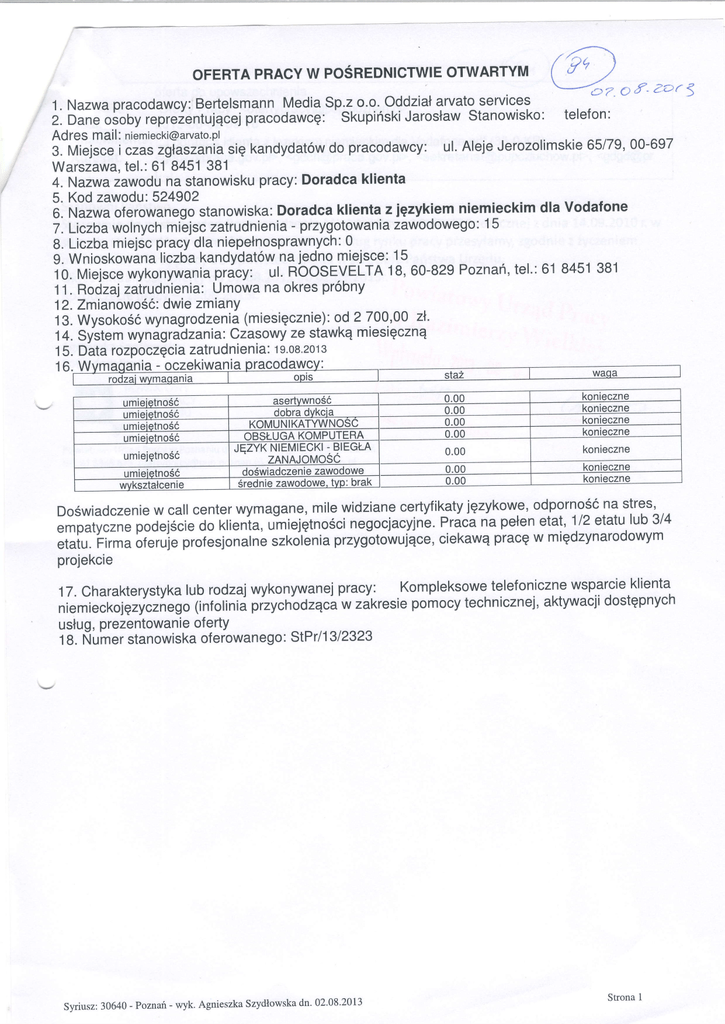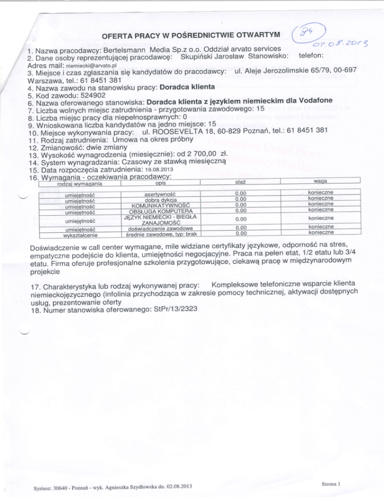 OTWARTYM OFERTAPRACYW POSREDNICTWIE c,f. zor 3 arvatoservices o.9..Oddzial MediaSp:4 Bertelsmann 'skupifski 1. Nazwapracodawcy: JarostawStanowisko:telefon: pracodawca: repr#entujqcej Z. OineoSony Adres mail : [email protected] 65/79,00-697 3. Miejscei czasrgi"itini" sig kandydat6wdo pracodawcy: ul. AlejeJerozolimskie tel.:61 8451381 Warszawa, 4. Nazwazawoduna stanowiskupracy:Doradcaklienta 5. Kod zawodu:524902 stanowiska:Doradcaklientaz jgzykiemniemieckimdla Vodafone 6. Nazwaoferowanego - przygotowania 15 zawodowego: miejsczatrudnienia 7. Liczbawolnych 8. Liczbamiejscpracydla niepelnosprawnych' I . na jednomiejsce:15 kandydat6w 9. Wnioskowana'liczba pracy: ut.nbOSfVELTA 18,60-829Poznafi,tel.:61 8451381 io. tvti.i.." wytoonywania Umowana okrespr6bny 11.Rodzajzairudnienia: dwie zmiany 12. Zmianowo66: zl' od 27.00.,00 (miesigcznie): wynagrodzenia 13.Wysoko6c 14. Systemwynigradzania:Czasowyze stawkqmiesiqcznq ts.os.zots zatrudnienia: 15. DatarozpoczQcia rwanta ta16. jqzykowe,odporno6cna stres, w callcenterwymagane,milewidzianecertyfikaty Doswiadczenie Pracana pelenetat,l 12etalulub 3/4 negocjacyjn-e. podejScie do klienia,umieigtnoSci empatyczne ciekawqpracAw migdzynarodowym szkolbniaprzygotowujqce, etatu.Firmaoferujeprofesjonalne projekcie wsparcieklienta telefoniczne pracy: Kompleksowe lub rodzajwykonywanej 17. Charakterystyka aktywacjidostqpnych zikresie pomocytechnicznej, (infoliniaprzychodzEca'w niemiecko iqzycznego ofertY uslug,prezentowanie StPri1312323 oferowanego: 18. Nuher stanowiska Syriusz:30640- Poznair- wyk. AgnieszkaSzydlowskadn' 02'08'2013 Strona1