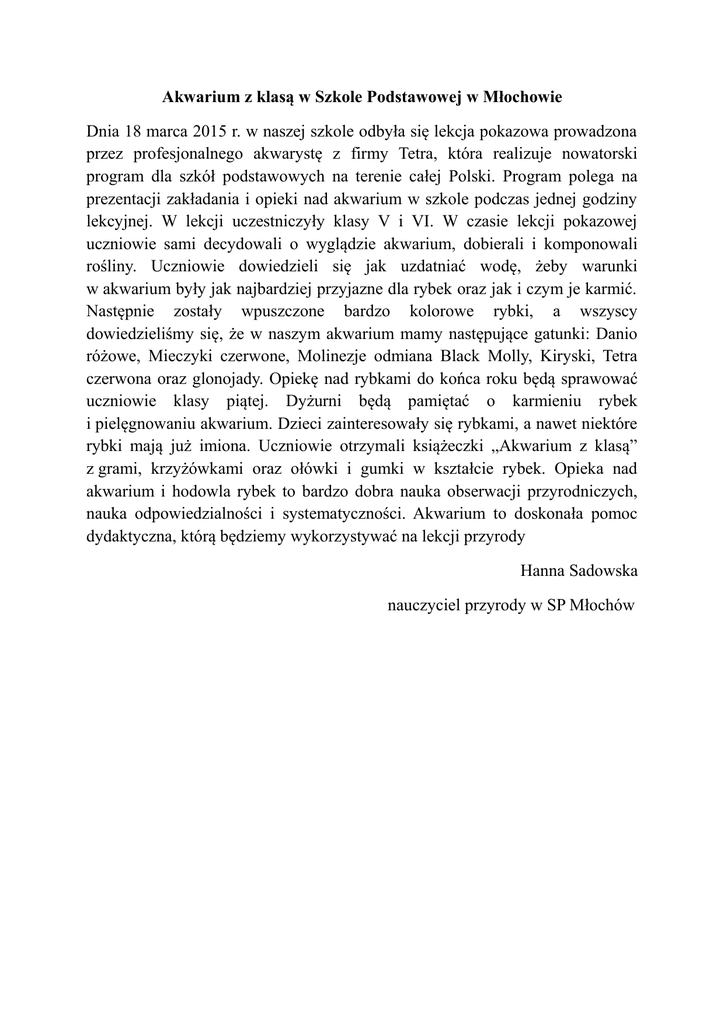 Akwarium z klasą w Szkole Podstawowej w Młochowie Dnia 18 marca 2015 r. w naszej szkole odbyła się lekcja pokazowa prowadzona przez profesjonalnego akwarystę z firmy Tetra, która realizuje nowatorski program dla szkół podstawowych na terenie całej Polski. Program polega na prezentacji zakładania i opieki nad akwarium w szkole podczas jednej godziny lekcyjnej. W lekcji uczestniczyły klasy V i VI. W czasie lekcji pokazowej uczniowie sami decydowali o wyglądzie akwarium, dobierali i komponowali rośliny. Uczniowie dowiedzieli się jak uzdatniać wodę, żeby warunki w akwarium były jak najbardziej przyjazne dla rybek oraz jak i czym je karmić. Następnie zostały wpuszczone bardzo kolorowe rybki, a wszyscy dowiedzieliśmy się, że w naszym akwarium mamy następujące gatunki: Danio różowe, Mieczyki czerwone, Molinezje odmiana Black Molly, Kiryski, Tetra czerwona oraz glonojady. Opiekę nad rybkami do końca roku będą sprawować uczniowie klasy piątej. Dyżurni będą pamiętać o karmieniu rybek i pielęgnowaniu akwarium. Dzieci zainteresowały się rybkami, a nawet niektóre rybki mają już imiona. Uczniowie otrzymali książeczki „Akwarium z klasą” z grami, krzyżówkami oraz ołówki i gumki w kształcie rybek. Opieka nad akwarium i hodowla rybek to bardzo dobra nauka obserwacji przyrodniczych, nauka odpowiedzialności i systematyczności. Akwarium to doskonała pomoc dydaktyczna, którą będziemy wykorzystywać na lekcji przyrody Hanna Sadowska nauczyciel przyrody w SP Młochów