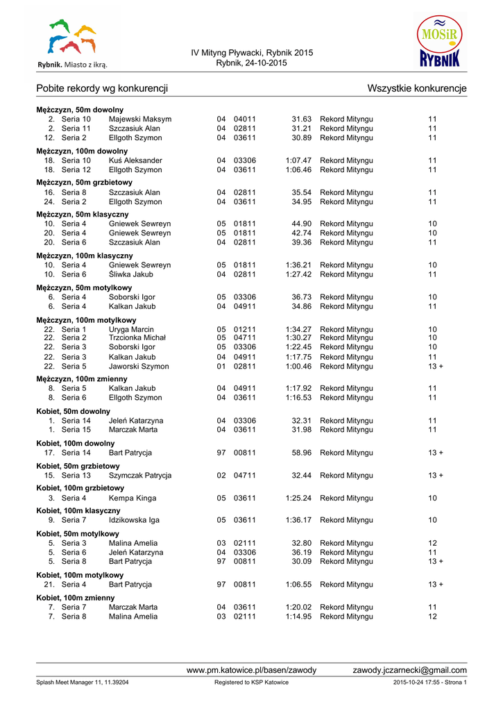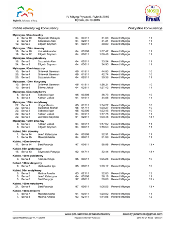 IV Mityng Pływacki, Rybnik 2015 Rybnik, 24-10-2015 Pobite rekordy wg konkurencji Wszystkie konkurencje Mężczyzn, 50m dowolny 2. Seria 10 Majewski Maksym 2. Seria 11 Szczasiuk Alan 12. Seria 2 Ellgoth Szymon 04 04 04 04011 02811 03611 31.63 31.21 30.89 Rekord Mityngu Rekord Mityngu Rekord Mityngu 11 11 11 Mężczyzn, 100m dowolny 18. Seria 10 Kuś Aleksander 18. Seria 12 Ellgoth Szymon 04 04 03306 03611 1:07.47 1:06.46 Rekord Mityngu Rekord Mityngu 11 11 Mężczyzn, 50m grzbietowy 16. Seria 8 Szczasiuk Alan 24. Seria 2 Ellgoth Szymon 04 04 02811 03611 35.54 34.95 Rekord Mityngu Rekord Mityngu 11 11 Mężczyzn, 50m klasyczny 10. Seria 4 Gniewek Sewreyn 20. Seria 4 Gniewek Sewreyn 20. Seria 6 Szczasiuk Alan 05 05 04 01811 01811 02811 44.90 42.74 39.36 Rekord Mityngu Rekord Mityngu Rekord Mityngu 10 10 11 Mężczyzn, 100m klasyczny 10. Seria 4 Gniewek Sewreyn 10. Seria 6 Śliwka Jakub 05 04 01811 02811 1:36.21 1:27.42 Rekord Mityngu Rekord Mityngu 10 11 Mężczyzn, 50m motylkowy 6. Seria 4 Soborski Igor 6. Seria 4 Kalkan Jakub 05 04 03306 04911 36.73 34.86 Rekord Mityngu Rekord Mityngu 10 11 Mężczyzn, 100m motylkowy 22. Seria 1 Uryga Marcin 22. Seria 2 Trzcionka Michał 22. Seria 3 Soborski Igor 22. Seria 3 Kalkan Jakub 22. Seria 5 Jaworski Szymon 05 05 05 04 01 01211 04711 03306 04911 02811 1:34.27 1:30.27 1:22.45 1:17.75 1:00.46 Rekord Mityngu Rekord Mityngu Rekord Mityngu Rekord Mityngu Rekord Mityngu 10 10 10 11 13 + Mężczyzn, 100m zmienny 8. Seria 5 Kalkan Jakub 8. Seria 6 Ellgoth Szymon 04 04 04911 03611 1:17.92 1:16.53 Rekord Mityngu Rekord Mityngu 11 11 Kobiet, 50m dowolny 1. Seria 14 Jeleń Katarzyna 1. Seria 15 Marczak Marta 04 04 03306 03611 32.31 31.98 Rekord Mityngu Rekord Mityngu 11 11 Kobiet, 100m dowolny 17. Seria 14 Bart Patrycja 97 00811 58.96 Rekord Mityngu 13 + Kobiet, 50m grzbietowy 15. Seria 13 Szymczak Patrycja 02 04711 32.44 Rekord Mityngu 13 + Kobiet, 100m grzbietowy 3. Seria 4 Kempa Kinga 05 03611 1:25.24 Rekord Mityngu 10 Kobiet, 100m klasyczny 9. Seria 7 Idzikowska Iga 05 03611 1:36.17 Rekord Mityngu 10 Kobiet, 50m motylkowy 5. Seria 3 Malina Amelia 5. Seria 6 Jeleń Katarzyna 5. Seria 8 Bart Patrycja 03 04 97 02111 03306 00811 32.80 36.19 30.09 Rekord Mityngu Rekord Mityngu Rekord Mityngu 12 11 13 + Kobiet, 100m motylkowy 21. Seria 4 Bart Patrycja 97 00811 1:06.55 Rekord Mityngu 13 + Kobiet, 100m zmienny 7. Seria 7 Marczak Marta 7. Seria 8 Malina Amelia 04 03 03611 02111 1:20.02 1:14.95 Rekord Mityngu Rekord Mityngu 11 12 www.pm.katowice.pl/basen/zawody Splash Meet Manager 11, 11.39204 Registered to KSP Katowice [email protected] 2015-10-24 17:55 - Strona 1
