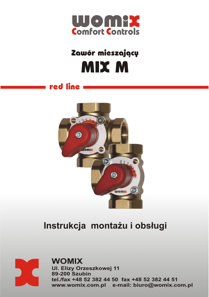 Comfort Controls Zawór mieszaj¹cy MIX M Instrukcja monta¿u i obs³ugi WOMIX Ul. Elizy Orzeszkowej 11 89-200 Szubin tel./fax +48 52 382 44 50 fax +48 52 382 44 51 www.womix.com.pl e-mail: [email protected] Wprowadzenie Dziêkujemy Pañstwu za zaufanie do naszej firmy oraz za dokonanie zakupu energooszczêdnego zaworu mieszaj¹cego MIX M firmy WOMIX. Produkt ten bêdzie s³u¿y³ Pañstwu przez lata i w znacznym stopniu wp³ynie na energooszczêdnoœæ ogrzewania. Zawór mieszaj¹cy MIX Trzydrogowy zawór mieszaj¹cy MIX M 3 znajduje zastosowanie w instalacjach centralnego ogrzewania. Poprzez zawór regulujemy temperaturê wody zasilaj¹cej instalacjê. Wymagan¹ temperaturê zasilania instalacji centralnego ogrzewania uzyskujemy poprzez zmieszanie ciep³ego (zasilaj¹cego z kot³a) z zimnym (powrotnego z instalacji) medium. Aby pompa nie pracowa³a od strony 100% zamkniêcia zaworu jedynym mo¿liwym sposobem monta¿u pompy jest strona zmieszanego czynnika. Zalet¹ zaworu mieszaj¹cego czterodrogowego MIX M 4 jest oprócz regulacji temperatury zasilaj¹cej instalacjê równie¿ podwy¿szanie temperatury medium powracaj¹cego do kot³a. Medium grzewcze jest mieszane z wod¹ powracaj¹c¹ z instalacji. Dziêki podwy¿szaniu temperatury powrotu kocio³ grzewczy jest dodatkowo zabezpieczony przed korozj¹. Dane techniczne Maksymalne ciœnienie pracy: Maksymalna temp. pracy: K¹t obrotu: Korpus, grzyb, pokrywa: Skala: Uszczelnienie wa³ka: Uszczelnienie pokrywy: R¹czka: Sposób przestawienia skali 10 bar 1100C 900 Mosi¹dz Aluminium EPDM - dwa O-ringi NBR plastik, czerwony Skalê mo¿na przestawiæ po wczeœniejszym odkrêceniu r¹czki za pomoc¹ klucza imbusowego. Przy pomocy klucza imbusowego nale¿y odkrêciæ dwie œruby M6. Po odkrêceniu mo¿emy przestawiæ skalê, po czym przykrêciæ j¹ ponownie do korpusu zaworu. Przestawienie skali nie powoduje rozszczelnienia zaworu. Schematy wymiarowe Mieszacz trzydrogowy Typ MIX M 3 - 20 MIX M 3 - 20 MIX M 3 - 20 MIX M 3 - 25 MIX M 3 - 25 MIX M 3 - 32 MIX M 3 - 32 MIX M 3 - 40 MIX M 3 - 50 Kv Rozmiar A B C D S M 4 6 8 8 12 12 18 28 44 50 50 50 50 50 50 50 70 70 35,4 35,4 35,4 35,4 35,4 35,4 35,4 49,9 49,5 18 18 18 20 20 25 25 27 27 32 32 32 40 40 50 50 55 70 6 80 6 80 6 80 6 82 6 82 6 87 6 87 6 97 6 107 3/4" 3/4" 3/4" 1” 1” 11/4” 11/4” 11/2” 2” 74 74 74 80 80 86 86 110 120 E Nr artyku³u 601001 601002 601003 601004 601005 601006 601007 601008 601009 Mieszacz czterodrogowy Typ MIX M 4 - 20 MIX M 4 - 25 MIX M 4 - 25 MIX M 4 - 32 MIX M 4 - 32 MIX M 4 - 40 MIX M 4 - 50 Konstrukcja zaworu mieszaj¹cego MIX M Kv Rozmiar A B C D S M 8 8 12 12 18 28 44 50 50 50 50 50 70 70 35,4 35,4 35,4 35,4 35,4 49,9 49,5 18 20 20 25 25 27 27 32 40 40 50 50 55 70 6 80 6 82 6 82 6 87 6 87 6 97 6 107 3/4" 1” 1” 11/4” 11/4” 11/2” 2” 74 80 80 86 86 110 120 E Nr artyku³u 602003 602004 602005 602006 602007 602008 602009 Przyk³ady zastosowañ trzydrogowego zaworu mieszaj¹cego Schematy instalacji i ustawienie skali Ustawienie fabryczne Widok grzybka zaworu Zawór 3-drogowy Zawór 4-drogowy Przyk³ady zastosowañ trzydrogowego zaworu mieszaj¹cego Schematy instalacji i ustawienie skali Ustawienie fabryczne