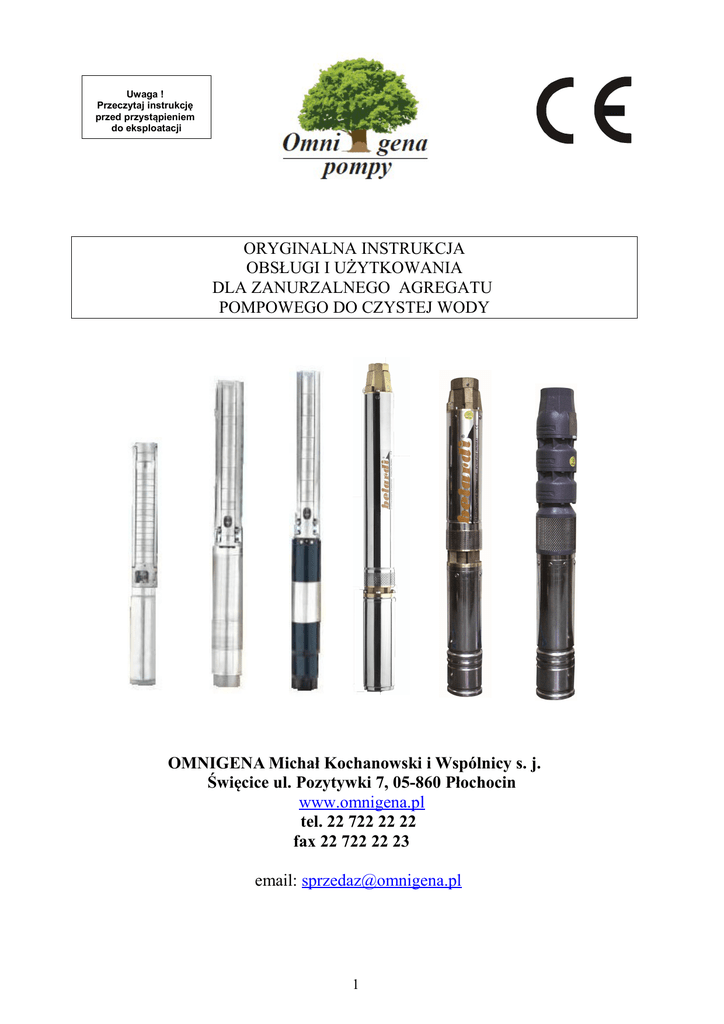 Uwaga ! Przeczytaj instrukcję przed przystąpieniem do eksploatacji ORYGINALNA INSTRUKCJA OBSŁUGI I UŻYTKOWANIA DLA ZANURZALNEGO AGREGATU POMPOWEGO DO CZYSTEJ WODY OMNIGENA Michał Kochanowski i Wspólnicy s. j. Święcice ul. Pozytywki 7, 05-860 Płochocin www.omnigena.pl tel. 22 722 22 22 fax 22 722 22 23 email: [email protected] 1 DEKLARACJA ZGODNOŚCI WE 06/2016 OMNIGENA Michał Kochanowski i Wspólnicy s. j. Święcice ul. Pozytywki 7, 05-860 Płochocin deklaruje z całą odpowiedzialnością, że: Pompy głębinowe typu: 4B, 4F, 4H, 4N, 4R, 4S, 6A, 6V, 6X, 6Z, 4SPO, 6SPO, 8SPO, 10SPO są zgodne z dokumentacją wytwórcy i spełniają zasadnicze wymagania bezpieczeństwa zawarte w dyrektywach: - maszynowej 2006/42/WE - kompatybilności elektromagnetycznej 2004/108/WE - niskonapięciowej 2006/95/WE - rozporządzenia Ministra Gospodarki z dn. 17 grudnia 2010r. w sprawie procedur oceny zgodności wyrobów wykorzystujących energię oraz ich oznakowania, dyrektywy Parlamentu Europejskiego i Rady 2009/125/WE Oraz są zgodne z normami zharmonizowanymi: PN-EN 809+A1:2009; PN-EN 12723:2004; PN-EN 60335-2-41:2005/A2:2010, EN 60335-2-51, EN 61000-6-1 : 2007, EN 61000-6-2 : 2005, EN 61000-6-3 : 2007, EN 61000-6-4 : 2007, EN 16297-1, EN 16297-2, EN 61800-5-1, EN 61800-3+A1:2012, PN-EN 60335-1:2004/A1:2005; PN-EN 60529:2003; PN-EN ISO 12100:201, PN-EN 61000-6-3:2008/A1:2011; PN-EN 55014-1:2007; PN-EN 61000-3-2:2007/A1:2010; PN-EN 61000-3-3:2011; PN-EN 60204-1:2010/AC:2011; Jakakolwiek zmiana wprowadzona do wyrobu unieważnia niniejszą deklarację. Osoba odpowiedzialna za przygotowanie i przechowywanie dokumentacji technicznej w siedzibie firmy: Katarzyna Kochanowska Data pierwszego umieszczenia oznakowania CE na wyrobie: 05 Model urządzenia:………………………………………………………………….. Numer seryjny urządzenia: …......................................................................... Producent Święcice 01 Czerwca 2016 2 WPROWADZENIE Dziękujemy za wybór pompy głębinowej oferowanej przez naszą firmę OMNIGENA. Mamy nadzieję że dzięki lekturze niniejszej instrukcji dokonacie Państwo wyboru właściwych parametrów pompy i będziecie obeznani z zasadami bezpieczeństwa podczas pracy z pompą oraz z jej parametrami technicznymi i z zasadami użytkowania urządzenia. Zanurzalny agregat pompowy składa się z dwóch zespołów: z części hydraulicznej zwanej dalej hydrauliką oraz silnika zanurzalnego zwanego dalej silnikiem. Oba zagregowane zespoły dalej będą nazywane pompą głębinową lub w skrócie pompą. NINIEJSZA INSTRUKCJA OBSŁUGI JEST nieodłączną częścią urządzenia i powinna zostać przekazana wraz z pompą podczas sprzedaży. W celu identyfikacji konkretnego modelu pompy sprzedawca jest zobowiązany do wpisania w deklaracji zgodności i karcie gwarancyjnej model oraz numer seryjny urządzenia, które znajdują się na tabliczce znamionowej. Numer seryjny zawiera rok produkcji pompy. Instrukcja opisuje budowę, parametry pomp, procedury obsługi, transportu, smarowania, konserwacji, inspekcji i regulacji. Pomoże ona operatorowi używać pompę wydajnie, ekonomicznie i bezbłędnie. Przed rozpoczęciem pracy należy dokładnie zapoznać się z prawidłowym doborem pompy i sposobem jej obsługi . W tym celu należy uważnie przeczytać niniejszą instrukcję obsługi i starannie wykonywać zalecone czynności. W przeciwnym razie może dojść do obrażeń ciała lub uszkodzenia sprzętu. Żywotność urządzenia, jak również wydajna i niezawodna praca w dużym stopniu zależy od obsługi i sposobu prowadzenia eksploatacji W przypadku zmiany przez użytkownika parametrów na odbiegające od oryginalnej specyfikacji fabrycznej lub gdy będą dokonane inne modyfikacje, gwarancja przestanie obowiązywać. UWAGA Niestosowanie się do zaleceń zawartych w instrukcji lub użytkowanie urządzenia niezgodnie z jego przeznaczeniem może spowodować cofnięcie gwarancji. Gwarancja nie będzie obejmować usterek spowodowanych wykonywaniem nieuprawnionych regulacji, nie uzgodnionych z producentem przeróbek, a także zastosowań niezgodnych z przeznaczeniem. SPIS TREŚCI: 1. Bezpieczeństwo....................................................................................…...…………………….....str.3 2. Transport i magazynowanie....................................................................……………………….....str.5 3. Zastosowanie. Informacje ogólne............................................................………………………....str.5 4. Ogólnie o doborze pomp........................................................................……………….………...str.15 5. Dobór silnika do hydrauliki....................................................................………………………...str.16 6. Montaż mechaniczny pompy głębinowej..............................................………………………....str.18 7. Podłączenie elektryczne........................................................................………………………….str.20 8. Uruchomienie, wyłączenie pompy........................................................………………………….str.21 9. Obsługa i konserwacja pompy..............................................................………………………….str.21 10. Zakłócenia w pracy, ich przyczyny, sposoby usuwania...................…………………………...str.22 11. Poziom hałasu.....................................................................................………………………….str.23 12. Utylizacja............................................................................................………………………….str.23 1. BEZPIECZEŃSTWO. 1.1 Informacje, które są oznaczane poniżej określonymi symbolami są bardzo istotne dla bezpieczeństwa użytkownika, montażu, eksploatacji i konserwacji pompy: – symbol za