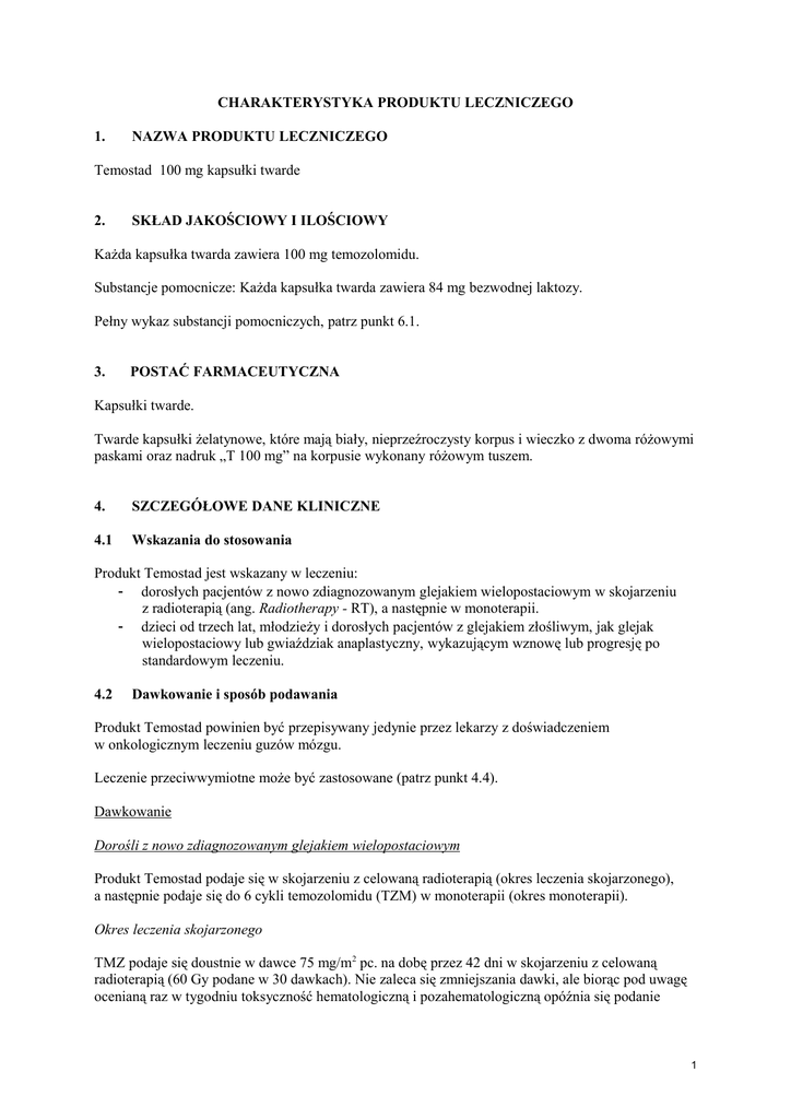 CHARAKTERYSTYKA PRODUKTU LECZNICZEGO 1. NAZWA PRODUKTU LECZNICZEGO Temostad 100 mg kapsułki twarde 2. SKŁAD JAKOŚCIOWY I ILOŚCIOWY Każda kapsułka twarda zawiera 100 mg temozolomidu. Substancje pomocnicze: Każda kapsułka twarda zawiera 84 mg bezwodnej laktozy. Pełny wykaz substancji pomocniczych, patrz punkt 6.1. 3. POSTAĆ FARMACEUTYCZNA Kapsułki twarde. Twarde kapsułki żelatynowe, które mają biały, nieprzeźroczysty korpus i wieczko z dwoma różowymi paskami oraz nadruk „T 100 mg” na korpusie wykonany różowym tuszem. 4. SZCZEGÓŁOWE DANE KLINICZNE 4.1 Wskazania do stosowania Produkt Temostad jest wskazany w leczeniu: - dorosłych pacjentów z nowo zdiagnozowanym glejakiem wielopostaciowym w skojarzeniu z radioterapią (ang. Radiotherapy - RT), a następnie w monoterapii. - dzieci od trzech lat, młodzieży i dorosłych pacjentów z glejakiem złośliwym, jak glejak wielopostaciowy lub gwiaździak anaplastyczny, wykazującym wznowę lub progresję po standardowym leczeniu. 4.2 Dawkowanie i sposób podawania Produkt Temostad powinien być przepisywany jedynie przez lekarzy z doświadczeniem w onkologicznym leczeniu guzów mózgu. Leczenie przeciwwymiotne może być zastosowane (patrz punkt 4.4). Dawkowanie Dorośli z nowo zdiagnozowanym glejakiem wielopostaciowym Produkt Temostad podaje się w skojarzeniu z celowaną radioterapią (okres leczenia skojarzonego), a następnie podaje się do 6 cykli temozolomidu (TZM) w monoterapii (okres monoterapii). Okres leczenia skojarzonego TMZ podaje się doustnie w dawce 75 mg/m2 pc. na dobę przez 42 dni w skojarzeniu z celowaną radioterapią (60 Gy podane w 30 dawkach). Nie zaleca się zmniejszania dawki, ale biorąc pod uwagę ocenianą raz w tygodniu toksyczność hematologiczną i pozahematologiczną opóźnia się podanie 1 kolejnej dawki lub zaprzestaje się podawania TMZ. Dawkę TMZ można kontynuować przez 42 dni w okresie leczenia skojarzonego (do 49 dni), jeśli spełnione są wszystkie wymienione warunki: - bezwzględna liczba granulocytów obojętnochłonnych (ang. Absolute Neutrophil Count ANC) ≥1,5 x 109/l - liczba płytek krwi ≥100 x 109/l - toksyczność pozahematologiczna według CTC (ang. Common Toxicity Criteria - CTC) ≤ Stopnia 1. (z wyjątkiem łysienia, nudności i wymiotów). Podczas leczenia należy raz w tygodniu wykonywać pełne badanie morfologii krwi. Należy czasowo przerwać lub całkowicie zaprzestać podawania TMZ w czasie leczenia skojarzonego, zgodnie z kryteriami toksyczności hematologicznej i pozahematologicznej podanymi w Tabeli 1. Tabela 1. Przerwanie lub zaprzestanie podawania TMZ w czasie leczenia skojarzonego radioterapią i TMZ Toksyczność Bezwzględna liczba granulocytów obojętnochłonnych Liczba płytek krwi Toksyczność pozahematologiczna wg CTC (z wyjątkiem łysienia, nudności i wymiotów) TMZ przerwaniea ≥ 0,5 i < 1,5 x 109 /l TMZ zaprzestanie < 0,5 x 109/l ≥ 10 i < 100 x 109 /l CTC Stopień 2. < 10 x 109/l CTC Stopień 3. lub 4. a : Leczenie skojarzone TMZ można kontynuować, gdy wszystkie z wymienionych warunków są spełnione: bezwzględna liczba granulocytów obojętnochłonnych ≥1,5 x 109/l; liczba płytek krwi ≥100 x 109/l; toksyczność pozahematologiczna wg CTC ≤ Stopnia 1. (z wyjątkiem łysienia, nudności i wymiotów). Okres monoterapii W cztery tygodnie po zakończeniu leczenia skojarzonego TMZ z RT, rozpoczyna się monoterapię TMZ, stosując do 6 cykli. W 1. cyklu monoterapii podaję się dawkę 150 mg/m2 pc. raz na dobę przez 5 dni, po których następuje 23-dniowa przerwa w podawaniu leku. Na początku 2. cyklu dawkę zwiększa się do 200 mg/m2 pc., jeśli toksyczność pozahematologiczna wg. CTC w czasie 1. cyklu była ≤ Stopniowi 2. (z wyjątkiem łysienia, nudności i wymiotów), bezwzględna liczba granulocytów obojętnochłonnych ≥1,5 x 109/l, i liczba płytek krwi ≥100 x 109/l. Jeśli nie zwiększono dawki w 2. cyklu, nie należy jej zwiększać w kolejnych cyklach. Raz zwiększona do 200 mg/m2 pc. na dobę dawka jest stosowana przez 5 pierwszych kolejnych dniach każdego następnego cyklu, o ile nie wystąpią działania toksyczne. W okresie monoterapii należy zmniejszać dawkę lub zaprzestać podawania produktu, kierując się wytycznymi zawartymi w Tabelach 2. i 3.. W czasie leczenia należy wykonać pełne badanie morfologii krwi w 22. dniu cyklu (21 dni po podaniu pierwszej dawki TMZ). Dawkę TMZ należy zmniejszyć lub zaprzestać podawania produktu, kierując się danymi podanymi w Tabeli 3. Tabela 2. Poziomy dawek TMZ w okresie monoterapii Poziom dawki –1 0 1 Dawka Uwagi (mg/m2 pc. /dobę) 100 Zmniejszenie z powodu wcześniejszej toksyczności 150 Dawka w czasie 1. cyklu 200 Dawka w czasie 2.-6. cyklu, jeśli brak toksyczność Tabela 3. Zmniejszenie dawki lub zaprzestanie leczenia TMZ w okresie monoterapii Toksyczność Zmniejszenie dawki TZM o Zaprzestanie 2 1 pozioma <1,0 x 109/l podawania TMZ patrz przypis b Bezwzględna liczba granulocytów obojętnochłonnych Liczba płytek krwi patrz przypis b <50 x 109/l Toksyczność pozahematologiczna wg Stopień 3. wg CTC Stopień 4b wg CTC CTC (z wyjątkiem łysienia, nudności i wymiotów) a : poziomy dawki TMZ są wymienione w Tabeli 2. b : należy zaprzestać podawania TMZ jeśli: • poziom dawki -1 (100 mg/m2 pc.) nadal powoduje nieakceptowalną toksyczność • po zmniejszeniu dawki pojawia się ten sam 3. Stopień toksyczności pozahematologicznej (z wyjątkiem łysienia, nudności i wymiotów). Dorośli pacjenci i dzieci w wieku 3 lat lub starsze z glejakiem złośliwym wykazującym wznowę lub progresję Cykl leczenia obejmuje 28 dni. Pacjentom nie podawanym wcześniej chemioterapii TMZ produkt podaje się doustnie w dawce 200 mg/m2 pc. raz na dobę przez pierwsze 5 dni, po których następuje 23-dniowa przerwa w leczeniu (w sumie 28 dni). U pacjentów poddawanych wcześniej chemioterapii początkowa dawka wynosi 150 mg/m2 pc. raz na dobę i może być zw