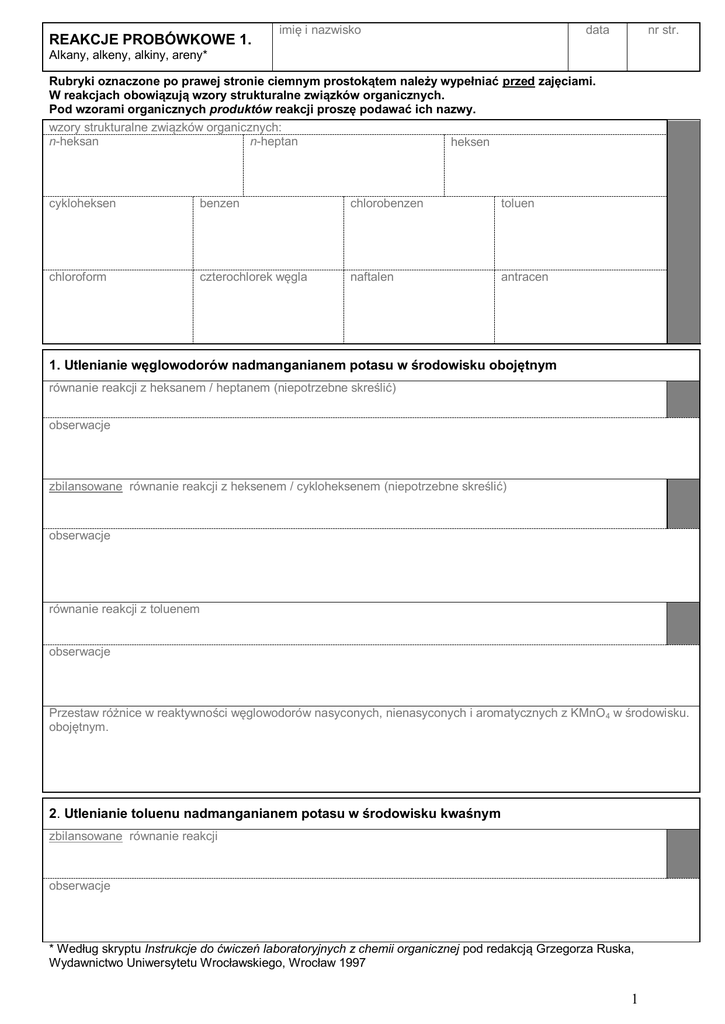 REAKCJE PROBÓWKOWE 1. imię i nazwisko data nr str. Alkany, alkeny, alkiny, areny* Rubryki oznaczone po prawej stronie ciemnym prostokątem należy wypełniać przed zajęciami. W reakcjach obowiązują wzory strukturalne związków organicznych. Pod wzorami organicznych produktów reakcji proszę podawać ich nazwy. wzory strukturalne związków organicznych: n-heksan n-heptan heksen cykloheksen benzen chlorobenzen toluen chloroform czterochlorek węgla naftalen antracen 1. Utlenianie węglowodorów nadmanganianem potasu w środowisku obojętnym równanie reakcji z heksanem / heptanem (niepotrzebne skreślić) obserwacje zbilansowane równanie reakcji z heksenem / cykloheksenem (niepotrzebne skreślić) obserwacje równanie reakcji z toluenem obserwacje Przestaw różnice w reaktywności węglowodorów nasyconych, nienasyconych i aromatycznych z KMnO 4 w środowisku. obojętnym. 2. Utlenianie toluenu nadmanganianem potasu w środowisku kwaśnym zbilansowane równanie reakcji obserwacje * Według skryptu Instrukcje do ćwiczeń laboratoryjnych z chemii organicznej pod redakcją Grzegorza Ruska, Wydawnictwo Uniwersytetu Wrocławskiego, Wrocław 1997 1 Jak węglowodory aromatyczne z alifatycznymi łańcuchami bocznymi reagują z KMnO4 w środowisku kwaśnym? 3. Reakcje węglowodorów z wodą bromową równanie reakcji z heksanem / heptanem (niepotrzebne skreślić) obserwacje zbilansowane równanie reakcji z heksenem / cykloheksenem (niepotrzebne skreślić) obserwacje równanie reakcji z toluenem obserwacje Przestaw różnice w reaktywności węglowodorów nasyconych, nienasyconych i aromatycznych z wodą bromową. 4. Reakcja toluenu z bromem w obecności katalizatora Reakcję można wykonywać tylko w rękawiczkach i po instruktażu prowadzącego. zbilansowane równanie reakcji w obecności opiłków żelaza obserwacje zbilansowane równanie reakcji w obecności światła obserwacje rola żelaza w reakcji nazwy powyższych reakcji jakiego rodzaju związki ulegają reakcji w obecności żelaza a jakie w obecności światła 5. Rozróżnianie węglowodorów aromatycznych w reakcji z CHCl3 i AlCl3. równanie reakcji z n-heksanem 2 obserwacje równanie reakcji z toluen obserwacje równanie reakcji z chlorobenzenem obserwacje równanie reakcji z naftalenem obserwacje równanie reakcji z antracenem obserwacje Jak nazywa się ta reakcja? rola AlCl3 3 W których pozycjach podstawione będą chlorobenzen, naftalen i antracen? Zaznacz strzałkami na wzorach strukturalnych i podaj numery lokantów. narysuj wzory strukturalne form barwnych dla produktu toluenu chlorobenzenu naftalenu antracenu data i podpis prowadzącego 4