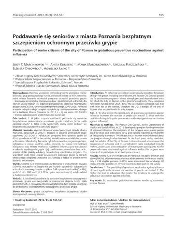 Marcinkowski Probl Hig Epidemiol JT i wsp.2013, Poddawanie 94(3): 555-561 się seniorów z miasta Poznania bezpłatnym szczepieniom ochronnym przeciwko grypie 555 Poddawanie się seniorów z miasta Poznania bezpłatnym szczepieniom ochronnym przeciwko grypie Participation of senior citizens of the city of Poznan in gratuitous preventive vaccinations against influenza Jerzy T. Marcinkowski 1,2/, Aneta Klimberg 1/, Maria Marcinkowska 3/, Urszula Piaszczyńska 4/, Elżbieta Dybowska 4/, Agnieszka Łysko 4/ Zakład Higieny, Katedra Medycyny Społecznej, Uniwersytet Medyczny im. Karola Marcinkowskiego w Poznaniu Wyższa Szkoła Bezpieczeństwa w Poznaniu – Bezpieczeństwo Zdrowotne 3/ Specjalistyczna Przychodnia Lekarska „Edictum”, Poznań 4/ Wydział Zdrowia i Spraw Społecznych, Urząd Miasta Poznania 1/ 2/ Wprowadzenie. Ponieważ szczepienia przeciwko grypie są szczególnie istotne dla osób z grup podwyższonego ryzyka, do których wlicza się m.in. seniorów, radni miasta Poznania uchwalali programy szczepień przeciwko grypie – skierowane do seniorów oraz pracowników i podopiecznych jednostek, dla których Miasto Poznań jest organem prowadzącym, które były finansowane począwszy od 2005 r., czyli od sezonu epidemicznego 2005/2006. Ponieważ w ocenie radnych ta akcja szczepień spotykała się z zainteresowaniem, dlatego też w budżecie Miasta Poznania na 2012 r. – tj. na sezon 2012/2013 – również zabezpieczono środki finansowe na ten cel. Cele badań. 1. W jakim stopniu możliwość poddania się seniorów bezpłatnemu zaszczepieniu przeciwko grypie zwiększa liczbę osób zaszczepionych? 2. Jakie cechy wyróżniały osoby, które poddały się bezpłatnemu zaszczepieniu przeciwko grypie? Materiał i metoda. Wydział Zdrowia i Spraw Społecznych Urzędu Miasta Poznania, opracował w 2012 r. program w zakresie profilaktyki grypy sezonowej 2012/2013. Adresatami programu były głównie osoby od 60 r.ż. (urodzone w 1952 r. i wcześniej) zameldowane na stałe lub czasowo w Poznaniu. Mieszkańcy Poznania byli informowani o programie poprzez: ogłoszenia w prasie lokalnej, radiu, telewizji, na stronie internetowej realizatora oraz Miasta Poznania. Działania informacyjno-edukacyjne w zakresie zapobiegania grypie i jej powikłaniom prowadzone były m.in. poprzez ulotki, plakaty, edukację bezpośrednią uczestników programu. Do wszystkich osób, które zostały zaszczepione przeciwko grypie w ramach omawianego programu, zwrócono się z prośbą o udział w anonimowym badaniu ankietowym. Wyniki. Spośród 123.548 mieszkańców Poznania w wieku 60 lat i powyżej (100%) zaszczepiło się bezpłatnie, po licznych uprzednich ogłoszeniach w środkach masowego przekazu, tylko 4.248 uprawnionych osób (3,43%); spośród nich 897 osób (21,11% ogółu zaszczepionych) wzięło udział w badaniu ankietowym. Wnioski. 1. Możliwość poddania się seniorów bezpłatnemu zaszczepieniu przeciwko grypie nie zwiększała w znaczącym stopniu liczby osób zaszczepionych. 2. Im wyższy poziom wykształcenia, tym większa skłonność do poddawania się bezpłatnemu zaszczepieniu przeciwko grypie. Introduction. As influenza vaccination is particularly important for people of high-risk groups, including senior citizens, the Poznan City Council passed the flu vaccination programs – aimed at employees and dependents of units for which the City of Poznan is the governing authority. These programs have been funded since 2005. Since the vaccination campaign was met with inter est of the seniors, therefore the 2012 budget of the city of Poznan also secured funds for this purpose. Aim. 1. To what extent the opportunity of gratuitous vaccination against influenza increases the number of people vaccinated? 2. What were the qualities distinguishing the persons who underwent gratuitous vaccination against influenza? Materials & methods. The Poznan City Council, at the Department of Health and Social Affairs, in 2012 developed a program for the prevention of seasonal influenza. The recipients of the program were mainly people aged 60 years and older (born 1952 and earlier) registered permanently or temporarily in Poznan. The inhabitants of Poznan were informed about the program through advertisements in the local press, radio, television, and the website of the City of Poznan. Information and education on the prevention of influenza and its complications were conducted through leaflets, posters and direct education of the program participants. All the people who were vaccinated against influenza within this program were requested to participate in an anonymous survey. Results. Among 123 548 inhabitants of Poznan at the age of 60 years and above (100%), after numerous previous advertisements in the mass media, only 4 248 eligible persons (3.43%) were immunized free of charge. Of these, only 897 people (21.11% of vaccinees) took part in the survey. Conclusions. 1. The possibility of gratuitous vaccination against influenza did not significantly increase the number of people vaccinated. 2. The higher the level of education, the greater the tendency to undergo the gratuitous vaccination against influenza. Key words: flu, vaccination, gratuitous vaccination, number of vaccinated, seniors, Poznan Słowa kluczowe: grypa, szczepienia, bezpłatne szczepienia, liczba zaszczepionych, seniorzy, Poznań © Probl Hig Epidemiol 2013, 94(3): 555-561 www.phie.pl Nadesłano: 10.07.2013 Zakwalifikowano do druku: 23.08.2013 Adres do korespondencji / Address for correspondence Prof. dr hab. Jerzy T. Marcinkowski Zakład Higieny, Uniwersytet Medyczny w Poznaniu ul. Rokietnicka 5”c”, 60-806 Poznań telefax 61 854-73-90, e-mail: [email protected] 556 Wprowadzenie Grypa rozprzestrzenia się łatwo, a zachorowania występują głównie w formie sezonowych epidemii lub pandemii przede wszystkim w miesiącach zimowych. Jest często lekceważona przez pacjentów, a błędnie utożsamiana z przeziębieniem może być przyc