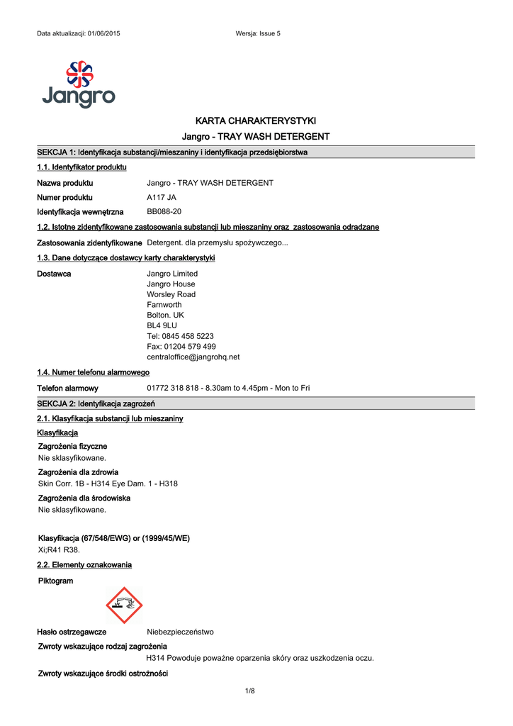 Data aktualizacji: 01/06/2015 Wersja: Issue 5 KARTA CHARAKTERYSTYKI Jangro - TRAY WASH DETERGENT SEKCJA 1: Identyfikacja substancji/mieszaniny i identyfikacja przedsiębiorstwa 1.1. Identyfikator produktu Nazwa produktu Jangro - TRAY WASH DETERGENT Numer produktu A117 JA Identyfikacja wewnętrzna BB088-20 1.2. Istotne zidentyfikowane zastosowania substancji lub mieszaniny oraz zastosowania odradzane Zastosowania zidentyfikowane Detergent. dla przemysłu spożywczego... 1.3. Dane dotyczące dostawcy karty charakterystyki Dostawca Jangro Limited Jangro House Worsley Road Farnworth Bolton. UK BL4 9LU Tel: 0845 458 5223 Fax: 01204 579 499 [email protected] 1.4. Numer telefonu alarmowego Telefon alarmowy 01772 318 818 - 8.30am to 4.45pm - Mon to Fri SEKCJA 2: Identyfikacja zagrożeń 2.1. Klasyfikacja substancji lub mieszaniny Klasyfikacja Zagrożenia fizyczne Nie sklasyfikowane. Zagrożenia dla zdrowia Skin Corr. 1B - H314 Eye Dam. 1 - H318 Zagrożenia dla środowiska Nie sklasyfikowane. Klasyfikacja (67/548/EWG) or (1999/45/WE) Xi;R41 R38. 2.2. Elementy oznakowania Piktogram Hasło ostrzegawcze Niebezpieczeństwo Zwroty wskazujące rodzaj zagrożenia H314 Powoduje poważne oparzenia skóry oraz uszkodzenia oczu. Zwroty wskazujące środki ostrożności 1/8 Data aktualizacji: 01/06/2015 Wersja: Issue 5 Jangro - TRAY WASH DETERGENT P102 Chronić przed dziećmi. P260 Nie wdychać mgły. P280 Stosować rękawice ochronne/odzież ochronną/ochronę oczu/ochronę twarzy. P301+P330+P331 W PRZYPADKU POŁKNIĘCIA: wypłukać usta. NIE wywoływać wymiotów. P303+P361+P353 W PRZYPADKU KONTATKU ZE SKÓRĄ (lub z włosami): Natychmiast zdjąć całą zanieczyszczoną odzież. Spłukać skórę pod strumieniem wody/prysznicem. P304+P340 W PRZYPADKU DOSTANIA SIĘ DO DRÓG ODDECHOWYCH: wyprowadzić lub wynieść poszkodowanego na świeże powietrze i zapewnić mu warunki do swobodnego oddychania. P305+P351+P338 W PRZYPADKU DOSTANIA SIĘ DO OCZU: Ostrożnie płukać wodą przez kilka minut. Wyjąć soczewki kontaktowe, jeżeli są i można je łatwo usunąć. Nadal płukać. P315 Natychmiast zasięgnąć porady/zgłosić się pod opiekę lekarza. P501 Zawartość/pojemnik usuwać zgodnie z lokalnymi przepisami. Zawiera SODIUM METASILICATE 2.3. Inne zagrożenia Produkt nie zawiera żadnych substancji sklasyfikowanych jako PBT lub vPvB. SEKCJA 3: Skład/informacja o składnikach 3.2. Mieszaniny 5-10% SODIUM METASILICATE Numer CAS: — Numer WE: — Klasyfikacja Klasyfikacja (67/548/EWG) or (1999/45/WE) Skin Corr. 1B - H314 C;R34. Xi;R36/38. Eye Dam. 1 - H318 1-3% TETRA SODIUM ETHYLENE DIAMINE TETRA ACETATE Numer CAS: 64-02-8 Numer WE: 200-573-9 Klasyfikacja Klasyfikacja (67/548/EWG) or (1999/45/WE) Acute Tox. 4 - H302 Xn;R22. Xi;R41. Acute Tox. 4 - H332 Eye Dam. 1 - H318 1-3% SODIUM CUMENE SULPHONATE Numer CAS: 32073-22-6 Numer WE: 250-913-5 Klasyfikacja Klasyfikacja (67/548/EWG) or (1999/45/WE) Eye Irrit. 2 - H319 Xi;R36. 0.1-1% FATTY ALCOHOL ALKOXYLATE 223 Numer CAS: — Numer WE: — Klasyfikacja Klasyfikacja (67/548/EWG) or (1999/45/WE) Skin Irrit. 2 - H315 Xi;R36/38. Eye Irrit. 2 - H319 <0.1% WODOROTLENEK SODU Numer CAS: 1310-73-2 Numer WE: 215-185-5 Numer rejestracji REACH: 01-2119457892-27-xxxx Klasyfikacja Klasyfikacja (67/548/EWG) or (1999/45/WE) Met. Corr. 1 - H290 C;R35 Skin Corr. 1A - H314 2/8 Data aktualizacji: 01/06/2015 Wersja: Issue 5 Jangro - TRAY WASH DETERGENT Pełny tekst zwrotów wskazujących rodzaj zagrożenia (zwrotów R) i określeń zagrożeń jest przedstawiony w sekcji 16. SEKCJA 4: Środki pierwszej pomocy 4.1. Opis środków pierwszej pomocy Wdychanie Mało prawdopodobna droga narażenia, gdyż produkt nie zawiera substancji lotnych. Jeśli wchłonięto rozpyloną ciecz/mgły, należy wykonać następujące czynności. Przenieść poszkodowanego na świeże powietrze i zapewnić ciepło i odpoczynek w pozycji umożliwiającej oddychanie. Połknięcie Nie wywoływać wymiotów. Dokładnie wypłukać usta wodą. Podać duże ilości wody do picia. Natychmiast wezwać pomoc medyczną. Kontakt ze skórą Umyć dużą ilością wody. Natychmiast zasięgnąć porady medycznej jeśli objawy utrzymują się po umyciu. Kontakt z oczami Natychmiast spłukać dużą ilością wody. Usunąć szkła kontaktowe i otworzyć szeroko powieki. Natychmiast wezwać pomoc medyczną. Kontynuować płukanie. 4.2. Najważniejsze ostre i opóźnione objawy oraz skutki narażenia Informacje ogólne Nasilenie opisanych objawów będzie różnić się w zależności od stężenia i czasu narażenia. Wdychanie Podrażnienie nosa, gardła i dróg oddechowych. Połknięcie Może powodować oparzenia chemiczne jamy ustnej i gardła. Kontakt ze skórą Piekący ból i poważne poparzenia skóry. Może powodować poważne poparzenia chemiczne skóry. Kontakt z oczami Poważne podrażnienie, pieczenie i łzawienie. Długotrwały kontakt powoduje poważne uszkodzenie oczu i tkanek. 4.3. Wskazania dotyczące wszelkiej natychmiastowej pomocy lekarskiej i szczególnego postępowania z poszkodowanym Wskazówki dla lekarza Leczyć objawowo. SEKCJA 5: Postępowanie w przypadku pożaru 5.1. Środki gaśnicze Odpowiednie środki gaśnicze Produkt nie jest łatwopalny. Używać środków gaśniczych odpowiednich dla palących się materiałów w najbliższym otoczeniu. 5.2. Szczególne zagrożenia związane z substancją lub mieszaniną Szczególne zagrożenia Produkty rozkładu termicznego lub spalania mogą zawierać następujące substancje: Drażniące gazy lub pary. 5.3. Informacje dla straży pożarnej Specjalny sprzęt ochronny dla strażaków Nosić aparat oddechowy z niezależnym dopływem powietrza i odpowiednie ubranie ochronne. SEKCJA 6: Postępowanie w przypadku niezamierzonego uwolnienia do środowiska 6.1. Indywidualne środki ostrożności, wyposażenie ochronne i procedury w sytuacjach awaryjnych Osobiste środki ostrożności Stosować odzież ochronną, rękawice ochronne oraz ochronę oczu i twarzy. Inf