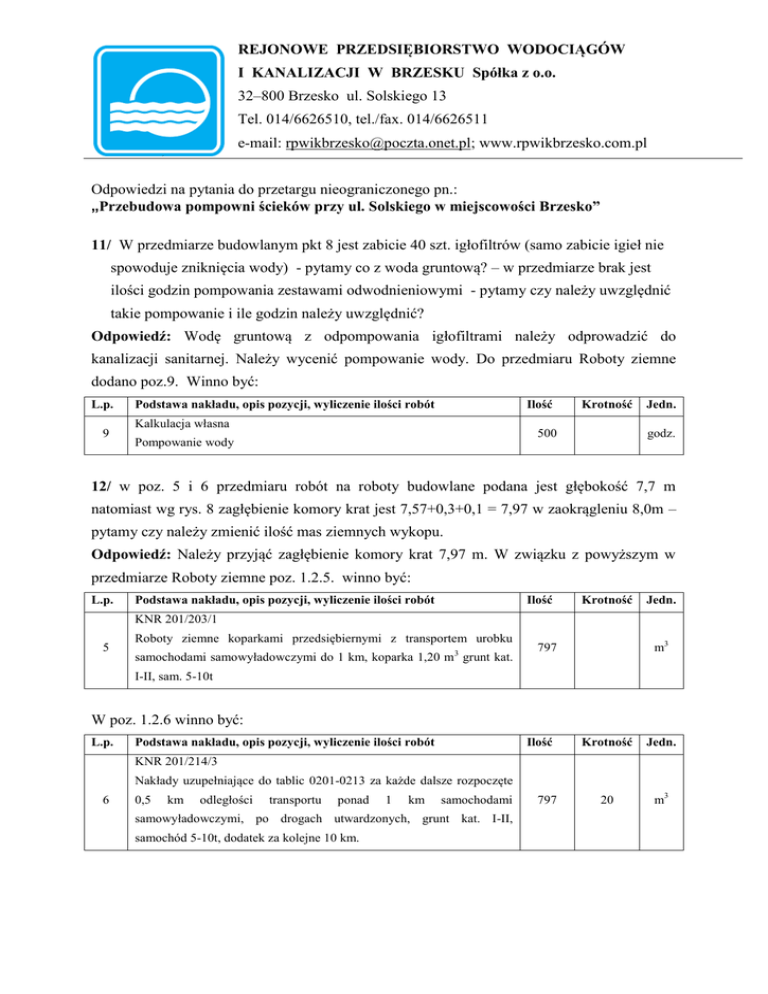 REJONOWE PRZEDSIĘBIORSTWO WODOCIĄGÓW I KANALIZACJI W BRZESKU Spółka z o.o. 32–800 Brzesko ul. Solskiego 13 Tel. 014/6626510, tel./fax. 014/6626511 e-mail: [email protected]; www.rpwikbrzesko.com.pl Odpowiedzi na pytania do przetargu nieograniczonego pn.: „Przebudowa pompowni ścieków przy ul. Solskiego w miejscowości Brzesko” 11/ W przedmiarze budowlanym pkt 8 jest zabicie 40 szt. igłofiltrów (samo zabicie igieł nie spowoduje zniknięcia wody) - pytamy co z woda gruntową? – w przedmiarze brak jest ilości godzin pompowania zestawami odwodnieniowymi - pytamy czy należy uwzględnić takie pompowanie i ile godzin należy uwzględnić? Odpowiedź: Wodę gruntową z odpompowania igłofiltrami należy odprowadzić do kanalizacji sanitarnej. Należy wycenić pompowanie wody. Do przedmiaru Roboty ziemne dodano poz.9. Winno być: L.p. 9 Podstawa nakładu, opis pozycji, wyliczenie ilości robót Ilość Kalkulacja własna Krotność 500 Pompowanie wody Jedn. godz. 12/ w poz. 5 i 6 przedmiaru robót na roboty budowlane podana jest głębokość 7,7 m natomiast wg rys. 8 zagłębienie komory krat jest 7,57+0,3+0,1 = 7,97 w zaokrągleniu 8,0m – pytamy czy należy zmienić ilość mas ziemnych wykopu. Odpowiedź: Należy przyjąć zagłębienie komory krat 7,97 m. W związku z powyższym w przedmiarze Roboty ziemne poz. 1.2.5. winno być: L.p. Podstawa nakładu, opis pozycji, wyliczenie ilości robót Ilość Krotność Jedn. KNR 201/203/1 5 Roboty ziemne koparkami przedsiębiernymi z transportem urobku 3 samochodami samowyładowczymi do 1 km, koparka 1,20 m grunt kat. m3 797 I-II, sam. 5-10t W poz. 1.2.6 winno być: L.p. Podstawa nakładu, opis pozycji, wyliczenie ilości robót Ilość Krotność Jedn. 20 m3 KNR 201/214/3 Nakłady uzupełniające do tablic 0201-0213 za każde dalsze rozpoczęte 6 0,5 km odległości transportu ponad 1 km samochodami samowyładowczymi, po drogach utwardzonych, grunt kat. I-II, samochód 5-10t, dodatek za kolejne 10 km. 797 13/ W opisie do planu zagospodarowania działki pkt III podpkt 2 pisze się o ścianie szczelnej Larsena, która zostaje wbudowana na stałe, natomiast w przedmiarze robót - roboty budowlane pkt 7 stosuje się wypraski. Pytamy czy należy zmienić KNR na zabijanie ścianek szczelnych, ponadto w przypadku ścianek szczelnych ścianka winna być wbijana co najmniej 1/3 głębiej od wykopu i powinna mieć rozpory by nie złożyć się – pytamy dalej czy należy zmienić obmiar i policzyć rozpory przynajmniej na dwóch poziomach (po środku i u góry) Odpowiedź: W celu umocnienia wykopu należy zastosować ścianki szczelne Larsena stosując przy tym rozpory na dwóch poziomach. Wykonawca powinien tak zabezpieczyć wykop aby zamontowane rozpory umożliwiały wykonanie konstrukcji żelbetowej. Ścianki szczelne należy pozostawić w gruncie po zakończeniu prac W poz. 7 przedmiaru Roboty ziemne należy wycenić umocnienie ścian wykopu ściankami szczelnymi Larsena. Winno być: L.p. Podstawa nakładu, opis pozycji, wyliczenie ilości robót Ilość Krotność Jedn. Kalkulacja własna. 7 Umocnienie ścian wykopu ściankami szczelnymi Larsena wraz z m2 320 rozporami i pozostawieniem ścianki szczelnej. 14/ Pytamy czego dotyczy rysunek nr 38; 39; 40 – budynku krat jak jest w opisie tabeli czy istniejącej pompowni jako ściana dzieląca pompownię ? Odpowiedź: W tabeli rysunku nr 38; 39; 40 wystąpiła omyłka pisarska. Rysunki dotyczą ściany dzielącej zbiornik pompowni. 15/ Po wizji lokalnej pytamy czy na pewno jest tylko do wybrania ze zbiornika 10m 3 przy zbiorniku średnicy 15 m jak ujęte jest w przedmiarze poz. 28 ( jest to ok. 6 cm grubości)? Odpowiedź: Należy przyjąć 150 m3. W związku z powyższym w poz. 28 d.2.1 przedmiaru branży technologiczno- sanitarnej winno być: Lp. Podst. Opis i wyliczenia 28 KNR Mechaniczne czyszczenie kanalizacji w obiektach d.2.1 4-05/0121/06 przemysłowych – zbiorniki zamknięte j.m. Poszcz. 3 m Razem 150,00 RAZEM 150,00 16/ Pytamy co z włazami na istniejącej remontowanej pompowni – zostają czy należy je demontować? Odpowiedź: Wszystkie włazy na remontowanej przepompowni należy wymienić na nowe ze stali gatunku min. 1.4301. Należy uwzględnić demontaż siedmiu włazów. Do działu 4.4 Reprofilacja zbiornika - płyta górna, dodaje się pozycję 189. Winno być: L.p. 189 Podstawa nakładu, opis pozycji, wyliczenie ilości robót Kalkulacja własna. Ilość 7 Krotność Jedn. szt. Demontaż włazów. 17/ Brak jest profilu i obmiaru w przedmiarze robót odcinka K-1 – SK2 – K5 – pytamy czy należy uwzględniać ten odcinek, jeśli tak to prosimy o uzupełnienie dokumentacji i przedmiaru. Odpowiedź: Odcinek K-1 – SK2 – Zbiornik jest odcinkiem istniejącym. 18/ Pytamy czy włazy stalowe montowane na remontowanej pompowni mają mieć zamknięcia oraz czy otwory istniejące będą wykorzystane do nowych włazów czy należy stare zabetonować i wykonać nowe ( brak grubości płyty przykrywającej)? Odpowiedź: Wszystkie włazy należy wyposażyć w zamknięcia oraz zabezpieczenia przed samoczynnym zamknięciem się pokrywy. Włazy montażowe pomp oraz kraty zabudować na istniejących otworach, natomiast włazy komunikacyjne przeznaczone również do zabudowy mieszadeł należy zabudować na nowy wykonanych otworach. 19/ Na rys. nr 22 istniejącej pompowni na zestawieniu materiałów jest do zamontowania zastawka kanałowa Dn 500 mm ze stali nierdzewnej i przejście szczelne natomiast w przedmiarach w dziale 2 modernizacja istniejącej pompowni nie uwzględniono – pytamy czy należy brakujące materiały uwzględnić? Jaka wysokość trzpienia musi byś zastosowana do zastawki? Odpowiedź: Tak należy uwzględnić zastawkę kanałową ze stali nierdzewnej DN 500. Wysokość trzpienia przyjąć 9,0 m. W przedmiarze branży technologiczno – sanitarnej dział 2.2. Roboty montażowe dodaje się poz. nr 57. Winno być: Lp. Podst. Opis i wyliczenia 57 Kalkulacja M
