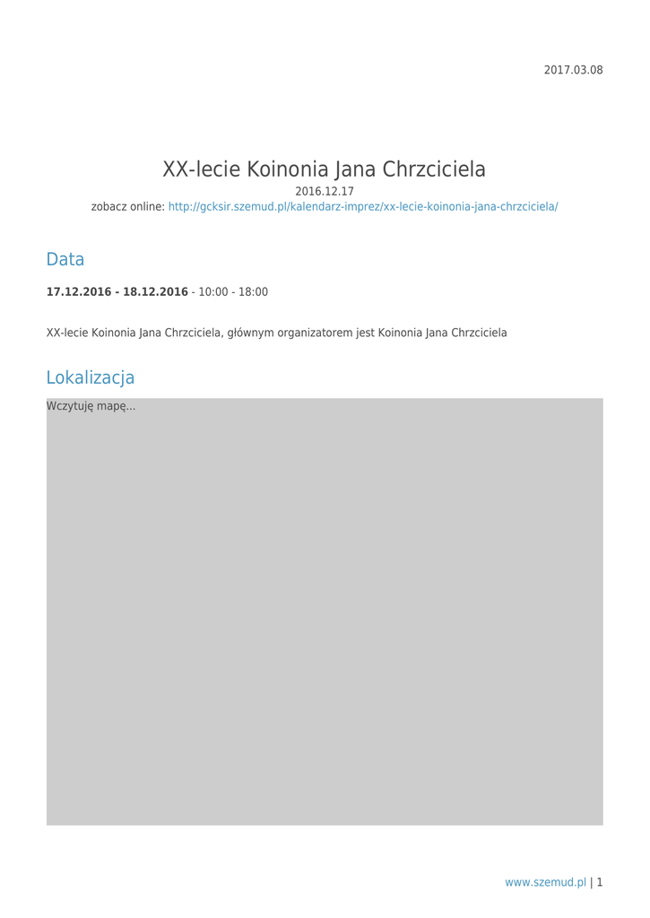 2017.03.08 XX-lecie Koinonia Jana Chrzciciela 2016.12.17 zobacz online: http://gcksir.szemud.pl/kalendarz-imprez/xx-lecie-koinonia-jana-chrzciciela/ Data 17.12.2016 - 18.12.2016 - 10:00 - 18:00 XX-lecie Koinonia Jana Chrzciciela, głównym organizatorem jest Koinonia Jana Chrzciciela Lokalizacja Wczytuję mapę... www.szemud.pl | 1