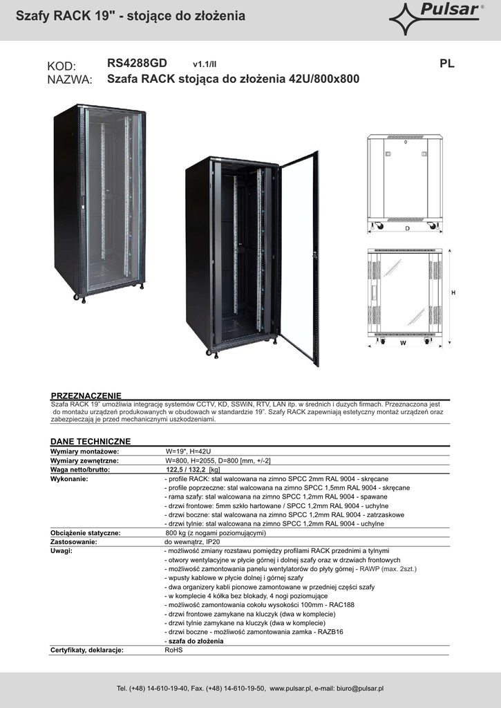 Szafy RACK 19" - stojące do złożenia KOD: NAZWA: RS4288GD v1.1/II Szafa RACK stojąca do złożenia 42U/800x800 Pulsar PL PRZEZNACZENIE Szafa RACK 19” umożliwia integrację systemów CCTV, KD, SSWiN, RTV, LAN itp. w średnich i duzych firmach. Przeznaczona jest do montażu urządzeń produkowanych w obudowach w standardzie 19”. Szafy RACK zapewniają estetyczny montaż urządzeń oraz zabezpieczają je przed mechanicznymi uszkodzeniami. DANE TECHNICZNE Wymiary montażowe: Wymiary zewnętrzne: Waga netto/brutto: Wykonanie: Obciążenie statyczne: Zastosowanie: Uwagi: Certyfikaty, deklaracje: W=19", H=42U W=800, H=2055, D=800 [mm, +/-2] 122,5 / 132,2 [kg] - profile RACK: stal walcowana na zimno SPCC 2mm RAL 9004 - skręcane - profile poprzeczne: stal walcowana na zimno SPCC 1,5mm RAL 9004 - skręcane - rama szafy: stal walcowana na zimno SPCC 1,2mm RAL 9004 - spawane - drzwi frontowe: 5mm szkło hartowane / SPCC 1,2mm RAL 9004 - uchylne - drzwi boczne: stal walcowana na zimno SPCC 1,2mm RAL 9004 - zatrzaskowe - drzwi tylnie: stal walcowana na zimno SPCC 1,2mm RAL 9004 - uchylne 800 kg (z nogami poziomującymi) do wewnątrz, IP20 - możliwość zmiany rozstawu pomiędzy profilami RACK przednimi a tylnymi - otwory wentylacyjne w płycie górnej i dolnej szafy oraz w drzwiach frontowych - możliwość zamontowania panelu wentylatorów do płyty górnej - RAWP (max. 2szt.) - wpusty kablowe w płycie dolnej i górnej szafy - dwa organizery kabli pionowe zamontowane w przedniej części szafy - w komplecie 4 kółka bez blokady, 4 nogi poziomujące - możliwość zamontowania cokołu wysokości 100mm - RAC188 - drzwi frontowe zamykane na kluczyk (dwa w komplecie) - drzwi tylnie zamykane na kluczyk (dwa w komplecie) - drzwi boczne - możliwość zamontowania zamka - RAZB16 - szafa do złożenia RoHS Tel. (+48) 14-610-19-40, Fax. (+48) 14-610-19-50, www.pulsar.pl, e-mail: [email protected] ®