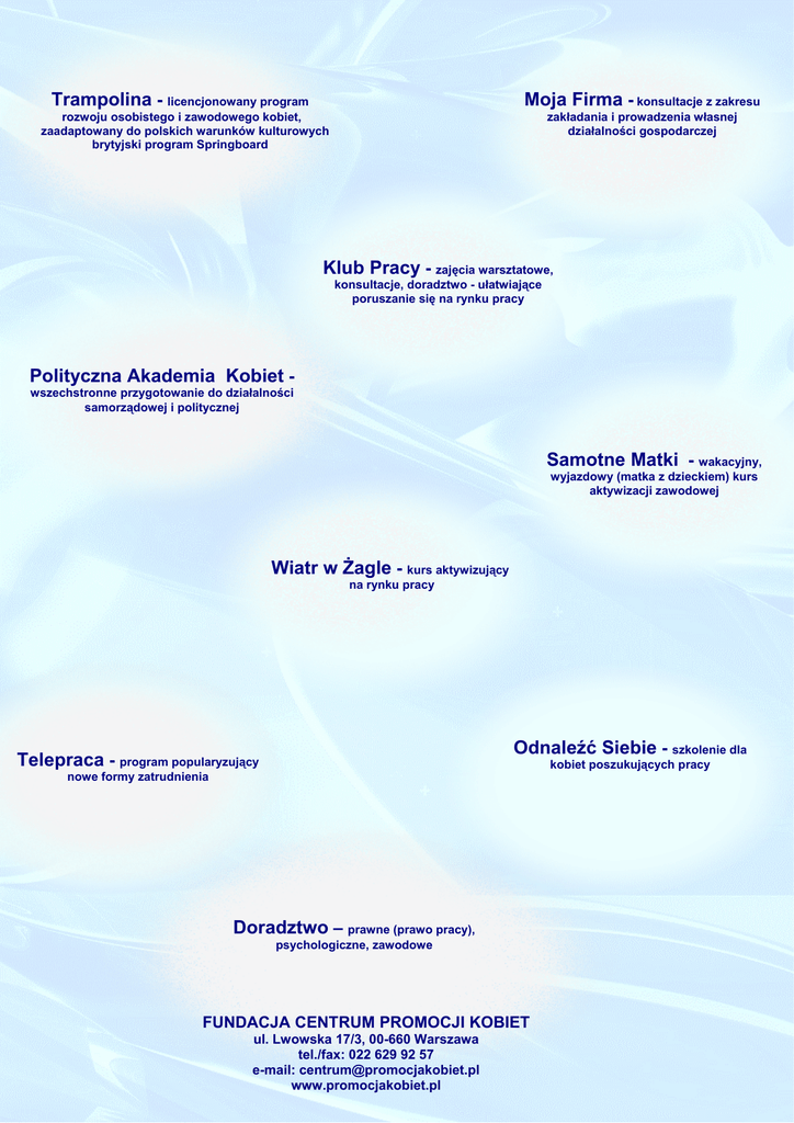 Trampolina - licencjonowany program Moja Firma - konsultacje z zakresu rozwoju osobistego i zawodowego kobiet, zaadaptowany do polskich warunków kulturowych brytyjski program Springboard zakładania i prowadzenia własnej działalności gospodarczej Klub Pracy - zajęcia warsztatowe, konsultacje, doradztwo - ułatwiające poruszanie się na rynku pracy Polityczna Akademia Kobiet wszechstronne przygotowanie do działalności samorządowej i politycznej Samotne Matki - wakacyjny, wyjazdowy (matka z dzieckiem) kurs aktywizacji zawodowej Wiatr w Żagle - kurs aktywizujący na rynku pracy Odnaleźć Siebie - szkolenie dla Telepraca - program popularyzujący kobiet poszukujących pracy nowe formy zatrudnienia Doradztwo – prawne (prawo pracy), psychologiczne, zawodowe FUNDACJA CENTRUM PROMOCJI KOBIET ul. Lwowska 17/3, 00-660 Warszawa tel./fax: 022 629 92 57 e-mail: [email protected] www.promocjakobiet.pl