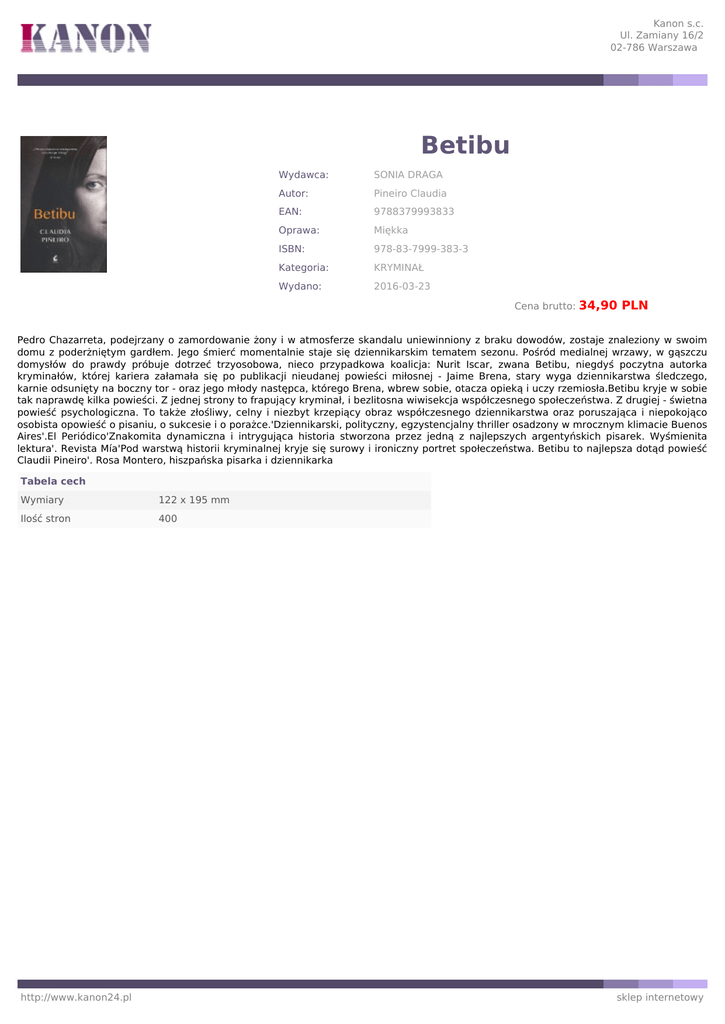 Kanon s.c. Ul. Zamiany 16/2 02-786 Warszawa Betibu Wydawca: SONIA DRAGA Autor: Pineiro Claudia EAN: 9788379993833 Oprawa: Miękka ISBN: 978-83-7999-383-3 Kategoria: KRYMINAŁ Wydano: 2016-03-23 Cena brutto: 34,90 PLN Pedro Chazarreta, podejrzany o zamordowanie żony i w atmosferze skandalu uniewinniony z braku dowodów, zostaje znaleziony w swoim domu z poderżniętym gardłem. Jego śmierć momentalnie staje się dziennikarskim tematem sezonu. Pośród medialnej wrzawy, w gąszczu domysłów do prawdy próbuje dotrzeć trzyosobowa, nieco przypadkowa koalicja: Nurit Iscar, zwana Betibu, niegdyś poczytna autorka kryminałów, której kariera załamała się po publikacji nieudanej powieści miłosnej - Jaime Brena, stary wyga dziennikarstwa śledczego, karnie odsunięty na boczny tor - oraz jego młody następca, którego Brena, wbrew sobie, otacza opieką i uczy rzemiosła.Betibu kryje w sobie tak naprawdę kilka powieści. Z jednej strony to frapujący kryminał, i bezlitosna wiwisekcja współczesnego społeczeństwa. Z drugiej - świetna powieść psychologiczna. To także złośliwy, celny i niezbyt krzepiący obraz współczesnego dziennikarstwa oraz poruszająca i niepokojąco osobista opowieść o pisaniu, o sukcesie i o porażce.'Dziennikarski, polityczny, egzystencjalny thriller osadzony w mrocznym klimacie Buenos Aires'.El Periódico'Znakomita dynamiczna i intrygująca historia stworzona przez jedną z najlepszych argentyńskich pisarek. Wyśmienita lektura'. Revista Mía'Pod warstwą historii kryminalnej kryje się surowy i ironiczny portret społeczeństwa. Betibu to najlepsza dotąd powieść Claudii Pineiro'. Rosa Montero, hiszpańska pisarka i dziennikarka Tabela cech Wymiary 122 x 195 mm Ilość stron 400 http://www.kanon24.pl sklep internetowy