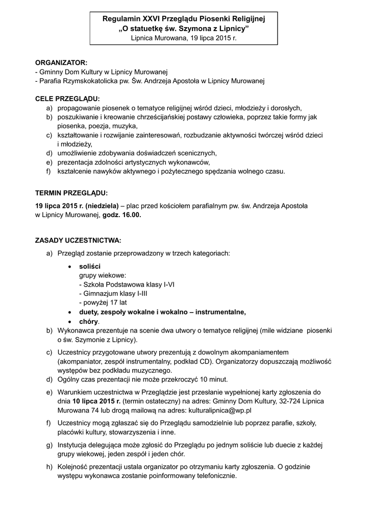 Regulamin XXVI Przeglądu Piosenki Religijnej „O statuetkę św. Szymona z Lipnicy” Lipnica Murowana, 19 lipca 2015 r. ORGANIZATOR: - Gminny Dom Kultury w Lipnicy Murowanej - Parafia Rzymskokatolicka pw. Św. Andrzeja Apostoła w Lipnicy Murowanej CELE PRZEGLĄDU: a) propagowanie piosenek o tematyce religijnej wśród dzieci, młodzieży i dorosłych, b) poszukiwanie i kreowanie chrześcijańskiej postawy człowieka, poprzez takie formy jak piosenka, poezja, muzyka, c) kształtowanie i rozwijanie zainteresowań, rozbudzanie aktywności twórczej wśród dzieci i młodzieży, d) umożliwienie zdobywania doświadczeń scenicznych, e) prezentacja zdolności artystycznych wykonawców, f) kształcenie nawyków aktywnego i pożytecznego spędzania wolnego czasu. TERMIN PRZEGLĄDU: 19 lipca 2015 r. (niedziela) – plac przed kościołem parafialnym pw. św. Andrzeja Apostoła w Lipnicy Murowanej, godz. 16.00. ZASADY UCZESTNICTWA: a) Przegląd zostanie przeprowadzony w trzech kategoriach: soliści grupy wiekowe: - Szkoła Podstawowa klasy I-VI - Gimnazjum klasy I-III - powyżej 17 lat duety, zespoły wokalne i wokalno – instrumentalne, chóry. b) Wykonawca prezentuje na scenie dwa utwory o tematyce religijnej (mile widziane piosenki o św. Szymonie z Lipnicy). c) Uczestnicy przygotowane utwory prezentują z dowolnym akompaniamentem (akompaniator, zespół instrumentalny, podkład CD). Organizatorzy dopuszczają możliwość występów bez podkładu muzycznego. d) Ogólny czas prezentacji nie może przekroczyć 10 minut. e) Warunkiem uczestnictwa w Przeglądzie jest przesłanie wypełnionej karty zgłoszenia do dnia 10 lipca 2015 r. (termin ostateczny) na adres: Gminny Dom Kultury, 32-724 Lipnica Murowana 74 lub drogą mailową na adres: [email protected] f) Uczestnicy mogą zgłaszać się do Przeglądu samodzielnie lub poprzez parafie, szkoły, placówki kultury, stowarzyszenia i inne. g) Instytucja delegująca może zgłosić do Przeglądu po jednym soliście lub duecie z każdej grupy wiekowej, jeden zespół i jeden chór. h) Kolejność prezentacji ustala organizator po otrzymaniu karty zgłoszenia. O godzinie występu wykonawca zostanie poinformowany telefonicznie. OCENA I NAGRODY: a) Występy uczestników oceniać będzie Komisja Artystyczna powołana przez organizatora. Decyzje Jury są ostateczne i niezaskarżalne. b) Komisja Artystyczna przyzna najlepszym wykonawcom miejsca, wyróżnienia i nagrody. Przewiduje się przyznanie nagrody publiczności. c) Uczestnicy walczyć będą o statuetkę św. Szymona z Lipnicy. Dodatkowo Komisja przyznaje również nagrody finansowe, rzeczowe i wyróżnienia w każdej kategorii. d) Komisja oceni wykonawców w/g następujących kryteriów: - dobór repertuaru – tematyka i dostosowanie do możliwości wykonawcy, - czystość i poprawność wykonania, - osobowość sceniczna, - umiejętność wykorzystania naturalnych predyspozycji wykonawcy, - ogólny wyraz artystyczny. e) Wszyscy uczestnicy otrzymają pamiątkowe dyplomy za udział. SPRAWY ORGANIZACYJNE: - Uczestnicy przyjeżdżają do Lipnicy na własny koszt. - Organizatorzy zapewniają drobny poczęstunek dla uczestników Przeglądu. - Wszystkim uczestnikom organizator zapewnia nagłośnienie. - Ogłoszenie wyników, wręczenie dyplomów i nagród nastąpi po obradach jury. - Organizatorzy zastrzegają sobie prawo zmian w regulaminie, jeżeli nastąpi taka konieczność i prawo ostatecznej interpretacji powyższego regulaminu. BIURO ORGANIZACYJNE: Gminny Dom Kultury w Lipnicy Murowanej 32-724 Lipnica Murowana tel./fax 14 6852108 e-mail: [email protected] www.kulturalipnica.pl Wszelkich informacji udziela koordynator Przeglądu: Kinga Kozioł-Matlęga