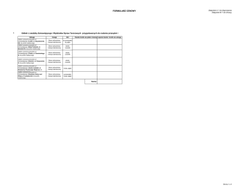 FORMULARZ CENOWY 1 Załącznik nr 1 do Zaproszenia Załącznik Nr 1 do Umowy Odbiór z siedziby Zamawiającego i Wydziałów Spraw Terenowych przygotowanych do nadania przesyłek i Uwagi Dni Odbiór i przewóz przesyłek od Zamawiającego (Lublin, ul. Bazylianówka 46) do punktu nadawczego. Usługa Okres rozliczeniowy: miesiąc kalendarzowy od poniedziałku do piątku Odbiór i przewóz przesyłek od Zamawiającego (Biała Podlaska, ul. Brzeska 41) do punktu nadawczego. Okres rozliczeniowy: miesiąc kalendarzowy wtorek, czwartek Odbiór i przewóz przesyłek od Zamawiającego (Chełm, ul. Kamieńskiego 6) do punktu nadawczego. Okres rozliczeniowy: miesiąc kalendarzowy wtorek, czwartek Odbiór i przewóz przesyłek od Zamawiającego (Zamość, ul. Partyzantów 3) do punktu nadawczego. Okres rozliczeniowy: miesiąc kalendarzowy wtorek, czwartek Okres rozliczeniowy: miesiąc kalendarzowy środa, piątek Okres rozliczeniowy: miesiąc kalendarzowy poniedziałek, środa, piątek Odbiór i przewóz przesyłek od Zamawiającego (Janów Lubelski, ul. Bohaterów Porytowego Wzgórza) do punktu nadawczego. Odbiór i przewóz przesyłek od Zamawiającego (Kazimierz Dolny nad Wisłą, ul. Lubelska 4A) do punktu nadawczego. kwota brutto za usługę Kwota brutto za jeden miesiąc Łączna usługi [PLN] Suma: Strona 1 z 4 FORMULARZ CENOWY 2 Przemieszczanie i doręczanie przesyłek do określonych przez Zamawiającego na przesyłkach adresatów na terenie kraju Lp. Wyszczególnienie 1 Przesyłka listowa nierejestrowana Liczba [szt.] Gabaryt A Cena Łączna Liczba [szt.] Do 350 g 3140 2 350-1000 g 13 1 1000-2000 g 1 2 Łączna Suma: Przesyłka listowa polecona Do 350 g 535 9 350-1000 g 1 7 1000-2000 g 1 2 Suma: 2.2. 2a Gabaryt B Cena 2 Suma: 2.1. 2.2a. Załącznik nr 1 do Zaproszenia Załącznik Nr 1 do Umowy Suma: Przesyłka listowa polecona wymagająca zastosowania przepisów Kodeksu Postępowania Administyracyjnego (art. 57 §5 pkt 2) Do 350 g 50 1 350-1000 g 1 1 1000-2000 g 1 1 Suma: Suma: Strona 2 z 4 FORMULARZ CENOWY 3 Przesyłka listowa polecona z potwierdzeniem odbioru Do 350 g 5823 7 350-1000 g 1 8 1000-2000 g 1 Suma: Przesyłka listowa nierejestrowana najszybszej kategorii Do 350 g 421 350-1000 g 2 1000-2000 g 1 1 2 1 Suma: 2.4. 5 Suma: Przesyłka listowa polecona najszybszej kategorii Do 350 g 267 2 350-1000 g 10 7 1000-2000 g 2 3 Suma: 2.5. 5a 2.5a. 7 Suma: 2.3. 4 Załącznik nr 1 do Zaproszenia Załącznik Nr 1 do Umowy Suma: Przesyłka listowa polecona najszybszej kategorii wymagająca zastosowania przepisów Kodeksu Postępowania Administyracyjnego (art.. 57 §5 pkt 2) Do 350 g 50 1 350-1000 g 1 1 1000-2000 g 1 1 Suma: Suma: Strona 3 z 4 FORMULARZ CENOWY 6 Przesyłka listowa polecona z potwierdzeniem odbioru najszybszej kategorii Do 350 g 504 350-1000 g 2 1000-2000 g 1 5 2 1 Suma: 2.6. 7 Suma: Przesyłki listowe w obrocie zagranicznym najszybszej kategorii Do 350 g 1 1 Suma: 2.7. 8 Suma: Zwroty przesyłek listowych poleconych w obrocie krajowym Do 350 g 1 1 350-1000 g 1 1 1000-2000 g 1 1 Suma: 2.8. 9 Załącznik nr 1 do Zaproszenia Załącznik Nr 1 do Umowy Suma: Paczki pocztowe tzw. ekonomiczna w obrocie krajowym 2000-5000 g 1 5000-10000 g 1 1 1 Suma: 2.9. Suma: Łączna wartość usług Zamawiający zastrzega, że podane w „Formularzu cenowym” liczby dla poszczególnych usług nie stanowią ze strony Zamawiającego zobowiązania do zakupu usług w podanych liczbach lecz stanowią informację o szacunkowej wielkości zapotrzebowania na poszczególne usługi. ZAMAWIAJĄCY: ......................................................... WYKONAWCA: ............................................................. Strona 4 z 4