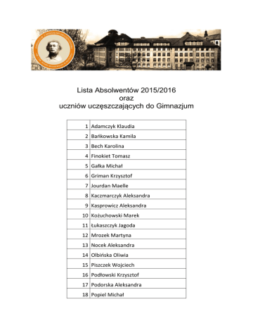 Lista Absolwentów 2015/2016 oraz uczniów uczęszczających do Gimnazjum 1 Adamczyk Klaudia 2 Bańkowska Kamila 3 Bech Karolina 4 Finokiet Tomasz 5 Gałka Michał 6 Griman Krzysztof 7 Jourdan Maelle 8 Kaczmarczyk Aleksandra 9 Kasprowicz Aleksandra 10 Kożuchowski Marek 11 Łukaszczyk Jagoda 12 Mrozek Martyna 13 Nocek Aleksandra 14 Olbińska Oliwia 15 Piszczek Wojciech 16 Podłowski Krzysztof 17 Podorska Aleksandra 18 Popiel Michał 19 Reichert Paulina 20 Szumielewicz Marcelina 21 Ślęzak Paulina 22 Wajsowicz Angelika 23 Wolniewska Wiktoria 24 Zielińska Dominika 25 Batóg Mikołaj 26 Bielska Weronika 27 Dolata Natalia 28 Gąsiorek Magdalena 29 Gudyk Nina 30 Hybsz Dagmara 31 Iwanowicz Jakub 32 Jagłowska Magdalena 33 Jankowski Damian 34 Jaworska Anna 35 Klatka Aleksander 36 Kondracka Agata 37 Luba Katarzyna 38 Mlostek Karolina 39 Nakwasiński Karol 40 Paprocki Adam 41 Ptaszyńska Nicoll 42 Szpytma Klaudia 43 Wawszczyk Klaudia 44 Głowacki Jakub 45 Góral Michał 46 Grabowiecki Szymon 47 Ilba Olimpia 48 Kowalski Vincent 49 Kulig Weronika 50 Łastowiecki Dominik 51 Majkut Ewa 52 Olszyńska Agata 53 Osipow Kacper 54 Panek Paulina 55 Plenkiewicz Anna 56 Pluta Mateusz 57 Pospieszyński Jakub 58 Ratuszniak Angelika 59 Sitarek Kacper 60 Sobel Karolina 61 Wojewska Wiktoria 62 Zahmel Oliwer 63 Zimna Marta 64 Bileński Kornel 65 Bonczar Patrycja 66 Dąbrowski Patryk 67 Gałka Patryk 68 Głuszczyński Wojciech 69 Gusławski Marcel 70 Jamróz Mateusz 71 Kołyszko Adrian 72 Kubies Tomasz 73 Kul Adam 74 Oleksiuk Paweł 75 Pawlak Żaneta 76 Stypuła Kacper 77 Szewczyk Dominka 78 Szwarc Krystian 79 Tarnawska Klaudia 80 Turczynin Jakub 81 Waszczyk Jakub 82 Wójcik Bartosz 83 Bieniasz Dominika 84 Ćwirta Wiktoria 85 Domagalski Grzegorz 86 Jawdoczenko Kamil 87 Karpiewska Urszula 88 Koch Macie 89 Kret Karolina 90 Los Krzysztof 91 Mochel Rafał 92 Nowak Przemysław 93 Paschka Jessika 94 Pilna Natalia 95 Serwatka Kamil 96 Stypuła Natalia 97 Wawryniuk Łukasz 98 Ziobro Amelia 99 Butkiewicz Kacper 100 Fleming Mateusz 101 Krawczyk Konrad 102 Pawlik Daniel 103 Polak Alicja 104 Rulka Agnieszka 105 Rybak Agnieszka 106 Sowa Damian 107 Stankiewicz Paweł 108 Trupkiewicz Agnieszka
