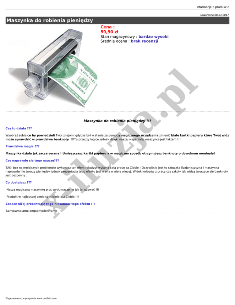 Informacje o produkcie Utworzono 08-03-2017 Maszynka do robienia pieniędzy Cena : 59,90 zł .p l Stan magazynowy : bardzo wysoki Średnia ocena : brak recenzji zj a Maszynka do robienia pieniędzy !!! Czy to działa ??? Wyobraź sobie co by powiedzieli Twoi znajomi gdybyś był w stanie za pomocą magicznego urządzenia zmienić białe kartki papieru które Twój widz może sprawdzić w prawdziwe banknoty !!!To przeczy logice jednak dzięki naszej wspaniałej maszynce jest faktem !!! Prawdziwa magia ??? ilu Maszynka działa jak zaczarowana ! Umieszczasz kartki papieru a w magiczny sposób otrzymujesz banknoty o dowolnym nominale! Czy naprawdę się tego nauczę??? TAK- bez najmniejszych problemów wykonasz ten efekt rekwizyt wykona całą pracę za Ciebie ! Oczywiście jest to sztuczka iluzjonistyczna i maszynka naprawdę nie tworzy pieniędzy jednak prezentacja tego efektu jest warta o wiele więcej. Widok kolegów z pracy czy szkoły jak widzą tworzące się banknoty jest bezcenny . Co dostajesz ??? x- -Naszą magiczną maszynkę plus wytłumaczenie jak jej używać !!! -Produkt w najlepszej cenie specjalnie dla Ciebie !!! Zobacz niżej prezentację tego niesamowitego efektu !!! </iframe Wygenerowano w programie www.oscGold.com