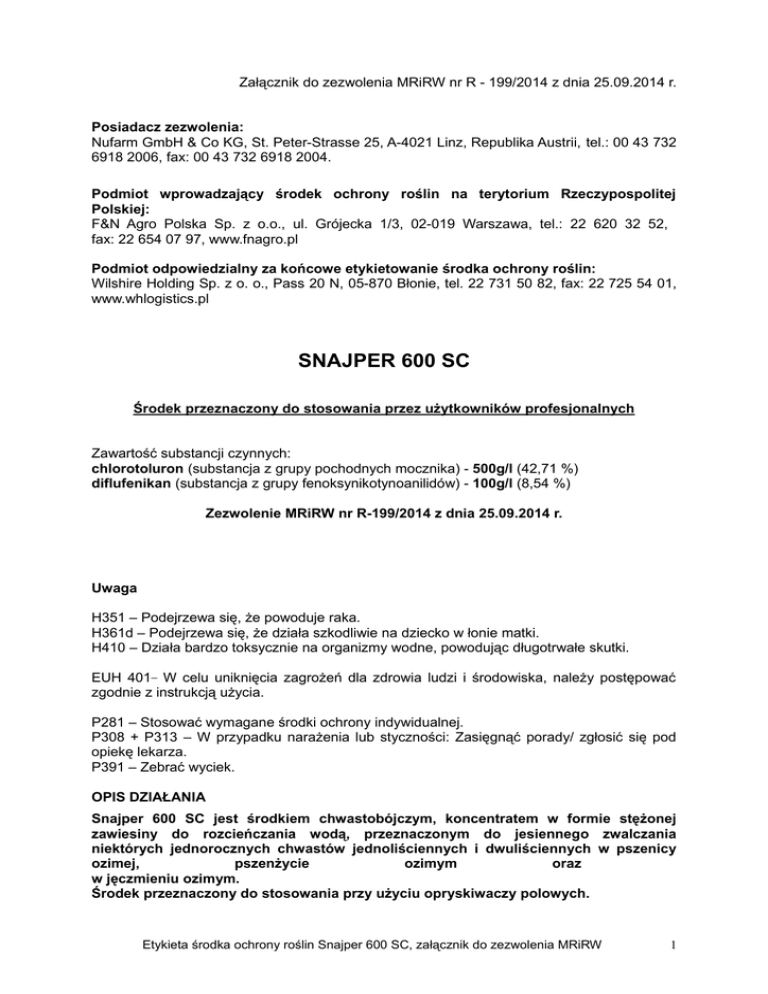Załącznik do zezwolenia MRiRW nr R - 199/2014 z dnia 25.09.2014 r. Posiadacz zezwolenia: Nufarm GmbH & Co KG, St. Peter-Strasse 25, A-4021 Linz, Republika Austrii, tel.: 00 43 732 6918 2006, fax: 00 43 732 6918 2004. Podmiot wprowadzający środek ochrony roślin na terytorium Rzeczypospolitej Polskiej: F&N Agro Polska Sp. z o.o., ul. Grójecka 1/3, 02-019 Warszawa, tel.: 22 620 32 52, fax: 22 654 07 97, www.fnagro.pl Podmiot odpowiedzialny za końcowe etykietowanie środka ochrony roślin: Wilshire Holding Sp. z o. o., Pass 20 N, 05-870 Błonie, tel. 22 731 50 82, fax: 22 725 54 01, www.whlogistics.pl SNAJPER 600 SC Środek przeznaczony do stosowania przez użytkowników profesjonalnych Zawartość substancji czynnych: chlorotoluron (substancja z grupy pochodnych mocznika) - 500g/l (42,71 %) diflufenikan (substancja z grupy fenoksynikotynoanilidów) - 100g/l (8,54 %) Zezwolenie MRiRW nr R-199/2014 z dnia 25.09.2014 r. Uwaga H351 – Podejrzewa się, że powoduje raka. H361d – Podejrzewa się, że działa szkodliwie na dziecko w łonie matki. H410 – Działa bardzo toksycznie na organizmy wodne, powodując długotrwałe skutki. EUH 401 W celu uniknięcia zagrożeń dla zdrowia ludzi i środowiska, należy postępować zgodnie z instrukcją użycia. P281 – Stosować wymagane środki ochrony indywidualnej. P308 + P313 – W przypadku narażenia lub styczności: Zasięgnąć porady/ zgłosić się pod opiekę lekarza. P391 – Zebrać wyciek. OPIS DZIAŁANIA Snajper 600 SC jest środkiem chwastobójczym, koncentratem w formie stężonej zawiesiny do rozcieńczania wodą, przeznaczonym do jesiennego zwalczania niektórych jednorocznych chwastów jednoliściennych i dwuliściennych w pszenicy ozimej, pszenżycie ozimym oraz w jęczmieniu ozimym. Środek przeznaczony do stosowania przy użyciu opryskiwaczy polowych. Etykieta środka ochrony roślin Snajper 600 SC, załącznik do zezwolenia MRiRW 1 2 DZIAŁANIE NA CHWASTY Snajper 600 SC zawiera dwie substancje czynne o uzupełniającym się sposobie działania. Diflufenikan pobierany jest przez chwasty w czasie kiełkowania, a zastosowany po ich wschodach wchłaniany jest również przez liście, hamując biosyntezę niezbędnych roślinom barwników (karotenoidów). Chlorotoluron pobierany jest poprzez korzenie i liście chwastów, hamuje proces fotosyntezy. Najlepszy efekt chwastobójczy uzyskuje się stosując środek we wczesnych fazach rozwojowych chwastów, to jest w czasie ich kiełkowania lub krótko po wschodach, w fazie siewek. Zachowuje długotrwałą skuteczność działania również w stosunku do chwastów później wschodzących. Chwasty wrażliwe: bodziszek drobny, dymnica pospolita, fiołek polny, gwiazdnica pospolita, jasnota purpurowa, jasnota różowa, maruna bezwonna, miotła zbożowa, przetacznik polny, przytulia czepna, rumianek pospolity, tasznik pospolity, Chwasty średniowrażliwe: mak polny STOSOWANIE ŚRODKA Pszenica ozima Maksymalna dawka dla jednorazowego zastosowania: 1,5 l/ha Zalecana dawka dla jednorazowego zastosowania: 1,25-1,5 l/ha Termin stosowania: środek stosować od fazy szpilkowania zbóż do końca fazy krzewienia (BBCH 10-29). Zalecana ilość wody: 200-300 l/ha. Zalecane opryskiwanie: średniokropliste. Maksymalna liczba zabiegów w sezonie wegetacyjnym: 1 Jęczmień ozimy Maksymalna dawka dla jednorazowego zastosowania: 1,5 l/ha Zalecana dawka dla jednorazowego zastosowania: 1,25-1,5 l/ha Termin stosowania: środek stosować od fazy 3 liścia zbóż do końca fazy krzewienia (BBCH 13-29). Zalecana ilość wody: 200-300 l/ha. Zalecane opryskiwanie: średniokropliste. Maksymalna liczba zabiegów w sezonie wegetacyjnym: 1 Pszenżyto ozime Maksymalna dawka dla jednorazowego zastosowania: 1,5 l/ha Zalecana dawka dla jednorazowego zastosowania: 1,25-1,5 l/ha Termin stosowania: środek stosować od fazy 3 liścia zbóż do końca fazy krzewienia (BBCH 13-29). Zalecana ilość wody: 200-300 l/ha. Zalecane opryskiwanie: średniokropliste. Maksymalna liczba zabiegów w sezonie wegetacyjnym: 1 Łagodna zima wpływa na przyspieszenie rozkładu substancji czynnych, co skraca okres działania środka wiosną. 2 NASTĘPSTWO ROŚLIN Snajper 600 SC nie stwarza zagrożenia dla roślin uprawianych następczo, gdy wykonano orkę na głębokość 10 cm. Możliwe są przejściowe odbarwienia liści zbóż i pierwszych liści rzepaku, nie wpływające na późniejszą kondycję roślin. W przypadku wysiania rzepaku ozimego bez uprzedniej orki mogą wystąpić objawy fitotoksyczności, zwłaszcza na glebach lekkich o małej zawartości substancji organicznej. W przypadku konieczności wcześniejszego zlikwidowania plantacji w wyniku uszkodzenia roślin przez mrozy, szkodniki lub choroby na polu tym wiosną po wykonaniu 20 cm orki można uprawiać jęczmień jary, pszenicę jarą, kukurydzę, słonecznik, ziemniak, rośliny motylkowate, rzepak jary oraz len. Przemijające odbarwienia mogą wystąpić na liściach jęczmienia jarego, pszenicy jarej, rzepaku jarego, grochu lub lnu. Nie uprawiać buraków cukrowych. ŚRODKI OSTROŻNOŚCI PRAKTYKĄ ROLNICZĄ I ZALECENIA STOSOWANIA ZWIĄZANE Z DOBRĄ 1. Środka nie stosować: – w zbożach z wsiewką roślin motylkowatych – na rośliny osłabione lub uszkodzone przez choroby, szkodniki, przymrozki lub suszę. 2. Środek stosować na glebę dobrze uprawioną (bez grud). 3. Ziarno zbóż wysiewać na równą głębokość (3-4 cm) przykrywając ziarno dokładnie ziemią. 4. Niższą z zalecanych dawek stosować na glebach lekkich, w warunkach słabszego zachwaszczenia 5. Podczas stosowania środka nie dopuścić do: – znoszenia cieczy użytkowej na sąsiednie plantacje roślin uprawnych oraz – nakładania się cieczy użytkowej na stykach pasów zabiegowych i uwrociach. SPORZĄDZANIE CIECZY UŻYTKOWEJ Przed przystąpieniem do sporządzania cieczy użytkowej dokładnie ustalić potrzebną jej ilość. Zawartością opakowania przed użyciem wstrząsnąć. Odmierzoną 
