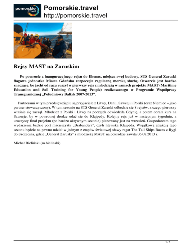 Pomorskie.travel http://pomorskie.travel Rejsy MAST na Zaruskim Po powrocie z inauguracyjnego rejsu do Ekenas, miejsca swej budowy, STS Generał Zaruski flagowa jednostka Miasta Gdańska rozpoczęła regularną morską służbę. Otwarcie jest bardzo znaczące, bo jacht od razu ruszył w pierwszy rejs z młodzieżą w ramach projektu MAST (Maritime Education and Sail Training for Young People) realizowanego w Programie Współpracy Transgranicznej „Południowy Bałtyk 2007-2013”. Partnerami w tym przedsięwzięciu są przyjaciele z Litwy, Danii, Szwecji i Polski (oraz Niemiec – jako partner stowarzyszony). W tym sezonie na STS Generał Zaruski odbędzie się 8 rejsów, z czego pierwszy właśnie się zaczął. Młodzież z Polski i Litwy na początek odwiedziła Gdynię, a potem obrała kurs na Szwecję, by w powrotnej drodze udać się do Kłajpedy. Kolejny rejs już w następnym tygodniu, a uroczysty finał projektu (po bardzo aktywnym sezonie) planowany jest na wrzesień. Gospodarzem tego wydarzenia będzie port macierzysty „Brabandera”, czyli litewska Kłajpeda. Wyjątkową atrakcją tego sezonu będzie na pewno udział w jednym z etapów światowej sławy regat The Tall Ships Races z Rygi do Szczecina, gdzie „Generał Zaruski” z młodzieżą MAST na pokładzie zawita 06.08.2013 r. Michał Bieliński (m.bielinski) 1/1 Powered by TCPDF (www.tcpdf.org)
