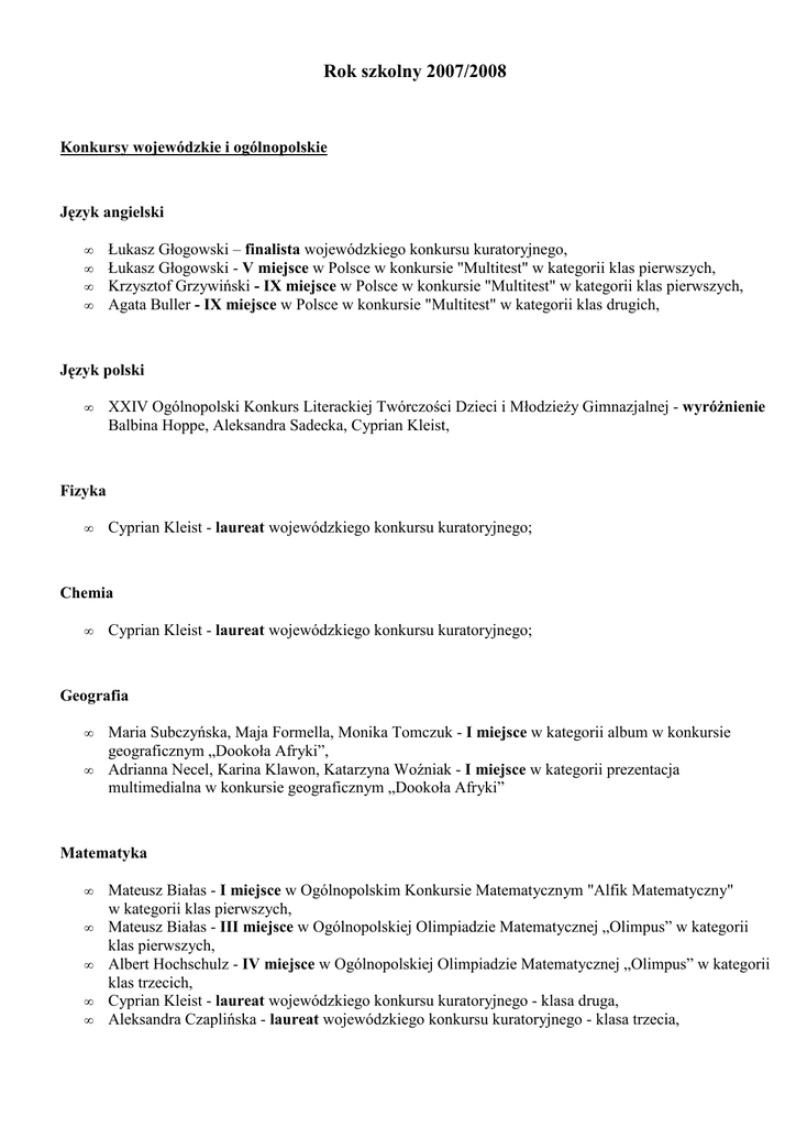 Rok szkolny 2007/2008 Konkursy wojewódzkie i ogólnopolskie Język angielski • • • • Łukasz Głogowski – finalista wojewódzkiego konkursu kuratoryjnego, Łukasz Głogowski - V miejsce w Polsce w konkursie "Multitest" w kategorii klas pierwszych, Krzysztof Grzywiński - IX miejsce w Polsce w konkursie "Multitest" w kategorii klas pierwszych, Agata Buller - IX miejsce w Polsce w konkursie "Multitest" w kategorii klas drugich, Język polski • XXIV Ogólnopolski Konkurs Literackiej Twórczości Dzieci i MłodzieŜy Gimnazjalnej - wyróŜnienie Balbina Hoppe, Aleksandra Sadecka, Cyprian Kleist, Fizyka • Cyprian Kleist - laureat wojewódzkiego konkursu kuratoryjnego; Chemia • Cyprian Kleist - laureat wojewódzkiego konkursu kuratoryjnego; Geografia • • Maria Subczyńska, Maja Formella, Monika Tomczuk - I miejsce w kategorii album w konkursie geograficznym „Dookoła Afryki”, Adrianna Necel, Karina Klawon, Katarzyna Woźniak - I miejsce w kategorii prezentacja multimedialna w konkursie geograficznym „Dookoła Afryki” Matematyka • • • • • Mateusz Białas - I miejsce w Ogólnopolskim Konkursie Matematycznym "Alfik Matematyczny" w kategorii klas pierwszych, Mateusz Białas - III miejsce w Ogólnopolskiej Olimpiadzie Matematycznej „Olimpus” w kategorii klas pierwszych, Albert Hochschulz - IV miejsce w Ogólnopolskiej Olimpiadzie Matematycznej „Olimpus” w kategorii klas trzecich, Cyprian Kleist - laureat wojewódzkiego konkursu kuratoryjnego - klasa druga, Aleksandra Czaplińska - laureat wojewódzkiego konkursu kuratoryjnego - klasa trzecia, • • Rompca Radosław - laureat wojewódzkiego konkursu kuratoryjnego - klasa trzecia,« konkurs matematyczny "Z matematyką za pan brat"- I miejsce: Aleksandra Czaplińska 3c, Albert Hochschulz 3d, Radosław Rompca 3d, Kangur matematyczny- wyróŜnieni: Komarnicki Paweł, Pluta Kamil, Pakieser Marek, Budzinska Magdalena, Puchalska Paulina, Bialas Mateusz, Pawlowski Mateusz, Kortas Jakub, Kleist Cyprian, Purol Bartlomiej, Kiedrowski Karol, Hochschulz Albert, Czaplinska Aleksandra, Piecuch Michal, Rompca Radosław; Plastyka • • Daniel Okrój - I miejsce w Wojewódzkim Konkursie Plastycznym „UzaleŜnieniom mówimy NIE” , w Ogólnopolskim Konkursie Plastycznym "Tęcza" wyróŜniono prace indywidualne: Marty Krzemińskiej, Adrianny Necel, Marty Łączkowiak, Patrycji Blindow Konkursy powiatowe Chemia • Paulina Miszewska - udział w etapie rejonowym konkursu chemicznego; Inne konkursy ♦ Rumski Konkurs DruŜyn Chemicznych pod hasłem "Świat metali" dla klas trzecich Aleksandra Zaradny, Paulina Miszewska, Cyprian Kleist - I miejsce, ♦ „Sopockie Asy Gimnazjalne” - Czaplińska Aleksandra - II miejsce; ♦ IV Miejski Konkurs Humanistyczny „W kręgo kultury epok staropolskich” – OŚWIECENIE Nadia Kowalczyk, Aleksandra Sadecka, Cyprian Keist - I miejsce, ♦ IV Konkurs Gramatyczny - do etapu miejskiego zakwalifikowało się 10 osób z klas pierwszych i drugich; ♦ VIII Miejski Konkurs Ortograficzny - Alicja Hoppe - II miejsce, - Jędrzej Dampc - IV miejsce; ♦ III Szkolny Konkurs Walentynkowy "Pierwsze drŜenie serca" - w kategorii opowiadanie: I miejsce Aleksandra Sadecka, - w kategorii praca plastyczna: I miejsce Joanna Laskowska; ♦ VI Miejski Konkurs Geograficzny "Azja - kontynent kontrastów" - Magda Witman - IX miejsce; ♦ XXXVI Ogólnopolski Turniej Turystyczno – Krajoznawczym - III miejsce w etapie miejskim druŜyna w składzie Paweł Komarnicki, Alicja Jaworowska, Maciej Packi; Osiągnięcia sportowe ♦ II miejsce w Mistrzostwach Powiatu Wejherowskiego w sztafetach pływackich 9x50m; ♦ III miejsce w Mistrzostwach Powiatu Wejherowskiego w piłce siatkowej chłopców (Michał Piecuch, Robert Ustarbowski, Kamil SzeleŜyński, Tomasz Makowski, Mateusz Stanisławski, Bartosz Daszyk, Mateusz Lip, Radek Rompca, Kamil Pluta); ♦ XI Mistrzostwa Rumi w lekkiej atletyce - ElŜbieta Wilczewska - I miejsce w biegu na 300 m, - Daniel Okrój - I miejsce w pchnięciu piłką lekarską, - I miejsce w biegu na 300 m, - Marta Rychter - II miejsce w skoku w dal, - Barbara Reszka - II miejsce w pchnięciu piłką lekarską, - Sandra Hochschulz - II miejsce w pchnięciu piłką lekarską, - Piotr Drabiński - II miejsce w biegu na 600 m, - Mateusz Lip - II miejsce w biegu na 600 m, - Marek Kulas - II miejsce w skoku wzwyŜ, - III miejsce w biegu na 600 m, - Ewa Chrostowska - III miejsce w biegu na 600 m, - Maja Iwasiów - III miejsce w biegu na 300 m, - Tomasz Hewelt - III miejsce w biegu na 300 m, - Aleksander Mroske - III miejsce w pchnięciu piłką lekarską, - Albert Hochschulz - III miejsce w biegu na 300 m, I miejsce w Mistrzostwach Rumi w piłce siatkowej chłopców (Michał Piecuch, Robert Ustarbowski, Kamil SzeleŜyński, Tomasz Makowski, Mateusz Stanisławski, Bartosz Daszyk Mateusz Lip, Radek Rompca, Kamil Pluta); ♦ ♦ Mistrzostwa Rumi w LA halowej Klasyfikacja ogólna szkół gimnazjalnych w kategorii chłopców - II miejsce, Klasyfikacja indywidualna: - Maciej Łukasik - I miejsce – sztafeta 4 x 200 m, - Albert Hochsulz - I miejsce – sztafeta 4 x 200 m, - Daniel Okrój - I miejsce – sztafeta 4 x 200 m, - Mikołaj Reszka - I miejsce – sztafeta 4 x 200 m; - Maciej Łukasik - II miejsce – bieg na 30 m, - Tomasz Szweda - II miejsce – trzyskok, - Michał Piecuch - II miejsce – pchnięcie piłką lekarską, - Marek Kulas - II miejsce – bieg na 1000 m, Klasyfikacja ogólna szkół gimnazjalnych w kategorii dziewcząt - I miejsce, Klasyfikacja indywidualna: - ElŜbieta Wilczewska - I miejsce – bieg na 30 m, - Ewa Chrostowska - I miejsce – trzyskok, - Adrianna Niekurzak - I miejsce – pchnięcie piłką lekarską, - ElŜbieta Wilczewska, Marta Rychter, Magda Witman, Adrianna Niekurzak - I miejsce – sztafeta 4 x 200 m; - Agata Błaś - II miejsce – skok wzwyŜ, - Maria Subczyńska - II miejsce – bieg na 600 m, - Marta Rychter - III miejsce – bieg na 30 m, - Adrianna