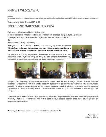 KMP WE WŁOCŁAWKU Źródło: http://www.wloclawek.kujawsko-pomorska.policja.gov.pl/kb4/informacje/wiadomosci/46776,Spelnione-marzenie-Lukasza.htm l Wygenerowano: Środa, 8 marca 2017, 15:00 SPEŁNIONE MARZENIE ŁUKASZA Policjanci z Włocławka i Izbicy Kujawskiej spełnili marzenie 10-letniego Łukasza. Marzeniem chorego chłopca było…spotkanie z policjantami. Było to spotkanie z ogromem wrażeń dla wszystkich. Do policjantów z Izbicy Kujawskiej i ... Policjanci z Włocławka i Izbicy Kujawskiej spełnili marzenie 10-letniego Łukasza. Marzeniem chorego chłopca było…spotkanie z policjantami. Było to spotkanie z ogromem wrażeń dla wszystkich. Do policjantów z Izbicy Kujawskiej i Włocławka dotarła informacja o dość nietypowej treści. Wynikało z niej, że chory, 10-letni chłopiec bardzo chciałby spotkać się z prawdziwymi policjantami. Było to jego ukryte marzenie. Policjanci bez zbędnego rozmyślania postanowili spełnić skryte myśli chorego chłopca. nadkom.Zbigniew Napiórski z włocławskiej komendy wraz z kolegami z posterunku policji w Izbicy Kujawskiej odwiedzili Łukasza. Radość spotkania spowodowała, że na twarzy Łukasza zagościł uśmiech, a ogrom wrażeń zupełnie „sparaliżował” chęć rozmowy. Łukasz pełen radości i uśmiechu tylko słuchał słów odwiedzających go policjantów. Z pewnością upominki, którymi został obdarowany długo jeszcze przypominać mu będą o niezwykłym przeżyciu. Policyjny „Polfinek” towarzyszyć mu będzie codziennie, a czapka pozwoli choć przez chwilę poczuć się prawdziwym policjantem. Życzymy Łukaszowi ooooooogromu zdróóówka!!!!!!!!!!!!!!! Autor: 566164 Publikacja: 566164 Ocena: 0/5 (0) Tweetnij