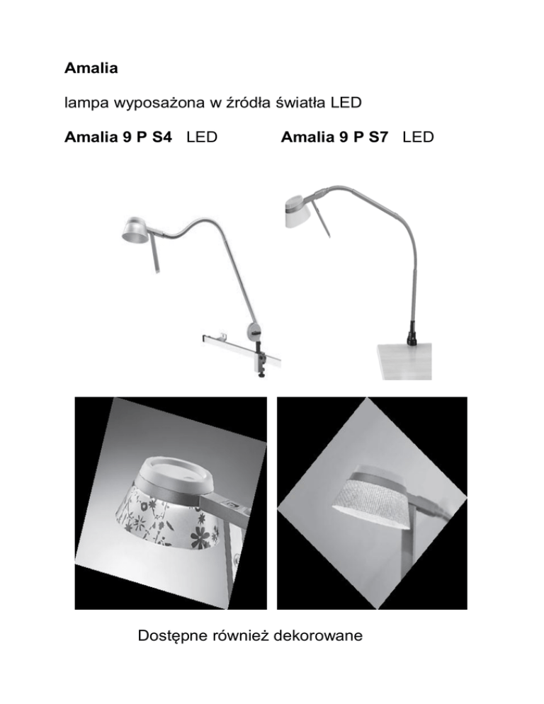 Amalia lampa wyposażona w źródła światła LED Amalia 9 P S4 LED Amalia 9 P S7 LED Dostępne również dekorowane Amalia 9 B S8 LED Charakterystyka techniczna: TECHNISCHE DATEN BEHANDLUNGSLEUCHTEN LICHTVERTEILUNG TECHNISCHE ZEICHNUNG Źródło światła Natężenie światła Plama świetlna Temperatura barwowa Zasilanie Przewód zasilający Obudowa lampy 1 x oprawa ze źródłem LED na giętkim ramieniu 1 000 Lux / 0,5 m 45 cm / 0,5 m 3000 K 230 V; 50 Hz; elektroniczny transformator około 2 m barwione aluminium Waga (netto) ok.1,5 kg Pobór mocy ok. 9 W Klasa ochrony Zgodność z normami Sposób mocowania II EN 60598-1, EN 60598-2-25 do szyny, statywu z kółkami, stołu/biurka , do ściany Inne dostępne folie dekoracyjne na oprawę aluminiową m.in. rattan.