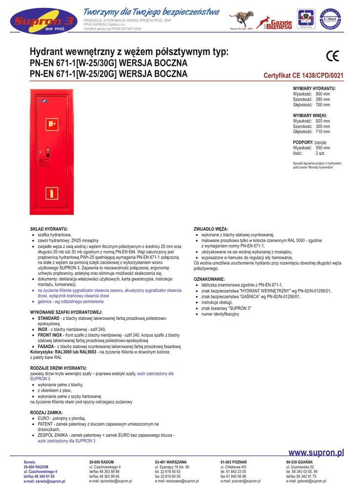 PRODUKCJA, DYSTRYBUCJA i SERWIS SPRZĘTU PPOŻ. i BHP PPUH SUPRON 3 Spółka z o.o. Certyfikat jakości wg PN-EN ISO 9001:2009 ZARZĄDZANIA SYSTEM Tworzymy dla Twojego bezpieczeństwa Certyfikowany na zgodność z: PN-EN ISO 9001:2009 Hydrant wewnętrzny z wężem półsztywnym typ: PN-EN 671-1[W-25/30G] WERSJA BOCZNA PN-EN 671-1[W-25/20G] WERSJA BOCZNA Certyfikat CE 1438/CPD/0021 WYMIARY HYDRANTU: Wysokość: 900 mm Szerokość: 280 mm Głębokość: 700 mm WYMIARY WNĘKI: Wysokość: 920 mm Szerokość: 300 mm Głębokość: 710 mm PODPORY: (opcja) Wysokość: 550 mm Ilość: 2 szt. Sposób łączenia podpór z hydrantem patrz karta “Montaż hydrantów” SKŁAD HYDRANTU: · szafka hydrantowa, · zawór hydrantowy: ZH25 mosiężny · zwijadło węża z osią wodną i wężem tłocznym półsztywnym o średnicy 25 mm oraz długości 20 mb lub 30 mb zgodnym z normą PN-EN 694. Wąż zakończony jest prądownicą hydrantową PWh-25 spełniającą wymagania PN-EN 671-1 połączoną na stałe z wężem za pomocą tulejki zaciskowej z wykorzystaniem wzoru użytkowego SUPRON 3. Zapewnia to niezawodność połączenia, ergonomię uchwytu prądownicy, estetykę oraz eliminuje możliwość skaleczenia się, · dokumenty: deklaracja właściwości użytkowych, karta gwarancyjna, instrukcje: montażu, konserwacji, · na życzenie Klienta sygnalizator otwarcia zaworu, akustyczny sygnalizator otwarcia drzwi, wyłącznik krańcowy otwarcia drzwi · gaśnica - wg oddzielnego zamówienia WYKONANIE SZAFKI HYDRANTOWEJ: · STANDARD - z blachy stalowej lakierowanej farbą proszkową poliestrowoepoksydową · INOX - z blachy nierdzewnej - szlif 240, · FRONT INOX - front szafki z blachy nierdzewnej - szlif 240, korpus szafki z blachy stalowej lakierowanej farbą proszkową poliestrowo-epoksydową · FASADA - z blachy stalowej ocynkowanej lakierowanej farbą proszkową fasadową Kolorystyka: RAL3000 lub RAL9003 - na życzenie Klienta w dowolnym kolorze z palety barw RAL ZWIJADŁO WĘŻA: · wykonane z blachy stalowej ocynkowanej, · malowane proszkowo tylko w kolorze czerwonym RAL 3000 - zgodnie z wymaganiem normy PN-EN 671-1, · ułożyskowane na osi wodnej wykonanej z mosiądzu, · wyposażone w hamulec do regulacji siły hamowania, Oś wodna umożliwia uruchomienie hydrantu przy rozwinięciu dowolnej długości węża półsztywnego. OZNAKOWANIE: · tabliczka znamionowa zgodnie z PN-EN 671-1, · znak bezpieczeństwa "HYDRANT WEWNĘTRZNY" wg PN-92/N-01256/01, · znak bezpieczeństwa “GAŚNICA” wg PN-92/N-01256/01, · instrukcja obsługi, · znak towarowy "SUPRON 3" · numer identyfikacyjny RODZAJE DRZWI HYDRANTU: zawiasy drzwi kryte wewnątrz szafy – poprawa estetyki szafy, wzór zastrzeżony dla SUPRON 3 · wykonanie pełne z blachy, · z okienkiem z plexi, · wykonanie pełne z szyby hartowanej na życzenie Klienta otwór pod ręczny ostrzegacz pożarowy RODZAJ ZAMKA: · EURO - pokrętny z plombą, · PATENT - zamek patentowy z kluczem zapasowym umieszczonym na drzwiczkach, · ZESPÓŁ ZAMKA - zamek patentowy + zamek EURO bez zapasowego klucza wzór zastrzeżony dla SUPRON 3 www.supron.pl Serwis: 26-600 RADOM ul. Czachowskiego 4 tel/fax 48 340 01 65 e-mail: [email protected] 26-600 RADOM ul. Czachowskiego 4 tel/fax 48 363 89 98 tel/fax 48 363 99 65 e-mail: [email protected] 03-481 WARSZAWA ul. Szanajcy 16 lok. 56 tel. 22 618 93 63 fax 22 619 80 05 e-mail: [email protected] 61-003 POZNAŃ ul. Chlebowa 4/8 tel. 61 842 23 00 fax 61 840 06 88 e-mail: [email protected] 80-530 GDAŃSK ul. Uczniowska 52 tel. 58 340 03 55, 56 tel/fax 58 342 91 75 e-mail: [email protected] WŁAŚCIWOŚCI HYDRAULICZNE Ciśnienie robocze: od 0,2 MPa do 1,2 MPa Prąd wody rozproszony stożkowy - nie mniejszy niż 45 stopni. UWAGA: Zależność natężenia przepływu Q od ciśnienia P przedstawia równanie: Q=K 10P, gdzie Q wyraża się w litrach/minutę,a P w megapaskalach. PRZYKŁADY WYKONANIA SZAFEK STANDARD INOX FRONT INOX FASADA szafka przykładowa - kolor RAL 3000 szafka przykładowa - szlif 240 szafka przykładowa - szlif 240 szafka przykładowa - kolor RAL 9006 RODZAJ ZAMKA EURO PATENT ZESPÓŁ ZAMKA