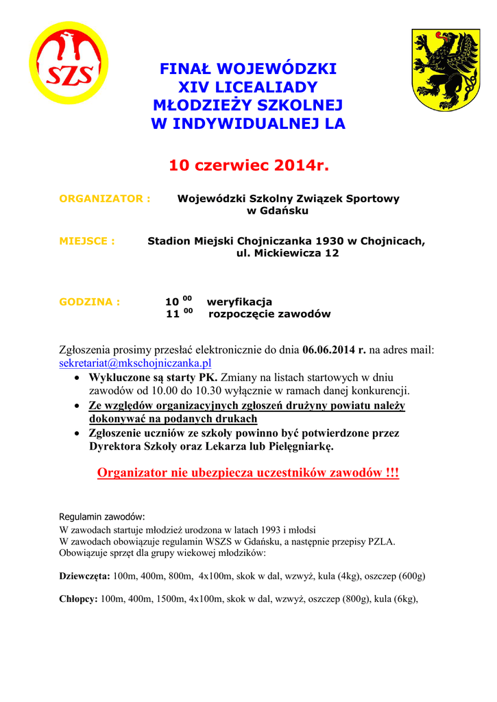 FINAŁ WOJEWÓDZKI XIV LICEALIADY MŁODZIEŻY SZKOLNEJ W INDYWIDUALNEJ LA 10 czerwiec 2014r. ORGANIZATOR : MIEJSCE : GODZINA : Wojewódzki Szkolny Związek Sportowy w Gdańsku Stadion Miejski Chojniczanka 1930 w Chojnicach, ul. Mickiewicza 12 10 00 11 00 weryfikacja rozpoczęcie zawodów Zgłoszenia prosimy przesłać elektronicznie do dnia 06.06.2014 r. na adres mail: [email protected] Wykluczone są starty PK. Zmiany na listach startowych w dniu zawodów od 10.00 do 10.30 wyłącznie w ramach danej konkurencji. Ze względów organizacyjnych zgłoszeń drużyny powiatu należy dokonywać na podanych drukach Zgłoszenie uczniów ze szkoły powinno być potwierdzone przez Dyrektora Szkoły oraz Lekarza lub Pielęgniarkę. Organizator nie ubezpiecza uczestników zawodów !!! Regulamin zawodów: W zawodach startuje młodzież urodzona w latach 1993 i młodsi W zawodach obowiązuje regulamin WSZS w Gdańsku, a następnie przepisy PZLA. Obowiązuje sprzęt dla grupy wiekowej młodzików: Dziewczęta: 100m, 400m, 800m, 4x100m, skok w dal, wzwyż, kula (4kg), oszczep (600g) Chłopcy: 100m, 400m, 1500m, 4x100m, skok w dal, wzwyż, oszczep (800g), kula (6kg), Zawodnik ma prawo startu w dwóch konkurencjach + sztafeta. Na zawody szkoła/miasto/powiat wystawia jedną sztafetę. Startujący w biegach na 800 m i 1500 m mają prawo startu tylko w jednej konkurencji W biegach na 100 m – serie na czas w finale 8 najlepszych czasów W pozostałych biegach klasyfikacja na podstawie osiągniętych w seriach wyników W konkurencjach technicznych – 4 próby bez finału - Powiat Powiat Powiat Powiat Powiat Powiat Powiat Powiat Powiat Powiat Powiat Powiat Powiat Powiat Powiat Powiat Powiat Powiat Powiat Powiat I II III IV V VI VII VIII IX X XI XII XIII XIV XV XVI XVII XVIII XIX XX - Gdańsk Gdynia Słupsk Gr. Sopot Bytów Chojnice Człuchów Pruszcz Kartuzy Kościerzyna Kwidzyn Lębork Malbork Nowy Dwór Puck Słupsk z. Starogard Tczew Wejherowo Sztum – – – – – – – – – – – – – – – – – – – – numer numer numer numer numer numer numer numer numer numer numer numer numer numer numer numer numer numer numer numer startowy startowy startowy startowy startowy startowy startowy startowy startowy startowy startowy startowy startowy startowy startowy startowy startowy startowy startowy startowy - od od od od od od od od od od od od od od od od od od od od 1 - do 50 51- do 100 101- do 150 151- do 200 201- do 250 251- do 300 301- do 350 351- do 400 401- do 450 451- do 500 501- do 550 551- do 600 601- do 650 651- do 700 701- do 750 751- do 800 801- do 850 851- do 900 901- do 950 951-do 1000 WOJEWÓDZKA GIMNAZJADA* LICEALIADA* MŁODZIEŻY w LA ZGŁOSZENIE REPREZENTACJI POWIATU………………………………………….……… L.p numer IMIĘ I NAZWISKO rok ur. SZKOŁA konkurencja wynik elim. rejon./ rek. ż 1 2 3 4 5 6 7 8 9 10 11 12 13 14 15 16 17 18 19 20 21 22 23 24 25 26 27 28 29 30 31 32 33 34 35 *niepotrzebne skreślić Ilość opiekunów:……………………; kierowców……………… Podpis powiatowego koordynatora sportu:……………………………………………