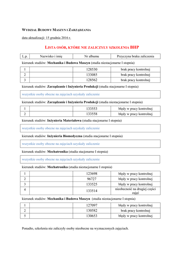 WYDZIAŁ BUDOWY MASZYN I ZARZĄDZANIA data aktualizacji: 15 grudnia 2016 r. LISTA OSÓB, KTÓRE NIE ZALICZYŁY SZKOLENIA BHP L.p. Nazwisko i imię Nr albumu Przyczyna braku zaliczenia kierunek studiów: Mechanika i Budowa Maszyn (studia niestacjonarne I stopnia) 1 2 3 128530 133085 128562 brak pracy kontrolnej brak pracy kontrolnej brak pracy kontrolnej kierunek studiów: Zarządzanie i Inżynieria Produkcji (studia stacjonarne I stopnia) wszystkie osoby obecne na zajęciach uzyskały zaliczenie kierunek studiów: Zarządzanie i Inżynieria Produkcji (studia niestacjonarne I stopnia) 1 2 133553 133558 błędy w pracy kontrolnej błędy w pracy kontrolnej kierunek studiów: Inżynieria Materiałowa (studia stacjonarne I stopnia) wszystkie osoby obecne na zajęciach uzyskały zaliczenie kierunek studiów: Inżynieria Biomedyczna (studia stacjonarne I stopnia) wszystkie osoby obecne na zajęciach uzyskały zaliczenie kierunek studiów: Mechatronika (studia stacjonarne I stopnia) wszystkie osoby obecne na zajęciach uzyskały zaliczenie kierunek studiów: Mechatronika (studia niestacjonarne I stopnia) 3 123698 96727 133525 4 133514 1 2 błędy w pracy kontrolnej błędy w pracy kontrolnej błędy w pracy kontrolnej nieobecność na drugiej części zajęć kierunek studiów: Mechanika i Budowa Maszyn (studia niestacjonarne I stopnia) 1 2 5 127097 130582 130653 błędy w pracy kontrolnej brak pracy kontrolnej błędy w pracy kontrolnej Ponadto, szkolenia nie zaliczyły osoby nieobecne na wyznaczonych zajęciach. Osoby, które nie uzyskały zaliczenia mają obowiązek ponownego uczestniczenia w szkoleniu. UWAGA: Nie zaliczenie szkolenia podstawowego bhp uniemożliwi wpisanie na kolejny semestr studiów. Najbliższy termin kolejnych zajęć: - zostanie określony wkrótce (dr inż. Adam Górny)