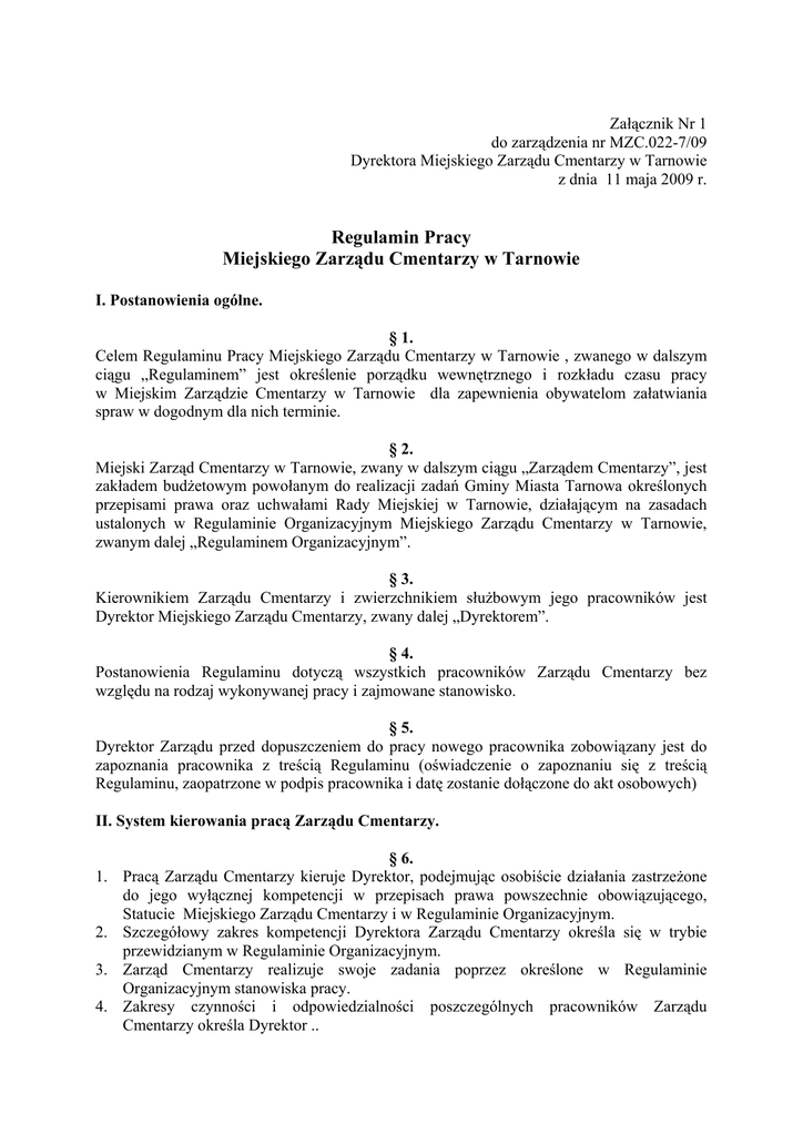 Regulamin Pracy - Miejski Zarząd Cmentarzy w Tarnowie