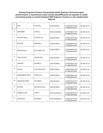 Komisja Programu Erasmus Staropolskiej Szkoły Wyższej w Kielcach pragnie poinformować, iż wymienione osoby zostały zakwalifikowane do wyjazdu na studia i otrzymania grantu w ramach kategorii SMS Programu Erasmus w roku akademickim 2013/14 1 KOS SYLWIA EKONOMIA UNIWERSYTET W PRESZOWIE SŁOWACJA 2 GROMIEC ANITA PEDAGOGIKA UNIWERSYTET W PRESZOWIE SŁOWACJA 3 MUSZYŃSKA PATRYCJA EKONOMIA UNIWERSYTET W PRESZOWIE SŁOWACJA 4 RYBAK MONIKA EKONOMIA UNIWERSYTET W PRESZOWIE SŁOWACJA 5 DOMAGAŁA KATARZYNA EKONOMIA UNIWERSYTET W PRESZOWIE SŁOWACJA 6 STEFANIAK ANGELIKA EKONOMIA UNIWERSYTET W PRESZOWIE SŁOWACJA 7 JAROSZ KAMILA EKONOMIA UNIWERSYTET W PRESZOWIE SŁOWACJA 8 SUSŁO MAGDALENA EKONOMIA UNIWERSYTET W PRESZOWIE SŁOWACJA 9 KOMÓRKIEWICZ EWELINA EKONOMIA UNIWERSYTET W PRESZOWIE SŁOWACJA 10 HRUBASCHUK YEVHEN EKONOMIA UNIWERSYTET W PRESZOWIE SŁOWACJA 11 KOZIEŁ MAGDALENA EKONOMIA UNIWERSYTET W PRESZOWIE SŁOWACJA 12 MARSZALIK ANNA PEDAGOGIKA UNIWERSYTET W PRESZOWIE SŁOWACJA 13 ŁĘTOCHA MONIKA PEDAGOGIKA UNIWERSYTET W PRESZOWIE SŁOWACJA