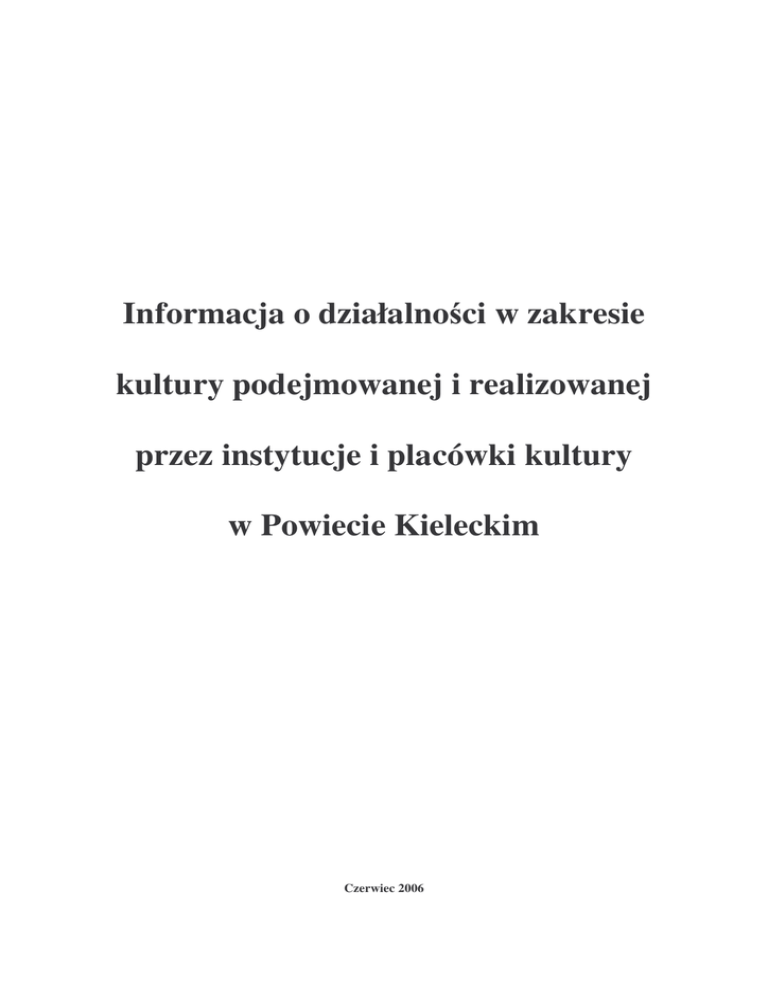 Informacja o działalno ci w zakresie kultury podejmowanej i realizowanej przez instytucje i placówki kultury w Powiecie Kieleckim Czerwiec 2006 Celem przedstawionego materiału jest zapoznanie Rady Powiatu z imprezami kulturalnymi organizowanymi przez Wydział Edukacji, Kultury i Sportu, gminy Powiatu Kieleckiego, instytucje, placówki kultury, organizacje i stowarzyszenia na terenie Powiatu Kieleckiego w latach 2003 – 2005. Materiał wskazuje na ró norodno form działalno ci kulturalnej organizowanej dla dzieci, młodzie y szkolnej i dorosłych. W organizacj tych imprez zaanga owane s obok instytucji i placówek kulturalnych równie towarzystwa, stowarzyszenia, Koła Gospody Wiejskich i organizacje młodzie owe. Wi kszo imprez na przestrzeni poprzednich lat stała si imprezami cyklicznymi skupiaj c coraz wi ksz liczb odbiorców. W poszczególnych latach szereg imprez otrzymywało wsparcie finansowe z bud etu Powiatu. Imprezy organizowane były wspólnie z gminami, szkołami, organizacjami i towarzystwami działaj cymi na terenie Powiatu Kieleckiego. Cz z tych imprez przyj ła form cyklicznych i jest kontynuowana. Powiat Kielecki, jeden z najwi kszych w kraju, najwi kszy w granicach województwa wi tokrzyskiego, zajmuje 2 247 km2, czyli jedn pi ta jego powierzchni i obejmuje 19 gmin – Bodzentyn, Ch ciny i Chmielnik, b d ce zarazem o rodkami miejskim oraz Bieliny, Daleszyce, Górno, Łagów, Łopuszno, Masłów, Miedziana Góra, Mniów, Morawica, Nowa Słupia, Piekoszów, Pierzchnica, Raków, Sitkówka – Nowiny, Strawczyn, Zagna sk. Powiat kielecki zamieszkuje 194,1 tys. osób. Wi cej ludno ci ma tylko powiat grodzki Kielce, zarazem stolica regionu, gdzie siedzib ma Starostwo Powiatowe w Kielcach. Z chwil powstania Powiatu Kieleckiego zostały nakre lone zadania w zakresie działalno ci kulturalnej i realizowane w my l ustawy z dnia 25 pa dziernika 1991 roku o organizowaniu i prowadzeniu działalno ci kulturalnej. Podstawy działalno ci kulturalnej Powiat oparł na współpracy z istniej cymi ju instytucjami i organizacjami kultury takimi jak: Wojewódzki Dom Kultury w Kielcach, Wojewódzka Biblioteka Publiczna w Kielcach, Muzeum im. Henryka Sienkiewicza w Obl gorku – oddział Muzeum Narodowego w Kielcach, Muzeum Wsi Kieleckiej, wi tokrzyski Wojewódzki Konserwator Zabytków, Zwi zek Literatów Polskich, Towarzystwo Uniwersytetów Ludowych, Ludowe Towarzystwo Naukowo – Kulturalne. Realizuj c zadania wynikaj ce z ustawy o samorz dzie powiatowym zawarto w dniu 1 czerwca 1999 roku umow z Wojewódzk Bibliotek Publiczn w Kielcach w sprawie realizacji przez ni kieleckiego. zada Zadania Powiatowej Biblioteki Publicznej dla mieszka ców powiatu zawarte w umowie dotycz gromadzenia, opracowywania i udost pniania materiałów bibliotecznych, pełnienie funkcji o rodka informacji, udzielanie 2 pomocy instrukcyjno – merytorycznej i szkoleniowej oraz sprawowanie nadzoru merytorycznego w zakresie gromadzenia i upowszechniania informacji bibliograficznych, a tak e działalno ci naukowo – badawczej. Praca z ksi k uczy prawdziwego spojrzenia na polszczyzny. Dlatego powinni my przywi zywa du wiat, my lenia i poprawnej wag do czytelnictwa, zwłaszcza przez młodzie i dzieci. Sie bibliotek publicznych na terenie powiatu kieleckiego od kilku lat utrzymuje si na tym samym poziomie tj. działa 49 bibliotek publicznych, w tym 30 filii. W 2005 roku 2 biblioteki poprawiły warunki lokalowe w Zagna sku i Sitkówce – Nowinach a w trzecim kwartale 2005 roku w Daleszycach i Krajnie nast piły zmiany lokalu. W pierwszym półroczu 2005 roku do bibliotek publicznych powiatu kieleckiego zakupiono 3923 woluminów o 148 mniej ni w analogicznym okresie minionego roku. W drugim półroczu 2005 roku najmniej woluminów zakupiły MBP Bodzentyn – 0, GBP Raków – 6, MBP Ch ciny – 7, MBP Chmielnik – 12, GBP Masłów – 31. Najwi cej zakupiły GBP Piekoszów – 568, GBP Pierzchnica – 495, GBP Zagna sk – 445, GBP Daleszyce 382 woluminy. Wska nik zakupu ksi ek na 100 mieszka ców wyniósł 2,0 wol, mniejszy o 0,1 od ubiegłego roku. W ramach zawartej umowy z Wojewódzk Bibliotek Publiczn w Kielcach corocznie przekazywane s rodki finansowe na zakup ksi gozbioru, z którego korzysta młodzie z terenu powiatu kieleckiego. Ponadto do ksi gozbioru Wojewódzkiej Biblioteki Publicznej w Kielcach zostały przekazane ksi ki wydane przez Starostwo Powiatowe, m.in. „Wybór wierszy” Stefana eromskiego opracowany przez Jana Chmielewskiego, „Patriotyzm słowem znaczony” El biety Stec „W stulecie Nagrody Nobla dla Henryka Sienkiewicza” Lidii Putowskiej. Działalno w zakresie kultury wspomagana jest przez Wojewódzki Dom Kultury w Kielcach, z którym Powiat zawarł umow 22 listopada 1999 roku. Wojewódzki Dom Kultury udziela mi dzy innymi pomocy programowej, doradczo – metodycznej, szkoleniowej i organizacyjnej instytucjom kultury na terenie powiatu. Udziela pomocy w zakresie zakładania zespołów folklorystycznych, repertuaru, sztuki ludowej, muzyki, choreografii dla zespołów i solistów. cisła współpraca z Wojewódzkim Domem Kultury w Kielcach zaowocowała mi dzy innymi organizacj konkursów recytatorskich o zasi gu powiatowym, wojewódzkim i ogólnopolskim. Do wspólnie organizowanych imprez z Wojewódzkim Domem Kultury nale Przegl d Kol dników, organizacja Eliminacji Powiatowych do Mi dzynarodowych Buskich Spotka z Folklorem, konkursy recytatorskie na ró nych szczeblach, warsztaty dla zespołów folklorystycznych powiatu kieleckiego. 3 Do 2004 roku gminy powiatu kieleckiego otrzymywały z bud etu Powiatu dofinansowanie lokalnych uroczysto ci miejsko – gminnych i gminnych. Od 2005 roku realizuj c ustaw o po ytku publicznym i wolontariacie Starostwo Powiatowe cz zada z zakresu kultury realizuje samodzielnie, zgodnie z wykazem imprez na dany rok kalendarzowy. Pozostałe przedsi wzi cia realizowane s poprzez powierzenie lub wspieranie zada w drodze ogłoszenia otwartego konkursu ofert. W 2005 