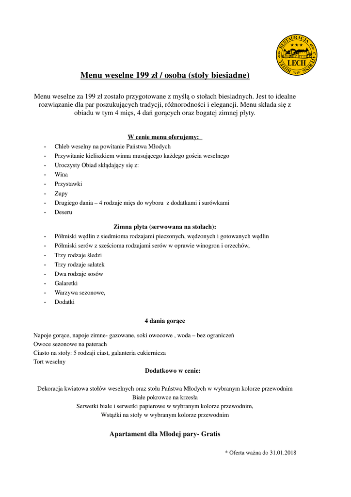 Menu weselne 199 zł / osoba (stoły biesiadne) Menu weselne za 199 zł zostało przygotowane z myślą o stołach biesiadnych. Jest to idealne rozwiązanie dla par poszukujących tradycji, różnorodności i elegancji. Menu składa się z obiadu w tym 4 mięs, 4 dań gorących oraz bogatej zimnej płyty. • • • • • • • • • • • • • • • • W cenie menu oferujemy: Chleb weselny na powitanie Państwa Młodych Przywitanie kieliszkiem winna musującego każdego gościa weselnego Uroczysty Obiad skłądający się z: Wina Przystawki Zupy Drugiego dania – 4 rodzaje mięs do wyboru z dodatkami i surówkami Deseru Zimna płyta (serwowana na stołach): Półmiski wędlin z siedmioma rodzajami pieczonych, wędzonych i gotowanych wędlin Półmiski serów z sześcioma rodzajami serów w oprawie winogron i orzechów, Trzy rodzaje śledzi Trzy rodzaje sałatek Dwa rodzaje sosów Galaretki Warzywa sezonowe, Dodatki 4 dania gorące Napoje gorące, napoje zimne- gazowane, soki owocowe , woda – bez ograniczeń Owoce sezonowe na paterach Ciasto na stoły: 5 rodzaji ciast, galanteria cukiernicza Tort weselny Dodatkowo w cenie: Dekoracja kwiatowa stołów weselnych oraz stołu Państwa Młodych w wybranym kolorze przewodnim Białe pokrowce na krzesła Serwetki białe i serwetki papierowe w wybranym kolorze przewodnim, Wstążki na stoły w wybranym kolorze przewodnim Apartament dla Młodej pary- Gratis * Oferta ważna do 31.01.2018