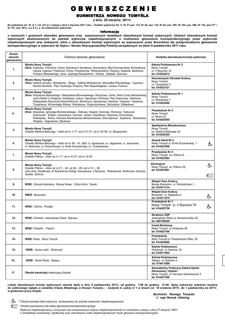 OBWIESZCZENIE BURMISTRZA NOWEGO TOMYŚLA z dnia 29 sierpnia 2011r. Na podstawie art. 16 § 1 i art. 61a § 1 ustawy z dnia 5 stycznia 2011 roku – Kodeks wyborczy/ Dz. U. Nr 21 poz. 112, Nr 26, poz. 134, Nr 94, poz. 550, Nr 102, poz. 588, Nr 134, poz.777 i Nr 147, poz. 881), p o d a j ę do wiadomości wyborców informację o numerach i granicach obwodów głosowania oraz wyznaczonych siedzibach obwodowych komisji wyborczych, lokalach obwodowych komisji wyborczych dostosowanych do potrzeb wyborców niepełnosprawnych, o możliwości głosowania korespondencyjnego przez wyborców niepełnosprawnych oraz wskazanie, które z obwodowych komisji wyborczych są wyznaczone przez Burmistrza dla przeprowadzenia głosowania korespondencyjnego w wyborach do Sejmu i Senatu Rzeczypospolitej Polskiej zarządzonych na dzień 9 października 2011 roku. Numer obwodu głosowania Granica obwodu głosowania Siedziba obwodowej komisji wyborczej 1. Miasto Nowy Tomyśl, Ulice: Azaliowa, Chmielna, Cicha, Kamienna, Kanałowa, Komunalna, Marii Konopnickiej, Konwaliowa, Liliowa, Łąkowa, Piaskowa, Polna, Powstańców Wielkopolskich, Różana, Sadowa, Spokojna, Floriana Ślósarskiego, Jana i Jędrzeja Śniadeckich, Wodna, Zakątek, Żwirowa. Szkoła Podstawowa Nr 2 Nowy Tomyśl ul. 3 Stycznia 12, tel. 614422614 2. Miasto Nowy Tomyśl, Ulice: Adama Asnyka, Bohaterów, Długa, Adama Mickiewicza, Marszałka Piłsudskiego, Cypriana Kamila Norwida, Plac Fryderyka Chopina, Plac Niepodległości, Juliana Tuwima, Nowotomyski Ośrodek Kultury Nowy Tomyśl ul. Tysiąclecia 3 tel. 614423121 3. Miasto Nowy Tomyśl, Ulice: Wojciecha Barteckiego, Władysława Broniewskiego, Brzozowa, Celna, Marii Curie Skłodowskiej, Jana Pawła II, Kolejowa, Kwiatowa, Leśna, Ogrodowa, Olchowa, Plac Dworcowy, Radosna, Władysława Reymonta,Rzemieślnicza, Słoneczna, Spacerowa, Szkolna, Targowa, Topolowa, Tysiąclecia, Wincentego Witosa. Wierzbowa, Wypoczynkowa, Zachodnia, Zakładowa. Szkoła Podstawowa Nr 1 Nowy Tomyśl ul. Wierzbowa 1 tel. 614422468 Miasto Nowy Tomyśl Ulice: Akacjowa, Ignacego Baranowskiego, Daliowa, Dojazd, Gronowa, Klonowa, Tadeusza Kościuszki, Krótka, Lawendowa, Łanowa, Nowa, Osiedlowa, Paprocka, Poznańska, Półwiejska, Rolna, Henryka Sienkiewicza,Słonecznikowa, Storczykowa, Szpitalna, Świerkowa, Wiejska, Zagrodowa, Zbożowa. Przedszkole Nr 5 Nowy Tomyśl ul. Nowa 23 tel. 614425030 5. Miasto Nowy Tomyśl, Osiedle Stefana Batorego – bloki od nr 1-17, od nr 21-31, od nr 33-38 i ul. Zbąszyńska Spółdzielnia Mieszkaniowa Nowy Tomyśl os. Stefana Batorego 32 tel. 614422525 6. Miasto Nowy Tomyśl, Osiedle Stefana Batorego – bloki od nr 39 – 51, 50A, ul. Agrestowa, ul. Jagodowa, ul. Jeżynowa, ul. Malinowa, ul. Poziomkowa, ul. Emilii Sczanieckiej, ul. Truskawkowa. Zespół Szkół Nr 2 Nowy Tomyśl ul. Emilii Sczanieckiej 1 tel. 614423398 7. Miasto Nowy Tomyśl, Osiedle Północ – bloki od nr 1-7, od nr 9-12 i od nr 14-20 Przedszkole Nr 4 Nowy Tomyśl os. Północ 8, tel. 614423563 8. Miasto Nowy Tomyśl, Osiedle Północ – bloki od nr 21 – 24, od 26 – 29 i od nr 31 – 36 oraz ulice: Działkowa, dr Kazimierza Hołogi, Koszykowa, 3 Stycznia, Wiatrakowa, Wiklinowa, Zacisze, Zaułek, Zielona. 9. WSIE: Boruja Kościelna, Boruja Nowa, Cicha Góra, Szarki 10. WIEŚ: Bukowiec, 11. WSIE: Glinno, Przyłęk 12. WSIE: Grubsko, Jastrzębsko Stare, Sękowo Strażnica OSP Jastrzębsko Stare ul. Nowotomyska 25 tel. 662108209 13. WSIE: Chojniki , Paproć Urząd Skarbowy Nowy Tomyśl ul. Kolejowa 38 tel. 614423166 14. WSIE: Róża, Stary Tomyśl Przedszkole Stary Tomyśl ul. Powstańców Wlkp. 25 tel. 614425066 15. WSIE: Kozie Laski, Wytomyśl Szkoła Podstawowa Wytomyśl ul. Szkolna 18, tel. 614411924 16. WSIE: Nowa Róża, Sątopy Szkoła Podstawowa Sątopy ul. Szkolna 3, tel. 614411896 4. 17. Obwód zamknięty obejmujący Szpital Gimnazjum Nowy Tomyśl os. Północ 25, tel. 614421061 Wiejski Dom Kultury Boruja Kościelna ul. Wolsztyńska 1, tel. 614411314 Wiejski Dom Kultury Bukowiec ul. Sątopska 3 tel. 614411474 Przedszkole Nr 3 Nowy Tomyśl ul. 3 Stycznia 70 tel. 614422736 Samodzielny Publiczny Zakład Opieki Zdrowotnej / Szpital / Nowy Tomyśl, ul. Henryka Sienkiewicza 3 tel. 614427356 Lokale obwodowych komisji wyborczych otwarte będą w dniu 9 października 2011r. od godziny 7:00 do godziny 21:00. Spisy wyborców wyłożone zostaną do publicznego wglądu w siedzibie Urzędu Miejskiego w Nowym Tomyślu – budynek A, pokój nr 1 w dniach od 18 września 2011r. do 1 października do 2011r. w godzinach pracy Urzędu. Burmistrz Nowego Tomyśla /-/ mgr Henryk Helwing * Obwód posiada lokal wyborczy dostosowany do potrzeb wyborców niepełnosprawnych * Obwód wyznaczony dla celów głosowania korespondencyjnego Wyborca niepełnosprawny o znacznym lub umiarkowanym stopniu niepełnosprawności w rozumieniu ustawy z dnia 27 sierpnia 1997r. o rehabilitacji zawodowej i społecznej oraz zatrudnianiu osób niepełnosprawnych może głosować korespondencyjnie.