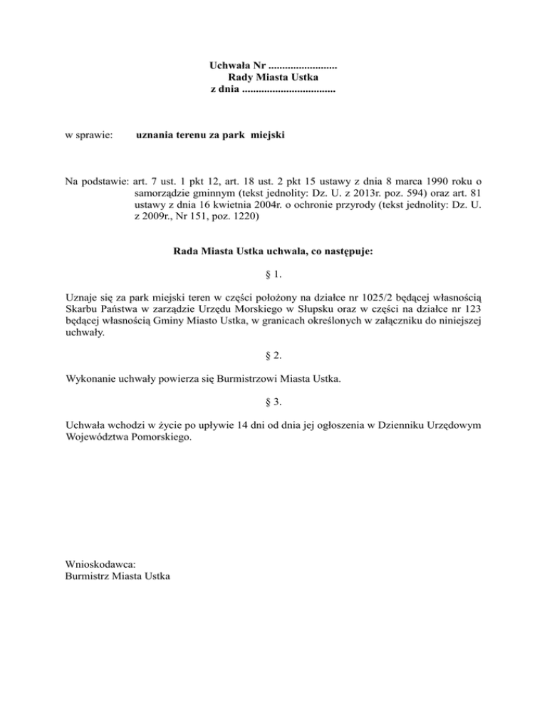 Uchwała Nr ......................... Rady Miasta Ustka z dnia .................................. w sprawie: uznania terenu za park miejski Na podstawie: art. 7 ust. 1 pkt 12, art. 18 ust. 2 pkt 15 ustawy z dnia 8 marca 1990 roku o samorządzie gminnym (tekst jednolity: Dz. U. z 2013r. poz. 594) oraz art. 81 ustawy z dnia 16 kwietnia 2004r. o ochronie przyrody (tekst jednolity: Dz. U. z 2009r., Nr 151, poz. 1220) Rada Miasta Ustka uchwala, co następuje: § 1. Uznaje się za park miejski teren w części położony na działce nr 1025/2 będącej własnością Skarbu Państwa w zarządzie Urzędu Morskiego w Słupsku oraz w części na działce nr 123 będącej własnością Gminy Miasto Ustka, w granicach określonych w załączniku do niniejszej uchwały. § 2. Wykonanie uchwały powierza się Burmistrzowi Miasta Ustka. § 3. Uchwała wchodzi w życie po upływie 14 dni od dnia jej ogłoszenia w Dzienniku Urzędowym Województwa Pomorskiego. Wnioskodawca: Burmistrz Miasta Ustka UZASADNIENIE do uchwały w sprawie uznania terenu jako park miejski 1. Istniejący stan prawny i faktyczny: Gmina Miasto Ustka posiada obowiązującą uchwałę Nr XI/73/99 Rady Miejskiej w Ustce z dnia 30 września 1999r. i uchwałę Nr XXXIII/272/2009 Rady Miasta Ustka z dnia 30 kwietnia 2009 roku w sprawie ustanowienia parków miejskich w mieście Ustka, które łącznie wskazują 9 obszarów objętych ochroną jako parki miejskie. Przedmiotowy obszar przeznaczony do uznania go za park miejski w obowiązującym miejscowym planie zagospodarowania przestrzennego Promenady Nadmorskiej w Ustce (uchwała Nr VI/30/2001 Rady Miejskiej w Ustce z dnia 28 czerwca 2001 roku) określony jest jako park zdrojowy i park leśny. We fragmentach na terenie tym plan miejscowy dopuszcza przeznaczenie towarzyszące związane z infrastrukturą komunalną i usługową. Większa część obszaru przeznaczonego pod park miejski została zagospodarowana w sposób trwały ciągami komunikacyjnymi, w tym ścieżkami pieszymi i rowerowymi. 2. Różnice między dotychczasowym a projektowanym stanem prawnym: Dotychczasowe parki miejskie usytuowane są głównie w obszarze historycznego centrum Ustki, a także park u zbiegu ulic: Słupskiej i Wróblewskiego oraz park u zbiegu ulic: Kościelniaka i Wilczej. Niniejsza uchwała ustanowi dodatkowy teren uznany za park w bezpośrednim sąsiedztwie morza. 3. Skutki społeczne i gospodarcze: Podjęcie uchwały umożliwi stworzenie nowego obszaru parku, który docelowo będzie zagospodarowany pod cele rekreacyjne, sportowe oraz turystyczne i stanowić będzie atrakcyjne miejsce wypoczynku dla mieszkańców i turystów. 4. Informacja o źródłach finansowania: Urządzenie nowego terenu parkowego zobowiąże gminę do szczególnej dbałości o jego wizerunek, co wymagać będzie zabezpieczenia środków w budżecie miasta na kolejne lata.