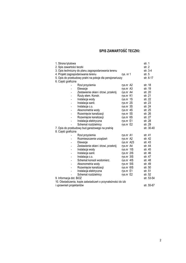 SPIS ZAWARTOŚĆ TECZKI: 1. Strona tytułowa 2. Spis zawartości teczki 3. Opis techniczny do planu zagospodarowania terenu 4. Projekt zagospodarowania terenu rys. nr 1 5. Opis do przebudowy pralni na pokoje dla pensjonariuszy 6. Część graficzna Rzut przyziemia rys.nr A2 Elewacje rys.nr A3 Zestawienie okien i drzwi, przekrój rys.nr A4 Rzuty elem. Konstr. rys.nr K1 Instalacja wody rys.nr 1S Instalacja sanit. rys.nr 2S Instalacja c.o. rys.nr 3S Aksonometria wody rys.nr 4S Rozwinięcie kanalizacji rys.nr 5S Rozwinięcie kanalizacji rys.nr 6S Instalacja elektryczna rys.nr E1 Schemat rozdzielnicy rys.nr E2 7. Opis do przebudowy bud.garaŜowego na pralnię 8. Część graficzna Rzut przyziemia rys.nr A1 Rozmieszczenie urządzeń rys.nr A2 Elewacje rys.nr A23 Zestawienie okien i drzwi, przekrój rys.nr A4 Instalacja wody rys.nr 1IS Instalacja sanit. rys.nr 2IS Instalacja c.o. rys.nr 3IS Schemat konsoli wodomierz. rys.nr 4IS Aksonometria wody rys.nr 5IS Rozwinięcie kanalizacji rys.nr 6IS Instalacja elektryczna rys.nr E1 Schemat rozdzielnicy rys.nr E2 9. Informacja dot. BiOZ 10. Oświadczenia, kopie zaświadczeń o przynaleŜności do izb i uprawnień projektantów str. 1 str. 2 str. 3-4 str. 5 str. 6-17 str. 18 str. 19 str. 20 str. 21 str. 22 str. 23 str. 24 str. 25 str. 26 str. 27 str. 28 str. 29 str. 30-40 str. 41 str. 42 str. 43 str. 44 str. 45 str. 46 str. 47 str. 48 str. 49 str. 50 str. 51 str. 52 str. 53-54 str. 55-67 2 OPIS TECHNICZNY do PROJEKTU BUDOWLANEGO: ZMIANA SPOSOBU UśYTKOWANIA POMIESZCZEŃ PRALNI NA POKOJE DLA PENSJONARIUSZY. ZMIANA SPOSOBU UśYTKOWANIA BUDYNKU WARSZTATOWO-GARAśOWEGO NA PRALNIĘ. 1. Podstawa opracowania: Zlecenie Inwestora Miejscowy plan zagospodarowania przestrzennego Prawo Budowlane – ustawa z dnia 07 lipca 1994r. – nowela z dnia 27 marca 2003 r. Dz.U. RP nr 80 z 2003 r. poz.718 Rozporządzenie Ministra Infrastruktury z dnia 12 kwietnia 2002 r. w sprawie warunków technicznych , jakim powinny odpowiadać budynki i ich usytuowanie – Dz. U. RP nr 75 z dnia 15 czerwca 2002 r. poz. 690 ( zmiany – Dz.U. z 2003 nr 33 poz. 270 oraz Dz.U. 109 z 2004 poz. 1156 ) Rozporządzenie Ministra Infrastruktury z dnia 03 lipca 2003 r. w sprawie szczegółowego zakresu i formy projektu budowlanego – Dz. U. RP nr 120 z 2003 r. poz. 1133 – R 63 PN- ISO 9836 – Właściwości uŜytkowe w budownictwie . Określanie i obliczanie wskaźników powierzchniowych i kubaturowych PN-83/B-03430 – Wentylacja w budynkach mieszkalnych , zamieszkania zbiorowego i uŜyteczności publicznej – wymagania. Rozporządzenie MSW i A z dnia 16 czerwca 2003 r. w sprawie uzgadniania projektu budowlanego pod względem ochrony przeciwpoŜarowej. (art. 6 ust. 2) (Dz. U. Nr 121, poz. 1138) Rozporządzenie Ministra Spraw Wewnętrznych i Administracji z dnia 16 czerwca 2003 r. w sprawie ochrony przeciwpoŜarowej budynków, innych obiektów budowlanych i terenów. (art. 13 ust. 1) (Dz. U. Nr 121, poz. 1138) Rozporządzenie Ministra Polityki Społecznej z dnia 19 października 2005 r. w sprawie domów pomocy społecznej (Dz. U. Z dnia 31 października 2005 roku ) 3 OPIS DO PROJEKTU ZAGOSPODAROWANIA DZIAŁKI: 1.1. Przedmiot inwestycji: Przedmiotem inwestycji jest zmiana sposobu uŜytkowania pomieszczeń pralni na pokoje dla pensjonariuszy oraz miana sposobu uŜytkowania budynku warsztatowo-garaŜowego na pralnię. 1.2. Istniejący stan zagospodarowania działki: Na działce nr 324/2 w miejscowości Wroniniec 59, istnieje dwukondygnacyjny budynek DPS, w którym mieści się funkcja niezbędna do zamieszkania, wyŜywienia i szeroko pojętej opieki nad pensjonariuszami. Elementem parterowym, dobudowanym do głównego budynku jest obecnie funkcjonująca pralnia ( przeprojektowywana na pokoje dla mieszkańców domu ). Oprócz tego na działce znajduje się parterowy budynek garaŜowo-warsztatowy ( adaptowany w niniejszym projekcie na pralnię ). Wjazd na teren działki odbywa się z drogi nr 324, prowadzącej przez miejscowość Wroniniec na trasie Góra – Szlichtingowa. Na terenie działki znajdują się utwardzone dojazdy do poszczególnych obiektów, parkingi dla samochodów pracowników oraz elementy małej architektury ( ławki, pergole i wiaty ogrodowe ) 1.3. Projektowane zagospodarowanie działki: Przedsięwzięte na działce prace projektowe są ograniczone do adaptacji części pomieszczeń w istniejących obiektach. Wyjątkiem jest niewielki łącznik dobudowany w naroŜniku pomiędzy istniejącym wejściem do budynku a adaptowanymi pomieszczeniami obecnej pralni. 1.4. Zestawienie powierzchni działki: - powierzchnia zabudowy pomieszczeń adaptowanych na pokoje dla pensjonariuszy - 241,00 m2 - powierzchnia zabudowy budynku garaŜowego adaptowanego na pralnię - 93,42 m2 - całkowita powierzchnia zabudowy pomieszczeń adaptowanych - 334,42 m2 1.5. Dane na temat ochrony konserwatorskiej: Na przedmiotowej działce nie istnieją Ŝadne obiekty wpisane do rejestru zabytków, a teren nie jest objęty strefą nadzoru konserwatorskiego Państwowej SłuŜby Ochrony Zabytków. Brak zapisów w wypisie z planu 1.6. Wpływ eksploatacji górniczej na działkę Teren Leszna nie jest obszarem występowania tzw. szkód górniczych i w związku z tym zjawiska tego rodzaju na terenie działki, będącej przedmiotem opracowania, nie występują. 1.7. Przewidywane zagroŜenia dla środowiska oraz higieny i zdrowia uŜytkowników Charakter budynku oraz sposób jego uŜytkowania nie stwarzają zagroŜenia dla środowiska oraz higieny i zdrowia uŜytkowników. W projektowanym obiekcie nie występują Ŝadne czynniki powodujące zagroŜenie a jedynym źródłem emisji na zewnątrz jest kotłownia gazowa spełniająca wymogi odnośnych przepisów mgr inŜ. arch. Maciej Kubiak 4 OPIS DO PROJEKTU ARCHITEKTONICZNO-BUDOWLANEGO ZMIANY SPOSOBU UśYTKOWANIA POMIESZCZEŃ PRALNI NA POKOJE DLA PENSJONARIUSZY. 1.1. Ogólne załoŜenia architektoniczne: Przebudowa istniejącej obecnie pralni na pokoje dla pensjonariuszy pol