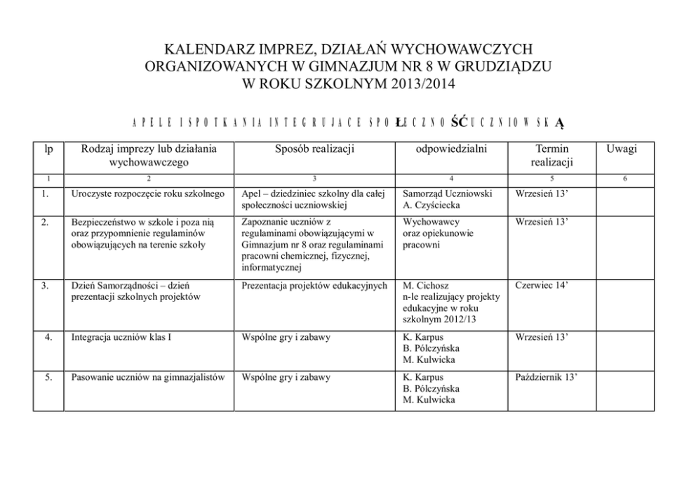 KALENDARZ IMPREZ, DZIAŁAŃ WYCHOWAWCZYCH ORGANIZOWANYCH W GIMNAZJUM NR 8 W GRUDZIĄDZU W ROKU SZKOLNYM 2013/2014 APELE I SPOTKANIA INTEGRUJACE SPOŁECZNOŚĆ UCZNIOWSKĄ lp Rodzaj imprezy lub działania wychowawczego Sposób realizacji odpowiedzialni Termin realizacji 1 2 3 4 5 1. Uroczyste rozpoczęcie roku szkolnego Apel – dziedziniec szkolny dla całej społeczności uczniowskiej Samorząd Uczniowski A. Czyściecka Wrzesień 13’ 2. Bezpieczeństwo w szkole i poza nią oraz przypomnienie regulaminów obowiązujących na terenie szkoły Zapoznanie uczniów z regulaminami obowiązującymi w Gimnazjum nr 8 oraz regulaminami pracowni chemicznej, fizycznej, informatycznej Wychowawcy oraz opiekunowie pracowni Wrzesień 13’ 3. Dzień Samorządności – dzień prezentacji szkolnych projektów Prezentacja projektów edukacyjnych M. Cichosz n-le realizujący projekty edukacyjne w roku szkolnym 2012/13 Czerwiec 14’ 4. Integracja uczniów klas I Wspólne gry i zabawy K. Karpus B. Pólczyńska M. Kulwicka Wrzesień 13’ 5. Pasowanie uczniów na gimnazjalistów Wspólne gry i zabawy K. Karpus B. Pólczyńska M. Kulwicka Październik 13’ Uwagi 6 6. Dyskoteka szkolna Zabawa integracyjna dla społeczności uczniowskiej Samorząd Uczniowski A. Czyściecka Wychowawcy kl. I Wrzesień 13’ 7. Warsztaty dla gimnazjalistów „Dbam o bezpieczeństwo własne i innych ludzi” Poprawa bezpieczeństwa uczniów w szkole i poza nią J. Blajerska A. Czyściecka Wrzesień 13’ 8. Wybory do Samorządu Uczniowskiego -Rzecznika Praw Ucznia -Opiekuna Samorządu Uczniowskiego Przeprowadzenie wyborów uzupełniających do SU wśród społeczności uczniowskiej, Rzecznika Praw Ucznia i opiekuna SU wśród nauczycieli Opiekun SU Czyściecka Maj/czerwiec 14’ 9. Dyskoteka szkolna Zabawa integracyjna dla społeczności uczniowskiej Samorząd Uczniowski A. Czyściecka Wychowawcy kl. II Październik 13’ 10. Dzień Edukacji Narodowej Akademia szkolna A. Kozicka n-l muzyki Październik 13’ 11. Pasowanie pierwszoklasistów Włączenie pierwszoklasistów do grona społeczności uczniowskiej Samorząd Uczniowski Aldona Czyściecka Październik 13’ 12. Dzień Papieski M. Cichosz Październik 13’ 13. Dyskoteka szkolna Zabawa integracyjna dla społeczności uczniowskiej Samorząd Uczniowski A. Czyściecka Wychowawcy kl. III Listopad 13’ 14. Święto Niepodległości Akademia szkolna A. Węgielewska B. Półczyńska n-l muzyki Listopad 13’ 15. Szkolne Mikołajki Spotkanie integracyjne Samorząd Uczniowski Aldona Czyściecka Grudzień 13’ 16. Wigilia szkolna – przedstawienie świąteczne Spotkanie opłatkowe społeczności uczniowskiej – przedstawienie świąteczne Grudzień 13’ M. Cichosz 17. Powrót Grudziądza do Macierzy wieczornica A. Czyściecka J. Blajerska Styczeń 14’ II semestr Warsztaty dla szkół podstawowych „Parki 18. narodowe na świecie” Integracja środowiska lokalnego J. Blajerska A. Czyściecka 19. Międzyszkolne spotkanie Kół Caritas Propagowanie idei wolontariatu M. Cichosz Kwiecień 14’ 20. Szkolne walentynki Poczta walentynkowa, loteria , konkurs plastyczny K. Karpus Luty 14’ 21. Dyskoteka walentynkowa Zabawa integracyjna dla społeczności uczniowskiej Samorząd Uczniowski A. Czyściecka Wychowawcy kl. II Luty 14’ 21. ŚWIATOWY DZIEŃ ZIEMII Konkursy, warsztaty dla gimnazjalistów Wych. klas J. Blajerska A. Czyściecka K. Karpus Maj/czerwiec 14’ 22. Tydzień Praw Dziecka Obchody Dnia Dziecka Samorząd Uczniowski pedagog Maj 14’ 23. Konstytucja 3 Maja Akademia szkolna A. Węgielewska Maj 14’ 24. Zakończenie roku szkolnego Apel dla społeczności uczniowskiej A. Kozicka n-l muzyki i plastyki Czerwiec 14’ 25. Międzynarodowy Miesiąc Bibliotek Szkolnych Zabawy, konkursy czytelnicze, zorganizowanie akcji „Podaruj bibliotece książkę” J. Pierzynowska Październik 13’ 26. Szkolne rekolekcje wielkopostne Przygotowanie do świąt Wielkanocnych M. Cichosz Kwiecień 14’ 27. Światowy Dzień Książki i Praw Autorskich Pogadanka przez radiowęzeł J. Pierzynowska Kwiecień 14’ 28. I Dzień Wiosny Gry i zabawy integrujące społeczność uczniowską A. Czyściecka wychowawcy Kwiecień 14’ 29. Wspomnienie o Janie Pawle II Uroczysty apel A. Kozicka Maj 14’ 30. Dzień Dziecka Gry i zabawy integrujące społeczność uczniowską A. Czyściecka A. Langowski Czerwiec 14’ 31. Dni Kopernikowskie Warsztaty dla gimnazjalistów; wycieczka do planetarium J.Blajerska K. Karpus A. czyściecka Rok szkolny 2013/14 32. Warsztaty „Bukiety jesienne” Integracja społeczności uczniowskiej – wspólne wykonanie bukietów jesiennych oraz przygotowanie gazetek klasowych wych. klas J. Blajerska A. Czyściecka Październik 13’3 33. Promocja szkoły Dzień otwarty szkoły A. Czyściecka Wszyscy nauczyciele Prowadzenie strony internetowe Ł. Kowalewski Festyn szkolny n-le wych. fizycznego Rok szkolny 2013/14 PRZEPROWADZANE NA TERENIE SZKOŁY AKCJE HUMANITARNYCH l p Rodzaj imprezy lub działania wychowawczego Sposób realizacji odpowiedzialni Termin realizacji Uwagi 1 2 3 4 5 6 1. Selektywna zbiórka surowców wtórnych Przeprowadzenie kampanii na rzecz selektywnej zbiórki odpadów S. Wiśniewska J. Pirzynowska Rok szkolny 2013/2014 2. Udział w akcji „sprzątanie świata 2011” Zadbanie o otaczające środowisko przyrodnicze J.Blajerska A. Czyściecka n-le wych. fizycz. Wrzesień 14’ 3. „I Ty możesz zostać św. Mikołajem” Zbiórka zabawek, książek dla dzieci z domu dziecka M. Cichosz Grudzień 13’ 4. Pomagamy godnie przetrwać zwierzętom w schronisku w Węgrowie Współpraca ze schroniskiem K. Karpus E.Gołębiewska Rok szkolny 2013/2014 KONKURSY lp Rodzaj imprezy lub działania wychowawczego Sposób realizacji odpowiedzialni Termin realizacji Uwa gi 1 2 3 4 5 6 1. „Czy znasz prawa i obowiązki panujące w naszym gimnazjum” Przeprowadzenie konkursu wśród uczniów klas I ze znajomości praw i obowiązków Samorząd Uczniowski A. Czyściecka Peda