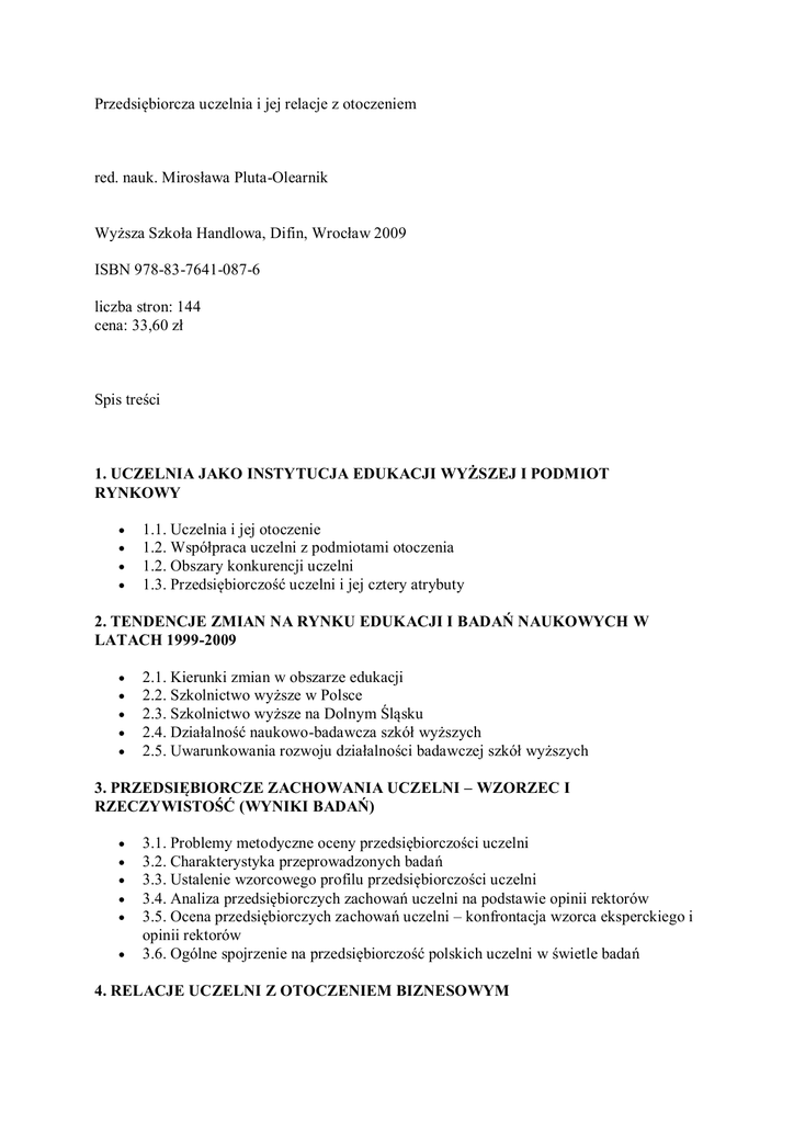 Przedsiębiorcza uczelnia i jej relacje z otoczeniem red. nauk. Mirosława Pluta-Olearnik Wyższa Szkoła Handlowa, Difin, Wrocław 2009 ISBN 978-83-7641-087-6 liczba stron: 144 cena: 33,60 zł Spis treści 1. UCZELNIA JAKO INSTYTUCJA EDUKACJI WYŻSZEJ I PODMIOT RYNKOWY 1.1. Uczelnia i jej otoczenie 1.2. Współpraca uczelni z podmiotami otoczenia 1.2. Obszary konkurencji uczelni 1.3. Przedsiębiorczość uczelni i jej cztery atrybuty 2. TENDENCJE ZMIAN NA RYNKU EDUKACJI I BADAŃ NAUKOWYCH W LATACH 1999-2009 2.1. Kierunki zmian w obszarze edukacji 2.2. Szkolnictwo wyższe w Polsce 2.3. Szkolnictwo wyższe na Dolnym Śląsku 2.4. Działalność naukowo-badawcza szkół wyższych 2.5. Uwarunkowania rozwoju działalności badawczej szkół wyższych 3. PRZEDSIĘBIORCZE ZACHOWANIA UCZELNI – WZORZEC I RZECZYWISTOŚĆ (WYNIKI BADAŃ) 3.1. Problemy metodyczne oceny przedsiębiorczości uczelni 3.2. Charakterystyka przeprowadzonych badań 3.3. Ustalenie wzorcowego profilu przedsiębiorczości uczelni 3.4. Analiza przedsiębiorczych zachowań uczelni na podstawie opinii rektorów 3.5. Ocena przedsiębiorczych zachowań uczelni – konfrontacja wzorca eksperckiego i opinii rektorów 3.6. Ogólne spojrzenie na przedsiębiorczość polskich uczelni w świetle badań 4. RELACJE UCZELNI Z OTOCZENIEM BIZNESOWYM 4.1. Charakterystyka przeprowadzonych badań 4.2. Ocena relacji uczelni z otoczeniem biznesowym na podstawie opinii przedsiębiorców 4.3. Ocena relacji uczelni z otoczeniem biznesowym na podstawie opinii naukowców 4.4. Perspektywy rozwoju relacji uczelni z ich otoczeniem biznesowym 5. NOWE FORMY WSPÓŁPRACY Z UDZIAŁEM UCZELNI ORAZ PRZEDSIĘBIORSTW – PERSPEKTYWA TEORETYCZNA 5.1. Współczesne koncepcje relacji instytucji edukacyjnych i przedsiębiorstw 5.2. Relacje nauka – praktyka w świetle badań procesu innowacyjnego 5.3. Klaster jako urzeczywistnienie trwałych relacji nauka – praktyka 5.4. Podsumowanie