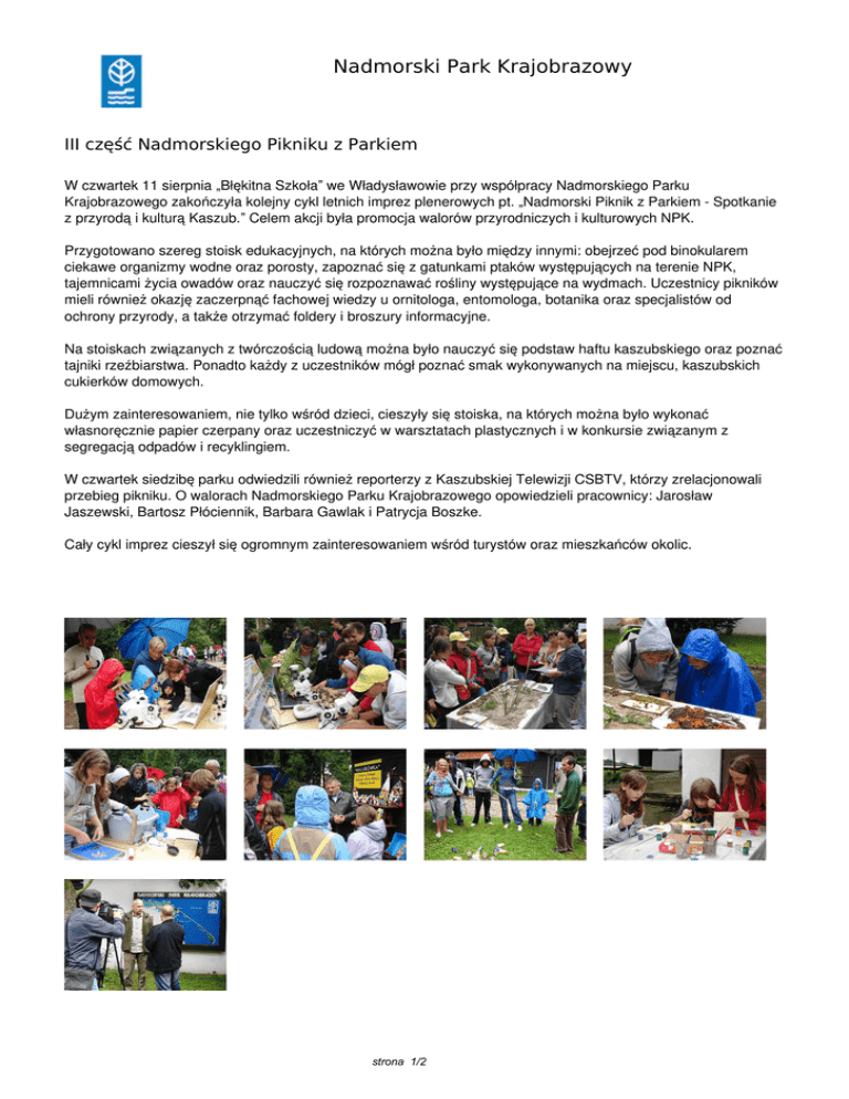 Nadmorski Park Krajobrazowy III część Nadmorskiego Pikniku z Parkiem W czwartek 11 sierpnia „Błękitna Szkoła” we Władysławowie przy współpracy Nadmorskiego Parku Krajobrazowego zakończyła kolejny cykl letnich imprez plenerowych pt. „Nadmorski Piknik z Parkiem - Spotkanie z przyrodą i kulturą Kaszub.” Celem akcji była promocja walorów przyrodniczych i kulturowych NPK. Przygotowano szereg stoisk edukacyjnych, na których można było między innymi: obejrzeć pod binokularem ciekawe organizmy wodne oraz porosty, zapoznać się z gatunkami ptaków występujących na terenie NPK, tajemnicami życia owadów oraz nauczyć się rozpoznawać rośliny występujące na wydmach. Uczestnicy pikników mieli również okazję zaczerpnąć fachowej wiedzy u ornitologa, entomologa, botanika oraz specjalistów od ochrony przyrody, a także otrzymać foldery i broszury informacyjne. Na stoiskach związanych z twórczością ludową można było nauczyć się podstaw haftu kaszubskiego oraz poznać tajniki rzeźbiarstwa. Ponadto każdy z uczestników mógł poznać smak wykonywanych na miejscu, kaszubskich cukierków domowych. Dużym zainteresowaniem, nie tylko wśród dzieci, cieszyły się stoiska, na których można było wykonać własnoręcznie papier czerpany oraz uczestniczyć w warsztatach plastycznych i w konkursie związanym z segregacją odpadów i recyklingiem. W czwartek siedzibę parku odwiedzili również reporterzy z Kaszubskiej Telewizji CSBTV, którzy zrelacjonowali przebieg pikniku. O walorach Nadmorskiego Parku Krajobrazowego opowiedzieli pracownicy: Jarosław Jaszewski, Bartosz Płóciennik, Barbara Gawlak i Patrycja Boszke. Cały cykl imprez cieszył się ogromnym zainteresowaniem wśród turystów oraz mieszkańców okolic. strona 1/2 strona 2/2 Powered by TCPDF (www.tcpdf.org)