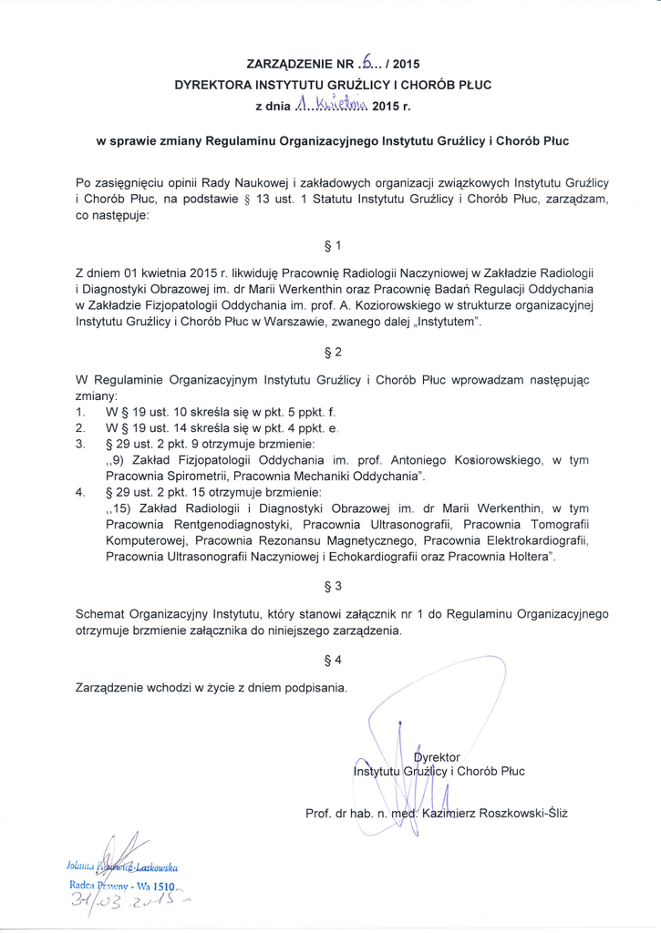 Z dniem 01 kwietnia 2015 r' likwiduję Pracownię Radiologii Naczyniowej w Zakładzie Radiologii