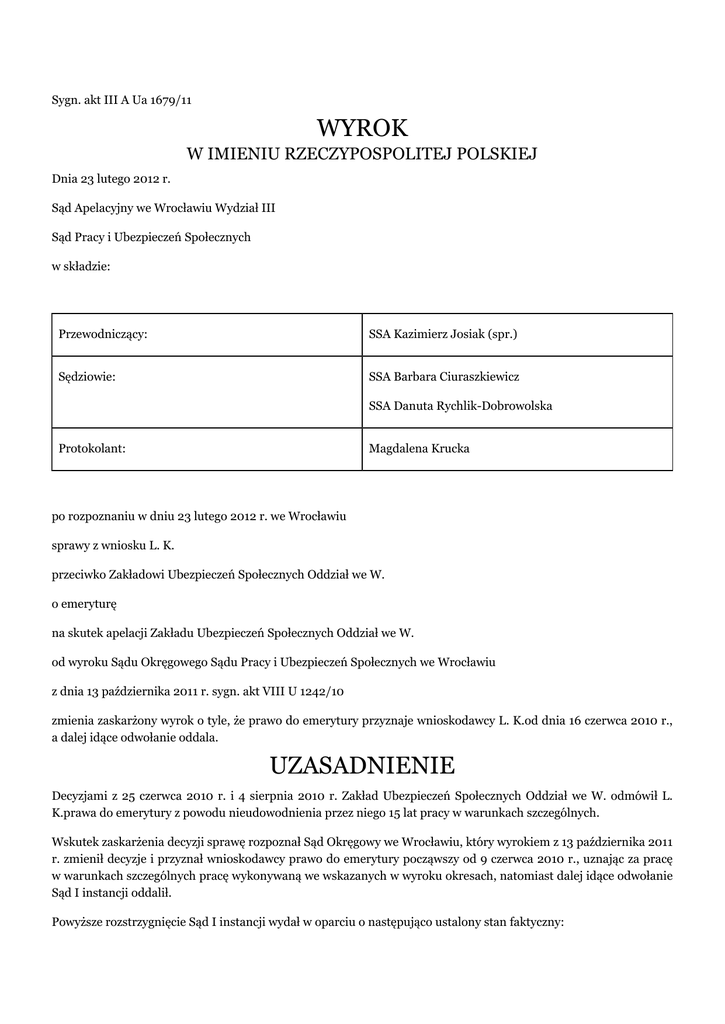Sygn. akt III A Ua 1679/11 WYROK W IMIENIU RZECZYPOSPOLITEJ POLSKIEJ Dnia 23 lutego 2012 r. Sąd Apelacyjny we Wrocławiu Wydział III Sąd Pracy i Ubezpieczeń Społecznych w składzie: Przewodniczący: SSA Kazimierz Josiak (spr.) Sędziowie: SSA Barbara Ciuraszkiewicz SSA Danuta Rychlik-Dobrowolska Protokolant: Magdalena Krucka po rozpoznaniu w dniu 23 lutego 2012 r. we Wrocławiu sprawy z wniosku L. K. przeciwko Zakładowi Ubezpieczeń Społecznych Oddział we W. o emeryturę na skutek apelacji Zakładu Ubezpieczeń Społecznych Oddział we W. od wyroku Sądu Okręgowego Sądu Pracy i Ubezpieczeń Społecznych we Wrocławiu z dnia 13 października 2011 r. sygn. akt VIII U 1242/10 zmienia zaskarżony wyrok o tyle, że prawo do emerytury przyznaje wnioskodawcy L. K.od dnia 16 czerwca 2010 r., a dalej idące odwołanie oddala. UZASADNIENIE Decyzjami z 25 czerwca 2010 r. i 4 sierpnia 2010 r. Zakład Ubezpieczeń Społecznych Oddział we W. odmówił L. K.prawa do emerytury z powodu nieudowodnienia przez niego 15 lat pracy w warunkach szczególnych. Wskutek zaskarżenia decyzji sprawę rozpoznał Sąd Okręgowy we Wrocławiu, który wyrokiem z 13 października 2011 r. zmienił decyzje i przyznał wnioskodawcy prawo do emerytury począwszy od 9 czerwca 2010 r., uznając za pracę w warunkach szczególnych pracę wykonywaną we wskazanych w wyroku okresach, natomiast dalej idące odwołanie Sąd I instancji oddalił. Powyższe rozstrzygnięcie Sąd I instancji wydał w oparciu o następująco ustalony stan faktyczny: Wnioskodawca, urodzony (...)., w dniach 21 maja i 2 lipca 2010 r. złożył wnioski o przyznanie prawa do emerytury. Wnioskodawca udokumentował staż pracy wynoszący na dzień 1 stycznia 1999 r. - 30 lat 4 miesiące i 8 dni. ZUS nie uznał żadnych okresów pracy wykonywanej w warunkach szczególnych. Wnioskodawca rozwiązał umowę o pracę 14 października 1997 r. Wnioskodawca w okresie od 6 sierpnia 1968 r. do 14 października 1997 r. był zatrudniony w Przedsiębiorstwie Produkcyjno-Usługowo-Handlowym (...) sp. z o.o. we W., w pełnym wymiarze czasu pracy. Zakład pracy wydał mu w dniu 20 października 1997 r. świadectwo pracy z adnotacją, że w okresie od 6 sierpnia 1968 r. do 31 lipca 1994 r. wykonywał pracę w szczególnych warunkach zgodnie z wykazem A, działem V, poz. 4 pkt 5 stanowiącym załącznik nr 1 do zarządzenia nr 9 M.B. i P.M.B z 1 sierpnia 1983 r. W okresie od 1968 r. do 1985 r. pracował jako zbrojarz-spawacz, a do 1994 r. jako majster transportu, majster warsztatów i węzła betoniarskiego. Sąd dopuścił dowód z opinii biegłego z zakresu bhp, badania wypadków, oceny ryzyka zawodowego, przestrzegania przez pracodawców prawa pracy w celu ustalenia, w jakich okresach wnioskodawca wykonywał pracę w warunkach szczególnych. Biegły opracował opinię na podstawie akt osobowych wnioskodawcy. Na podstawie opinii biegłego Sąd ustalił, że wnioskodawca wykonywał w pełnym wymiarze czasu pracy prace w szczególnych warunkach w okresach i na stanowiskach jak poniżej: • od 26 lutego 1970 r. do 19 kwietnia 1971 r. - betoniarza; • od 2 maja 1973 r. do 30 kwietnia 1979 r. - strunobetoniarza; • od 1 maja 1979 r. do 31 grudnia 1979 r. - zbrojarza i spawacza; • od 1 stycznia 1980 r. do 31 lipca 1980 r. - zbrojarza; • od 1 czerwca 1984 r. do 31 października 1984 r. - strunobetoniarza; • od 1 listopada 1984 r. do 31 lipca 1985 r. - zbrojarza-spawacza; • od 1 sierpnia 1985 r. do 14 października 1986 r. - majstra transportu - praca polegająca na nadzorowaniu transportu wewnątrzzakładowego, tj. wywozu elementów z hal produkcyjnych i stanowisk poligonowych, magazynowaniu elementów żelbetowych, załadunku samochodów ciężarowych i wagonów kolejowych przy hałasie do 120 dB i ogromnym zapyleniu na otwartym terenie niezależnym od warunków atmosferycznych oraz dodatkowo, jak wynika z zakresu czynności, polegająca m.in. na organizowaniu i koordynowaniu pracy podległych mu brygad produkcyjnych, dopilnowaniu prawidłowej obsługi eksploatacji i należytej konserwacji wszystkich urządzeń produkcyjnych i narzędzi pracy, kontrolowaniu wszystkich miejsc pracy i udzielaniu instruktażu pracownikom o sposobie wykonywania zadań, dbałości o wysoką jakość produkcji przez ścisłe stosowanie instrukcji technologicznych - co pozwala przyjąć, że wnioskodawca wykonywał pracę dozoru inżynieryjno-technicznego na wydziałach, w których jako podstawowe wykonywane były prace przy produkcji elementów budowlanych wymienionych w wykazie A, dziale V, poz. 21 stanowiącym załącznik do rozporządzenia Rady Ministrów z 7 lutego 1983 r.; • od 15 października 1986 r. do 30 listopada 1988 r. - na stanowisku majstra w warsztacie; • od 1 grudnia 1988 r. do 30 kwietnia 1990 r. - na stanowisku starszego majstra w warsztacie; • od 1 grudnia 1994 r. do 31 sierpnia 1996 r. - na stanowisku majstra warsztatu; • od 1 września 1996r. do 31 stycznia 1997 r. - na stanowisku majstra warsztatu i węzła betoniarskiego praca polegająca na nadzorowaniu pracy warsztatu mechanicznego, który obsługiwał dwie hale produkcyjne i stanowiska poligonowe oraz węzeł betoniarski o pow. 4,5 ha, pilnowaniu ekip dokonujących remontów i napraw na tym terenie, nadzorowaniu kotłowni i warsztatu samochodowego, ponoszeniu odpowiedzialności za węzeł betoniarski pod kątem jego sprawności technicznej; codzienne przebywanie na różnych stanowiskach w pyle i hałasie do 120 dB w styczności z uczulającymi środkami do produkcji betonów oraz, jak wynika z zakresu czynności, polegająca, m.in., na: nadzorowaniu i dopilnowaniu prawidłowej obsługi, eksploatacji i należytej konserwacji urządzeń produkcyjnych, pomocniczych oraz prawidłowego używania narzędzi i przyrządów pracy przez podległych mu pracowników, bieżącym kontrolowaniu wykonywaniu przez podległych pracowników w zakresie napraw i konserwacji maszyn i urządzeń produkcyjnych zgodnie z