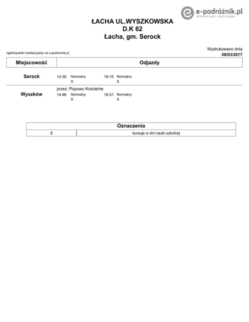 ŁACHA UL.WYSZKOWSKA D.K 62 Łacha, gm. Serock Wydrukowano dnia 08/03/2017 ogólnopolski rozkład jazdy na e-podroznik.pl Miejscowość Odjazdy Serock 14:30 Normalny S 16:15 Normalny S przez: Popowo Kościelne Wyszków 14:46 Normalny S 16:31 Normalny S Oznaczenia S kursuje w dni nauki szkolnej