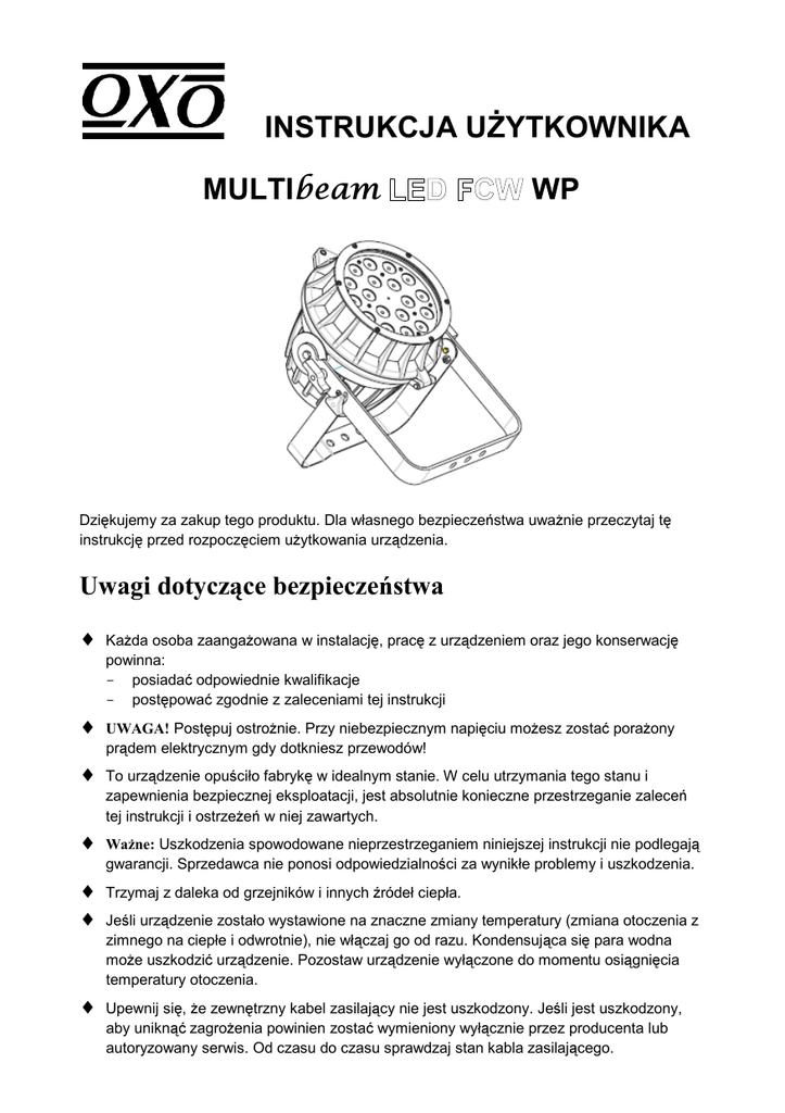 INSTRUKCJA UśYTKOWNIKA MULTIbeam WP Dziękujemy za zakup tego produktu. Dla własnego bezpieczeństwa uwaŜnie przeczytaj tę instrukcję przed rozpoczęciem uŜytkowania urządzenia. Uwagi dotyczące bezpieczeństwa ♦ ♦ ♦ ♦ ♦ ♦ ♦ KaŜda osoba zaangaŜowana w instalację, pracę z urządzeniem oraz jego konserwację powinna: - posiadać odpowiednie kwalifikacje - postępować zgodnie z zaleceniami tej instrukcji UWAGA! Postępuj ostroŜnie. Przy niebezpiecznym napięciu moŜesz zostać poraŜony prądem elektrycznym gdy dotkniesz przewodów! To urządzenie opuściło fabrykę w idealnym stanie. W celu utrzymania tego stanu i zapewnienia bezpiecznej eksploatacji, jest absolutnie konieczne przestrzeganie zaleceń tej instrukcji i ostrzeŜeń w niej zawartych. WaŜne: Uszkodzenia spowodowane nieprzestrzeganiem niniejszej instrukcji nie podlegają gwarancji. Sprzedawca nie ponosi odpowiedzialności za wynikłe problemy i uszkodzenia. Trzymaj z daleka od grzejników i innych źródeł ciepła. Jeśli urządzenie zostało wystawione na znaczne zmiany temperatury (zmiana otoczenia z zimnego na ciepłe i odwrotnie), nie włączaj go od razu. Kondensująca się para wodna moŜe uszkodzić urządzenie. Pozostaw urządzenie wyłączone do momentu osiągnięcia temperatury otoczenia. Upewnij się, Ŝe zewnętrzny kabel zasilający nie jest uszkodzony. Jeśli jest uszkodzony, aby uniknąć zagroŜenia powinien zostać wymieniony wyłącznie przez producenta lub autoryzowany serwis. Od czasu do czasu sprawdzaj stan kabla zasilającego. ♦ ♦ ♦ ♦ ♦ ♦ ♦ ♦ ♦ ♦ Nigdy nie pozwól aby kabel zasilający wszedł w kontakt z innymi kablami. Z wszystkimi kablami przyłączonymi do sieci zasilającej postępuj ze szczególną ostroŜnością. Upewnij się, Ŝe dostępne napięcie zasilające jest nie większe niŜ podano to na końcu tej instrukcji. Zawsze odłączaj urządzenie od sieci zasilającej kiedy nie jest uŜywane lub przed czyszczeniem urządzenia. Odłączając kabel zasilający chwytaj za wtyczkę. Nigdy nie wyjmuj wtyczki ciągnąc za kabel zasilający. Podczas pierwszego uruchomienia moŜe pojawić się dym lub zapach. Jest to normalny proces i nie musi oznaczać, Ŝe urządzenie jest uszkodzone. NIEBEZPIECZEŃSTWO POPARZENIA! Nigdy nie dotykaj urządzenia podczas pracy. Obudowa moŜe być gorąca. Nie włączaj i nie wyłączaj urządzenia w krótkich odstępach czasu, moŜe to skrócić jego Ŝywotność. ZAGROśENIE DLA ZDROWIA! Nigdy nie patrz bezpośrednio w źródło światła, u osób wraŜliwych moŜe wywołać to atak padaczki (szczególnie dotyczy epileptyków). Uszkodzenia spowodowane modyfikacjami urządzenia nie podlegają gwarancji. Urządzenie nie jest przeznaczone dla dzieci i amatorów. Wewnątrz urządzenia nie ma elementów wymagających konserwacji. Wszelkie naprawy mogą być wykonywane tylko przez autoryzowany serwis. Wskazówki dotyczące obsługi 1) Urządzenie moŜe być sterowane sygnałem DMX lub pracować samodzielnie. Przy sterowaniu sygnałem DMX wiele urządzeń moŜe być dołączonych do kontrolera DMX. Tryb samodzielny (stand-alone) ma kilka funkcji, takich jak dimmer, zmiana programów, reagowanie na muzykę, itd. 2) Gdy w trybie DMX lub Master/slave sygnał jest obecny, dioda LED slave miga szybko. Przy braku sygnału adres urządzenia miga. 3) Jeśli urządzenie podrzędne (slave) jest dołączone do nadrzędnego (master), a takŜe do kontrolera DMX, master automatycznie zidentyfikuje przesyłane dane i przestanie wysyłać własny program. Slave będzie odbierał sygnał z kontrolera DMX. 4) Gdy odbierany jest sygnał DMX, tryb Master/slave zmieni się na tryb DMX online (DMXmode2). Gdy sygnał DMX zostanie odłączony urządzenie wróci do trybu Master/slave. Zmiana ustawień ♦ ♦ MODE: naciskaj aby zmieniać tryby pracy UP i DOWN: naciskaj aby zmienić adres DMX, kolor, … Zapoznaj się z sekcją MENU aby poznać wszystkie moŜliwości. Wyświetlacz a. b. c. d. MODE VALUE SLAVE MASTER tryb pracy adres DMX, wartości parametrów kontrolka pracy jako urządzenie podrzędne kontrolka pracy jako urządzenie nadrzędne Menu wyświetlacz Tryb pracy Wyświetlacz włączony cały czas 0001 auto wyłączanie 0002 dimmer szybkość 1***, *** = adres DMX 2***, *** = adres DMX 30**, ** = nr koloru 40**, ** = nr programu 50**, ** = szybkość dźwięk 60**, ** = tryb 4 kanały tryb DMX 6 kanałów kolor program tryb manual kolor R kolor G kolor B kolor W -***, *** = wartość =***, *** = wartość ≡***, *** = wartość E***, *** = wartość Opis Wyświetlacz będzie się świecił cały czas Wyświetlacz wyłączy się automatycznie po upływie około 10s. Przyciski są nieaktywne. Aby włączyć wyświetlacz przytrzymaj dowolny przycisk przez 3s. 1 = R dimmer, 2 = G dimmer, 3 = B dimmer, 4 = W dimmer 1 = R dimmer, 2 = G dimmer, 3 = B dimmer, 4 = W dimmer, 5 = master dimmer, 6 = strobo Wybór jednego z 20 dostępnych kolorów. Wybór jednego z 9 programów. Zmiana szybkości wykonywanie programu (wartość 16 to największa szybkość). 1. 6001 ~ 6009 – jeden z 9 programów 2. 6ALL – programy wykonują się kolejno 4 razy Ustawianie jasności koloru czerwonego Ustawianie jasności koloru zielonego Ustawianie jasności koloru niebieskiego Ustawianie jasności koloru białego Specyfikacja techniczna Przeznaczenie do uŜytku zewnętrznego: IP65 LED 18 x RGBW 5W Kanały DMX 4 /6 kanałów (DMX mode 1 / 2) Szerokość wiązki światła około 25° Temperatura 0°C / 40°C Maksymalna temperatura 100°C Zasilanie 100 – 240V, 50 – 60Hz Pobór mocy 95W max Wymiary 365 x 333 x 296 (D x S x W) Waga 7,1kg