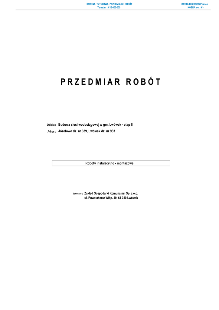 STRONA TYTUŁOWA PRZEDMIARU ROBÓT Temat nr : C15-003-0001 PRZEDMIAR ROBÓT Obiekt : Budowa sieci wodociągowej w gm. Lwówek - etap II Adres : Józefowo dz. nr 339, Lwówek dz. nr 933 Roboty instalacyjno - montażowe Inwestor : Zakład Gospodarki Komunalnej Sp. z o.o. ul. Powstańców Wlkp. 40, 64-310 Lwówek ORGBUD-SERWIS Poznań KOBRA wer. 9.3 SPIS DZIAŁÓW PRZEDMIARU Temat nr : C15-003-0001 ORGBUD-SERWIS Poznań KOBRA wer. 9.3 Roboty instalacyjno - montażowe Obiekt : Budowa sieci wodociągowej w gm. Lwówek - etap II Adres : Józefowo dz. nr 339, Lwówek dz. nr 933 SPIS DZIAŁÓW PRZEDMIARU Data : 2015-03-31 Lp. Str: 1 Opis stanu / elementu I STAN : Sieć wodociągowa I.1 ELEMENT : Roboty ziemne I.2 ELEMENT : Roboty montażowe I.3 ELEMENT : Roboty inne - - - Koniec wydruku - - - PRZEDMIAR ROBÓT Temat nr : C15-003-0001 ORGBUD-SERWIS Poznań KOBRA wer. 9.3 Roboty instalacyjno - montażowe Obiekt : Budowa sieci wodociągowej w gm. Lwówek - etap II Adres : Józefowo dz. nr 339, Lwówek dz. nr 933 Data : 2015-03-31 Lp. Podstawa kalkulacji / opis pozycji Str: 1 Ilość Jedn. miary I STAN : Sieć wodociągowa I.1 ELEMENT : Roboty ziemne 1 KNR 201-0119-03-00 IZOiEPB ORGBUD W-wa 0,981 km Roboty pomiarowe przy liniowych robotach ziemnych - trasa dróg w terenie równinnym 2 KNR 201-0217-04-00 IZOiEPB ORGBUD W-wa 1 153,660 m3 Wykopy oraz przekopy wykonywane na odkład koparkami podsiębiernymi o pojemności łyżki 0,25 m3, w gruncie kategorii: III 3 KNR 201-0317-02-00 IZOiEPB ORGBUD W-wa 23,540 m3 Wykopy ręczne liniowe o ścianach pionowych głębokości do 1,5 m, pod fundamenty, rurociągi i kolektory w gruntach suchych kat. III-IV, z wydobyciem urobku łopatą lub wyciągiem ręcznym: szer. wykopu 0,8-1,5 m 4 KNR 201-0325-01-00 IZOiEPB ORGBUD W-wa 2 943,000 m2 Umocnienie ścian wykopów liniowych o ścianach pionowych za pomocą metalowej obudowy typu boks 5 KSNR 001-0210-02-10 WACETOB Warszawa 1 153,660 m3 Zasypywanie koparką wykopów fundamentowych podłużnych, punktowych, rowów i wykopów obiektowych warstwami gruntu rodzimego grubości 40 cm, przy użyciu koparko-ładowarki 6 KNR 201-0320-02-00 IZOiEPB ORGBUD W-wa 23,540 m3 Ręczne zasypywanie wykopów liniowych oraz jamistych o ścianach pionowych 7 KNR 201-0406-01-00 IZOiEPB ORGBUD W-wa 2 943,000 m2 Zagęszczanie ziemi płytą wibracyjną warstwami co 40 cm I.2 ELEMENT : Roboty montażowe 8 KNR 218-0109-04-00 WACETOB Warszawa 981,000 m Rurociągi z rur PE dwuwarstwowych SDR 17 , PN10, łączonych metodą zgrzewania, przy średnicy zewnętrznej rur: 110 x 6,6 mm - odciniki 12 m 9 KNR 218-0111-04-10 WACETOB Warszawa 8,000 złącze Połączenie rur polietylenowych, ciśnieniowych PE, PEHD, za pomocą kształtek elektrooporowych, przy średnicy zewnętrznej rur: 110 mm /zasilanie zgrzew.agreg.prądotwórczym/ - mufa elektrooporowa 10 KNR 218-0110-04-10 WACETOB Warszawa 82,000 złącze Połączenie rur polietylenowych, ciśnieniowych PE, PEHD, metodą zgrzewania czołowego, przy średnicy zewnętrznej rur: 110 mm /zasilanie zgrzew.agreg.prądotwórczym/ 11 KNR 218-0305-02-00 IZOiEPB ORGBUD W-wa 2,000 kpl Ustawienie zasuwy miękkouszczelnianej z obudową i skrzynką uliczną - średnica zasuwy: 80 mm (zasuwy przed hydrantami) 12 KNR 218-0305-03-00 IZOiEPB ORGBUD W-wa 2,000 kpl Ustawienie zasuwy miękkouszczelnianej z obudową i skrzynką uliczną - średnica zasuwy: 100 mm 13 KNR 218-0315-01-00 IZOiEPB ORGBUD W-wa 2,000 kpl Ustawienie hydrantów pożarowych nadziemnych o średnicy: 80 mm 14 KNR 218-0312-01-00 IZOiEPB ORGBUD W-wa 1,000 szt Odpowietrzenia rurociągow sieci wodociągowych w studzienkach, o średnicy nominalnej 50 mm - studzienka powietrzna do wody PN16, DN50 - 1 szt. - mufa elektrooporowa Dw 110 mm - 2 szt., - trójnik redukcyjny 100/50 mm - 1 szt., - tuleja kołnierzowa Dw110 z kołnierzem stalowym DN100 - 2 szt. 15 KNR 218-0112-02-00 IZOiEPB ORGBUD W-wa 4,000 szt Układanie kształtek żeliwnych ciśnieniowych, kołnierzowych, przy średnicy nominalnej: 80 mm: - króciec żeliwny dwukołnierzowy L=30 cm - 2 szt., - kolano ze stopką - 2 szt. 16 KNR 218-0112-03-00 IZOiEPB ORGBUD W-wa Układanie kształtek żeliwnych ciśnieniowych, kołnierzowych, przy średnicy nominalnej: 100 mm: - trójnik - 1 szt., - trójnik redukcyjny 100/80 mm - 2 szt., - łuk dwukołnierzowy 30 st. - 1 szt., - tuleja kołnierzowa DN110 z kołnierzem stalowym DN100 - 8 kpl 32,000 szt PRZEDMIAR ROBÓT Temat nr : C15-003-0001 ORGBUD-SERWIS Poznań KOBRA wer. 9.3 Roboty instalacyjno - montażowe STAN : I. Sieć wodociągowa ELEMENT : I.2. Roboty montażowe Data : 2015-03-31 Lp. Str: 2 Podstawa kalkulacji / opis pozycji 17 KNR 228-0209-03-00 MRiGŻ Ilość Jedn. miary 1,000 szt Analogia - Montaż filtra siatkowego, o średnicy nominalnej: 100 mm 18 KNR 228-0209-03-00 MRiGŻ 1,000 szt Analogia - Montaż zaworu redukcyjnego - regulator ciśnienia o średnicy nominalnej: 100 mm 19 KNR 218-0802-02-20 IZOiEPB ORGBUD W-wa 5,000 próba Próba szczelności sieci wodociągowych z rur PE (długość próbnego odcinka rurociągu - 200 m), o średnicy nominalnej do: 150 mm 20 KNR 218-0803-01-00 IZOiEPB ORGBUD W-wa 5,000 200 m Dezynfekcja rurociągów sieci wodociągowych, przy średnicy nominalnej rur: do 150 mm 21 KNNR 004-1612-01-00 MRRiB 5,000 200 m Jednokrotne płukanie sieci wodociągowych, przy średnicy nominalnej rur: do 150 mm 22 KNR 218-0609-01-00 IZOiEPB ORGBUD W-wa 0,660 m3 Ręczne układanie mieszanki betonowej: bloki oporowe 23 KNR 219-0219-01-00 IZOiEPB ORGBUD W-wa 981,000 m Oznakowanie taśmą z tworzywa sztucznego trasy wodociągu ułożonego w ziemi 24 KNR 219-0134-02-00 IZOiEPB ORGBUD W-wa 3,000 kpl Oznakowanie hydrantów i zasuw tabliczkami 25 KNR 218-0513-03-00 WACETOB Warszawa 1,000 studnia Ustawienie studni rewizyjnej z kręgów betonowych z uszczelką, w gotowym wykopie, o głębokości 3,0 m - średnica kręgów: 1200 mm z włazem typu D400 z wypełniniem betonowym - studnia dla zaworu redukcyjnego i filtra siatkowego I.3 ELEMENT : Robo