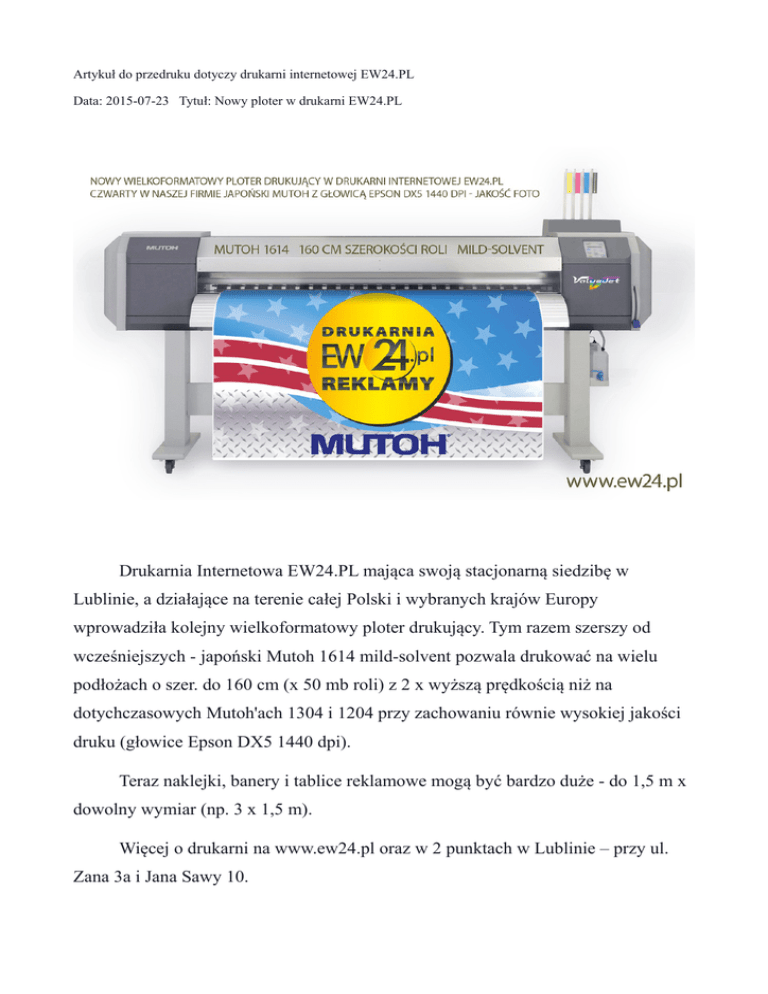 Artykuł do przedruku dotyczy drukarni internetowej EW24.PL Data: 2015-07-23 Tytuł: Nowy ploter w drukarni EW24.PL Drukarnia Internetowa EW24.PL mająca swoją stacjonarną siedzibę w Lublinie, a działające na terenie całej Polski i wybranych krajów Europy wprowadziła kolejny wielkoformatowy ploter drukujący. Tym razem szerszy od wcześniejszych - japoński Mutoh 1614 mild-solvent pozwala drukować na wielu podłożach o szer. do 160 cm (x 50 mb roli) z 2 x wyższą prędkością niż na dotychczasowych Mutoh'ach 1304 i 1204 przy zachowaniu równie wysokiej jakości druku (głowice Epson DX5 1440 dpi). Teraz naklejki, banery i tablice reklamowe mogą być bardzo duże - do 1,5 m x dowolny wymiar (np. 3 x 1,5 m). Więcej o drukarni na www.ew24.pl oraz w 2 punktach w Lublinie – przy ul. Zana 3a i Jana Sawy 10.