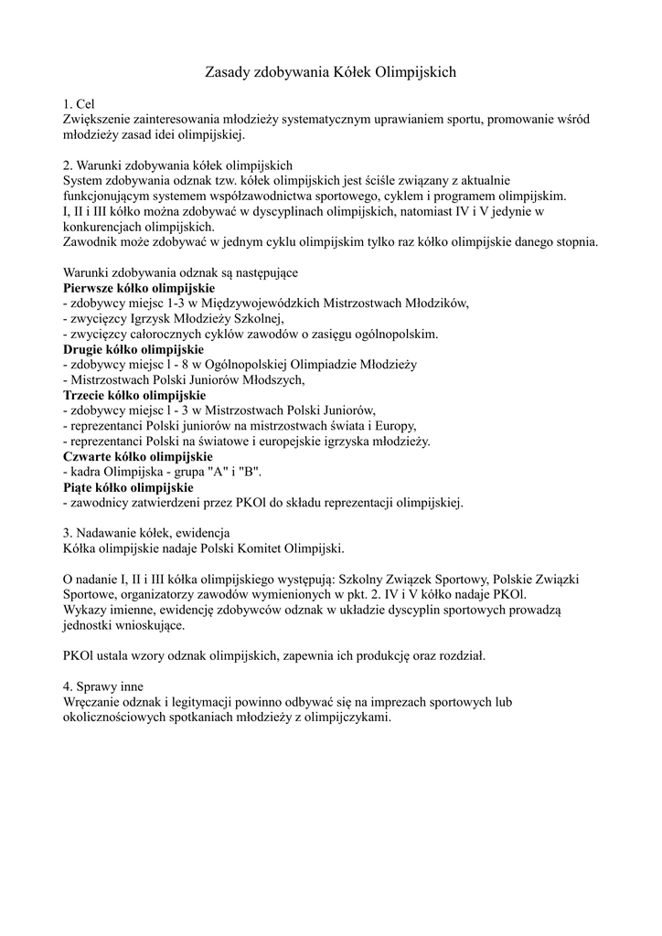 Zasady zdobywania Kółek Olimpijskich 1. Cel Zwiększenie zainteresowania młodzieży systematycznym uprawianiem sportu, promowanie wśród młodzieży zasad idei olimpijskiej. 2. Warunki zdobywania kółek olimpijskich System zdobywania odznak tzw. kółek olimpijskich jest ściśle związany z aktualnie funkcjonującym systemem współzawodnictwa sportowego, cyklem i programem olimpijskim. I, II i III kółko można zdobywać w dyscyplinach olimpijskich, natomiast IV i V jedynie w konkurencjach olimpijskich. Zawodnik może zdobywać w jednym cyklu olimpijskim tylko raz kółko olimpijskie danego stopnia. Warunki zdobywania odznak są następujące Pierwsze kółko olimpijskie - zdobywcy miejsc 1-3 w Międzywojewódzkich Mistrzostwach Młodzików, - zwycięzcy Igrzysk Młodzieży Szkolnej, - zwycięzcy całorocznych cyklów zawodów o zasięgu ogólnopolskim. Drugie kółko olimpijskie - zdobywcy miejsc l - 8 w Ogólnopolskiej Olimpiadzie Młodzieży - Mistrzostwach Polski Juniorów Młodszych, Trzecie kółko olimpijskie - zdobywcy miejsc l - 3 w Mistrzostwach Polski Juniorów, - reprezentanci Polski juniorów na mistrzostwach świata i Europy, - reprezentanci Polski na światowe i europejskie igrzyska młodzieży. Czwarte kółko olimpijskie - kadra Olimpijska - grupa "A" i "B". Piąte kółko olimpijskie - zawodnicy zatwierdzeni przez PKOl do składu reprezentacji olimpijskiej. 3. Nadawanie kółek, ewidencja Kółka olimpijskie nadaje Polski Komitet Olimpijski. O nadanie I, II i III kółka olimpijskiego występują: Szkolny Związek Sportowy, Polskie Związki Sportowe, organizatorzy zawodów wymienionych w pkt. 2. IV i V kółko nadaje PKOl. Wykazy imienne, ewidencję zdobywców odznak w układzie dyscyplin sportowych prowadzą jednostki wnioskujące. PKOl ustala wzory odznak olimpijskich, zapewnia ich produkcję oraz rozdział. 4. Sprawy inne Wręczanie odznak i legitymacji powinno odbywać się na imprezach sportowych lub okolicznościowych spotkaniach młodzieży z olimpijczykami.