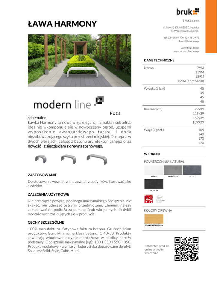 ŁAWA HARMONY BRUK Sp. z o.o. ul. Nowa 28G, 44-352 Czyzowice (k. Wodzislawia Slaskiego) tel. 32 456 09 70 / 32 456 09 71 [email protected] www.bruk.info.pl www.modernline.info.pl DANE TECHNICZNE Nazwa 79M 119M 159M 159M (z drewnem) Wysokość (cm) Poza schematem. Ławka Harmony to nowa wizja elegancji. Smukła i subtelna, idealnie wkomponuje się w nowoczesny ogród, uzupełni wyposażenie awangardowego tarasu i doda niezobowiązującego szyku przestrzeni miejskiej. Dostępna w dwóch wersjach: całość z betonu architektonicznego oraz nowość - z siedziskiem z drewna sosnowego. 45 45 45 45 79x39 119x39 159x39 159X39 Rozmiar (cm) 105 140 170 120 Waga (kg/szt.) WZORNIK POWIERZCHNIA NATURAL ZASTOSOWANIE WHITE CONCRETE Do stosowania wewnątrz i na zewnątrz budynków. Stosować jako siedzisko. CARBON ZALECENIA UŻYTKOWE Nie przeciążać powyżej podanego maksymalnego obciążenia, nie skakać, nie uderzać ostrymi przedmiotami. Element należy zamocować do podłoża za pomocą śrub wkręcanych do dybli montażowych znajdujących się w produkcie. CECHY SZCZEGÓLNE 100% manufaktura. Satynowa faktura betonu. Grubość ścian produktów: 8cm. Minimalna klasa betonu: C 40/50. Produkty zawierają wbudowane dyble montażowe w okolicy naroży podstawy. Obciążenie maksymalne [kg]: 180 I 350 l 550 I 350. Produkt modułowy - wymiary i kolorystyka dopasowane do płyt: Solid, ecoSolid, Style, Cube, Multi. KOLORY DREWNA SOSNA NATURALNA Zobacz ten produkt online w swoim smartfonie STEEL