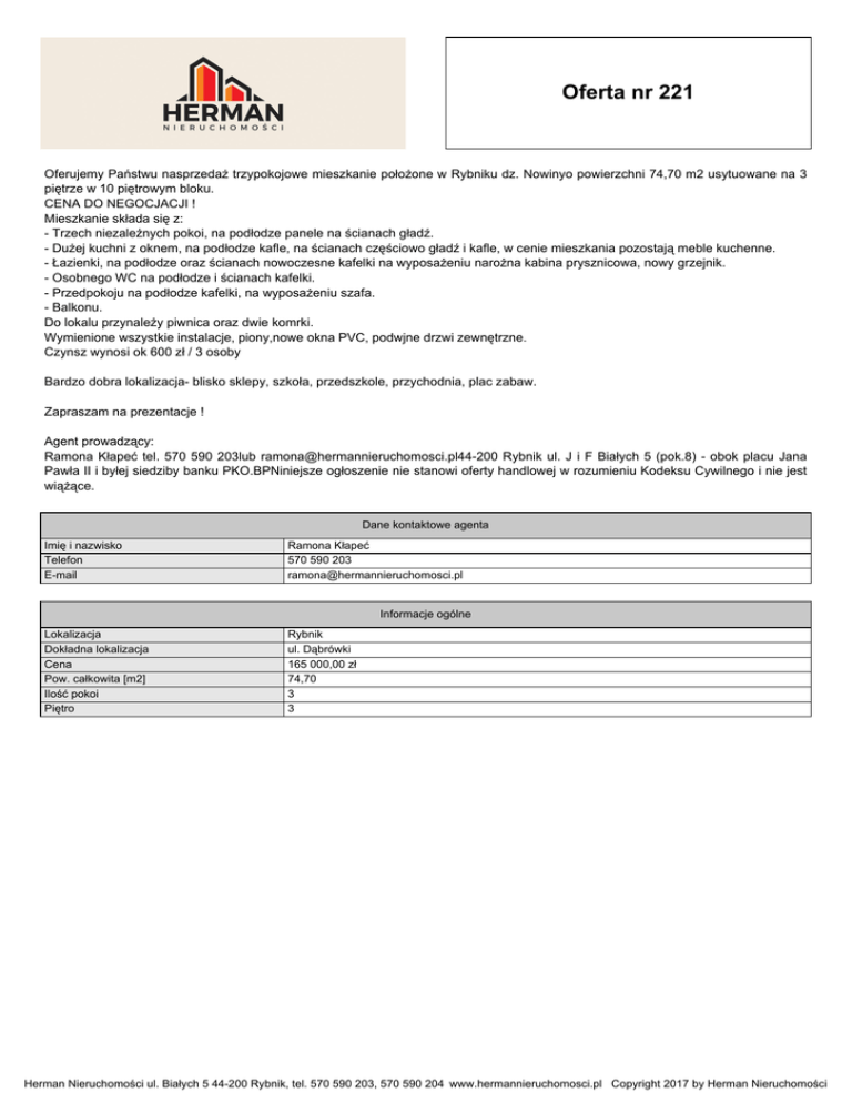 Oferta nr 221 Oferujemy Państwu nasprzedaż trzypokojowe mieszkanie położone w Rybniku dz. Nowinyo powierzchni 74,70 m2 usytuowane na 3 piętrze w 10 piętrowym bloku. CENA DO NEGOCJACJI ! Mieszkanie składa się z: - Trzech niezależnych pokoi, na podłodze panele na ścianach gładź. - Dużej kuchni z oknem, na podłodze kafle, na ścianach częściowo gładź i kafle, w cenie mieszkania pozostają meble kuchenne. - Łazienki, na podłodze oraz ścianach nowoczesne kafelki na wyposażeniu narożna kabina prysznicowa, nowy grzejnik. - Osobnego WC na podłodze i ścianach kafelki. - Przedpokoju na podłodze kafelki, na wyposażeniu szafa. - Balkonu. Do lokalu przynależy piwnica oraz dwie komrki. Wymienione wszystkie instalacje, piony,nowe okna PVC, podwjne drzwi zewnętrzne. Czynsz wynosi ok 600 zł / 3 osoby Bardzo dobra lokalizacja- blisko sklepy, szkoła, przedszkole, przychodnia, plac zabaw. Zapraszam na prezentacje ! Agent prowadzący: Ramona Kłapeć tel. 570 590 203lub [email protected] Rybnik ul. J i F Białych 5 (pok.8) - obok placu Jana Pawła II i byłej siedziby banku PKO.BPNiniejsze ogłoszenie nie stanowi oferty handlowej w rozumieniu Kodeksu Cywilnego i nie jest wiążące. Dane kontaktowe agenta Imię i nazwisko Telefon E-mail Ramona Kłapeć 570 590 203 [email protected] Informacje ogólne Lokalizacja Dokładna lokalizacja Cena Pow. całkowita [m2] Ilość pokoi Piętro Rybnik ul. Dąbrówki 165 000,00 zł 74,70 3 3 Herman Nieruchomości ul. Białych 5 44-200 Rybnik, tel. 570 590 203, 570 590 204 www.hermannieruchomosci.pl Copyright 2017 by Herman Nieruchomości