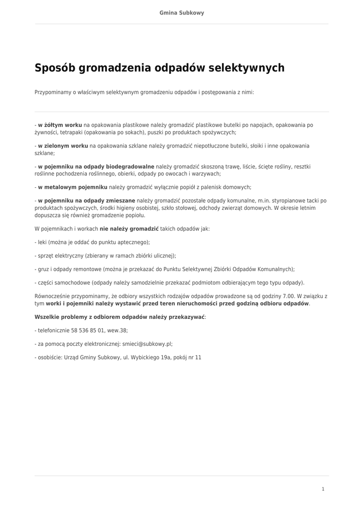 Gmina Subkowy Sposób gromadzenia odpadów selektywnych Przypominamy o właściwym selektywnym gromadzeniu odpadów i postępowania z nimi: - w żółtym worku na opakowania plastikowe należy gromadzić plastikowe butelki po napojach, opakowania po żywności, tetrapaki (opakowania po sokach), puszki po produktach spożywczych; - w zielonym worku na opakowania szklane należy gromadzić niepotłuczone butelki, słoiki i inne opakowania szklane; - w pojemniku na odpady biodegradowalne należy gromadzić skoszoną trawę, liście, ścięte rośliny, resztki roślinne pochodzenia roślinnego, obierki, odpady po owocach i warzywach; - w metalowym pojemniku należy gromadzić wyłącznie popiół z palenisk domowych; - w pojemniku na odpady zmieszane należy gromadzić pozostałe odpady komunalne, m.in. styropianowe tacki po produktach spożywczych, środki higieny osobistej, szkło stołowej, odchody zwierząt domowych. W okresie letnim dopuszcza się również gromadzenie popiołu. W pojemnikach i workach nie należy gromadzić takich odpadów jak: - leki (można je oddać do punktu aptecznego); - sprzęt elektryczny (zbierany w ramach zbiórki ulicznej); - gruz i odpady remontowe (można je przekazać do Punktu Selektywnej Zbiórki Odpadów Komunalnych); - części samochodowe (odpady należy samodzielnie przekazać podmiotom odbierającym tego typu odpady). Równocześnie przypominamy, że odbiory wszystkich rodzajów odpadów prowadzone są od godziny 7.00. W związku z tym worki i pojemniki należy wystawić przed teren nieruchomości przed godziną odbioru odpadów. Wszelkie problemy z odbiorem odpadów należy przekazywać: - telefonicznie 58 536 85 01, wew.38; - za pomocą poczty elektronicznej: [email protected]; - osobiście: Urząd Gminy Subkowy, ul. Wybickiego 19a, pokój nr 11 1