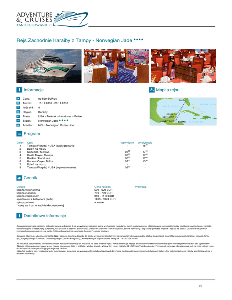 Rejs Zachodnie Karaiby z Tampy - Norwegian Jade Informacje Cena: od 599 EUR/os Termin: 13.11.2016 - 20.11.2016 Ilość dni: 8 Region: Karaiby Trasa: USA > Meksyk > Honduras > Belize Statek: Norwegian Jade Armator: NCL - Norwegian Cruise Line Mapka rejsu Program Dzień 1 2 3 4 5 6 7 8 Opis Tampa (Floryda) / USA (zaokrętowanie) Dzień na morzu Cozumel / Meksyk Costa Maya / Meksyk Roatan / Honduras Harvest Caye / Belize Dzień na morzu Tampa (Floryda) / USA (wyokrętowanie) Wpłynięcie 0800 0800 0800 0700 0800 Wypłynięcie 1600 1700 1700 1700 1300 - Cennik Usługa kabina wewnętrzna kabina z oknem kabina z balkonem apartament z balkonem (suite) opłaty portowe * ceny za 1 os. w kabinie dwuosobowej Cena katalog. 599 - 629 EUR 749 - 799 EUR 989 - 1119 EUR 1269 - 6949 EUR w cenie Promocja Dodatkowe informacje Cena obejmuje: rejs statkiem, zakwaterowanie w kabinie 2 os. w wybranej kategorii, pełne wyżywienie (śniadanie, lunch, podwieczorek, obiadokolację, przekąski między posiłkami) napoje kawa, herbata, woda dostępne w restauracji bufetowej, korzystanie z basenu, siłowni oraz urządzeń sportowo – rekreacyjnych, serwis kabinowy i bagażowy podczas wejścia i zejścia ze statku, udział we wszystkich imprezach organizowanych na statku (widowiska w teatrze, animacje, koncerty), opłaty portowe Cena nie obejmuje: ubezpieczenia KL, NW i bagażu, kosztów dojazdu do portu, wycieczek fakultatywnych zamawianych na pokładzie statku, korzystania z punktów usługowych (pralnia, fotograf, SPA itp.),Turystycznego Funduszu Gwarancyjnego (2,90 EUR/rejs/os.),Obowiązkowych napiwków dla załogi ok. 12 USD/os./dzień. All Inclusive (opcjonalnie) Istnieje możliwość wykupienia formuły all inclusive na czas trwania rejsu. Pakiet obejmuje napoje alkoholowe i bezalkoholowe dostępne we wszystkich barach bez ograniczeń (Napoje objęte pakietem: piwo, wino, napoje gazowane, likiery, koktajle, wódka, koniak, whisky itp.) Koszt pakietu 64 USD/dzień/osoba dorosła. Formuła all inclusive obowiązkowa jest na czas całego rejsu dla wszystkich osób podróżujących w jednej kabinie. UWAGA: podane ceny mają charakter orientacyjny, zmieniają się w zależności od obowiązujących taryf oraz dostępności poszczególnych kategorii kabin. Aby potwierdzić cenę należy skontaktować się z działem rezerwacji. 1/1 Powered by TCPDF (www.tcpdf.org)
