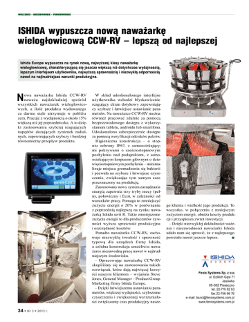 WAZENIE n DOZOWANIE n PAKOWANIE ISHIDA wypuszcza nową naważarkę wielogłowicową CCW-RV – lepszą od najlepszej Ishida Europe wypuszcza na rynek nową, najwyższej klasy naważarkę wielogłowicową, charakteryzującą się jeszcze większą niż dotychczas wydajnością, lepszym interfejsem użytkownika, najwyższą sprawnością i niezwykłą odpornością nawet na najtrudniejsze warunki produkcyjne. N owa naważarka Ishida CCW-RV naważa najdokładniej spośród wszystkich naważarek wielogłowicowych, a ilość produktu wydawanego za darmo stale utrzymuje w pobliżu zera. Pracuje z wydajnością o około 15% większą niż jej poprzedniczka. A to dzięki zastosowaniu szybciej reagujących napędów dozujących rynienek radialnych, zapewniających szybszy i bardziej równomierny przepływ produktu. 34 l Nr 3 l 2013 r. W skład udoskonalonego interfejsu użytkownika wchodzi błyskawicznie reagujący ekran dotykowy zapewniający szybsze i łatwiejsze ustawianie parametrów. Na naważarce CCW-RV można również pracować zdalnie za pomocą bezprzewodowego dostępu z wykorzystaniem tabletu, androidu lub smartfonu. Udoskonalono zabezpieczenie dostępu za pomocą weryfikacji odcisków palców. Higieniczna konstrukcja – o stopniu ochrony IP67, z samoociekającymi pokrywami o sześciostopniowym pochyleniu nad podajnikiem, z samoociekającym korpusem głównym o dziewięciostopniowym pochyleniu – minimalizuje miejsca gromadzenia się bakterii i pozwala na szybsze i łatwiejsze czyszczenie, zwiększając tym samym czas przeznaczony na produkcję. Zastosowany nowy system zarządzania energią zapewnia trzy tryby mocy (pełny, połowiczny i Eco), w zależności od warunków pracy. Pomaga to zmniejszyć zużycie energii o 20% w porównaniu z poprzednią najlepszą na rynku naważarką Ishida serii R. Takie zmniejszenie zużycia energii to dla producentów żywności wyższa sprawność produkcyjna i oszczędność kosztów. Ponadto naważarka CCW-RV, zachowuje niezwykłą trwałość i sprawność typową dla urządzeń firmy Ishida, a solidna konstrukcja umożliwia naważarce niezawodną pracę nawet w najtrudniejszym środowisku. – Opracowując naważarkę CCW-RV skupiliśmy się na zastosowaniu takich rozwiązań, które dają najwięcej korzyści naszym klientom – wyjaśnia Steve Jones, General Manager – Product Group Marketing firmy Ishida Europe. – Dzięki łatwiejszemu ustawianiu parametrów, większej wydajności, szybszemu czyszczeniu i zwiększonej wytrzymałości zwiększamy czas produkcyjny nasze- go klienta i wielkość jego produkcji. To wszystko, w połączeniu z mniejszym zużyciem energii, obniża koszty produkcji i przyspiesza zwrot inwestycji. – Dzięki niezwykłej dokładności ważenia i niezawodności naważarki Ishida udało nam się sprawić, że z najlepszego powstało nawet jeszcze lepsze. n Fenix Systems Sp. z o.o. ul. Dzikich Gęsi 71 Jesówka 05-502 Piaseczno tel. 22-715 52 53 fax 22-756 56 76 e-mail: [email protected] www.fenixsystems.com.pl